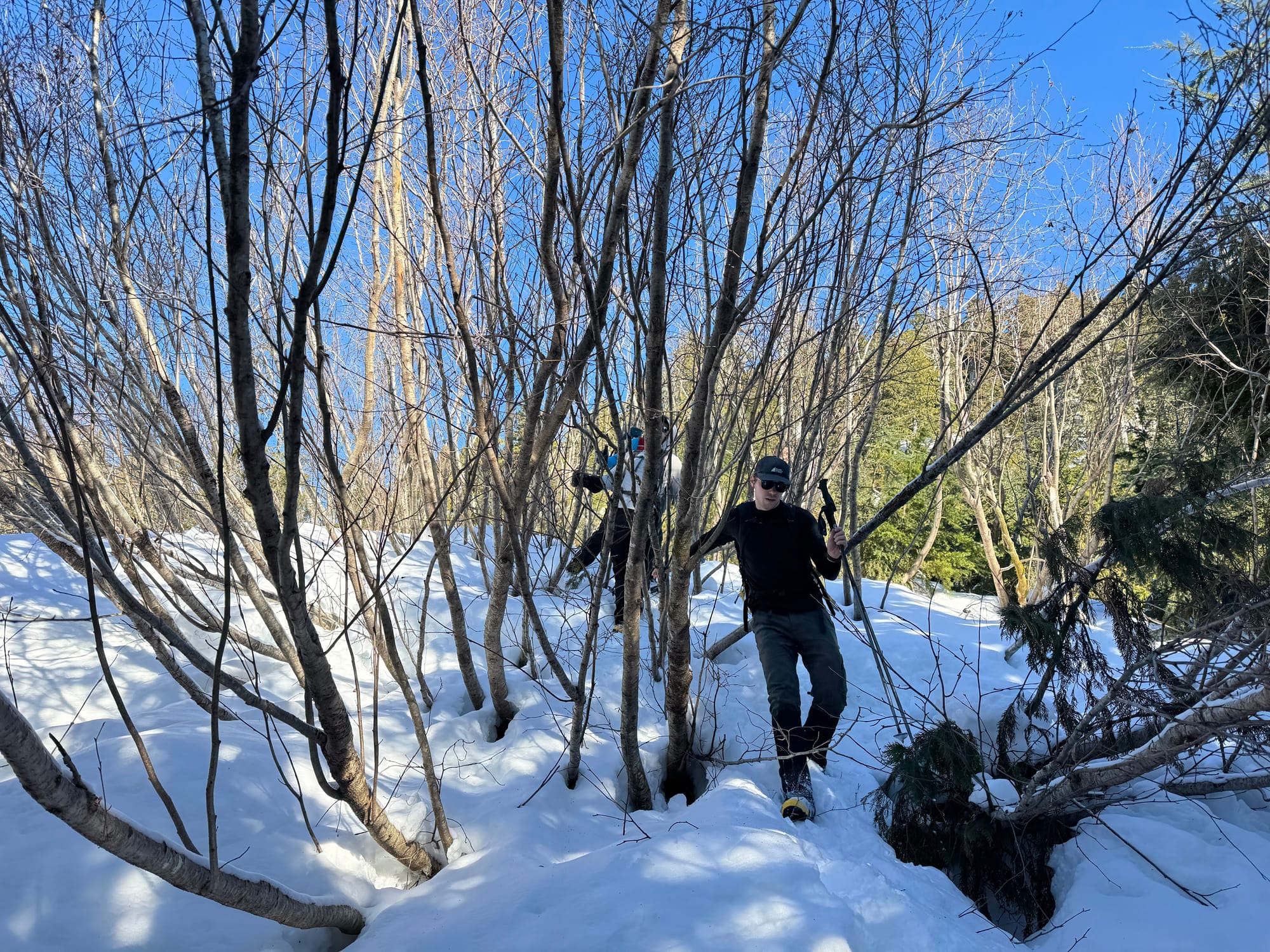 This branch faded out, and we climbed up the side of a hill through a cut block. There wasn't quite enough snow to cover the cut block and some postholing happened.