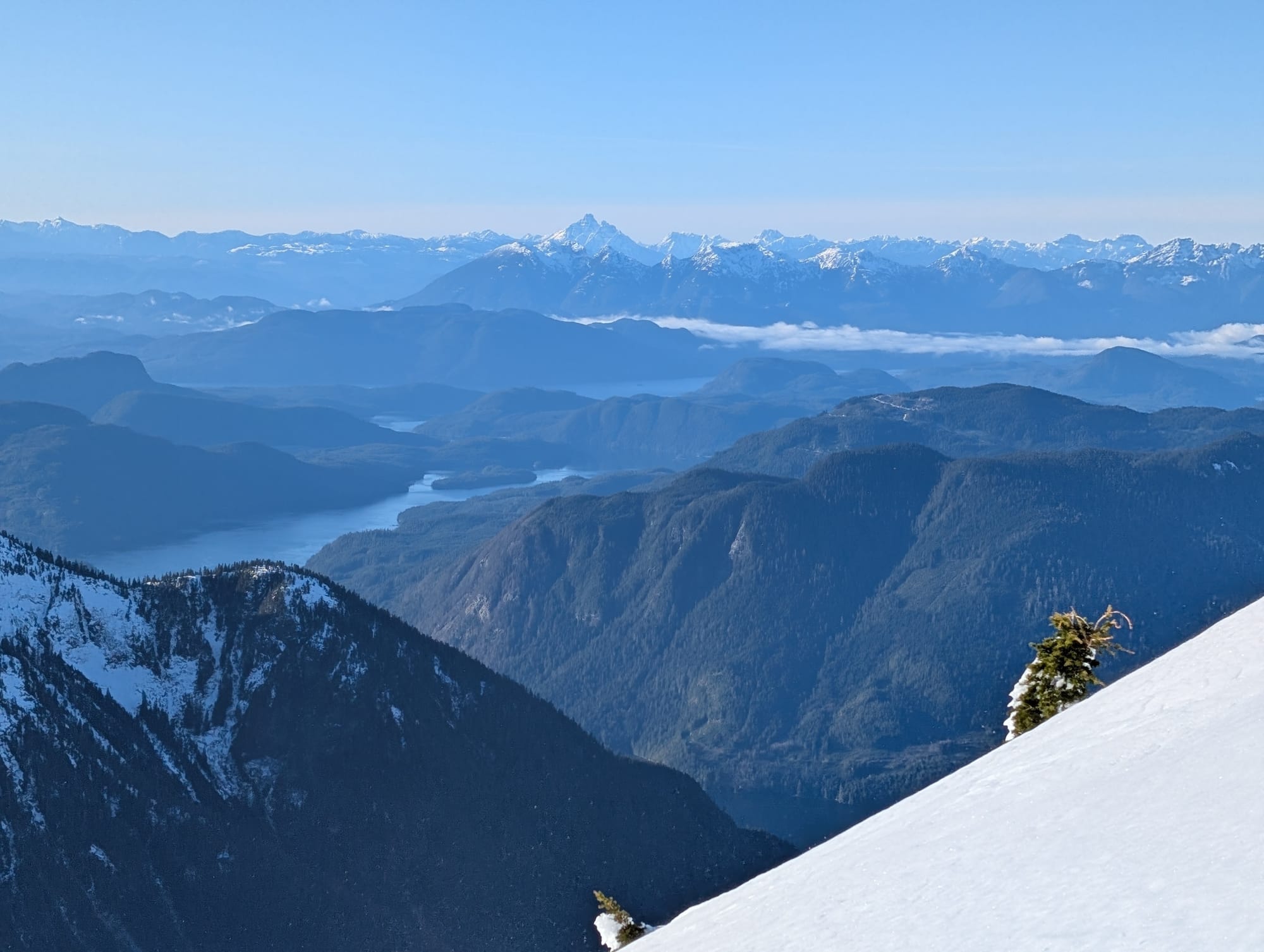 Eventually there was no more snow to ascend. I arrived at the summit and admired the incredible panorama around me. To the north were many, many extremely remote Coast Range Mountains, including Waddington. The jagged peaks of northern Vancouver Island, like Victoria and the Golden Hinde, loomed above a maze of islands and channels. Estero Peak dominated the view to the east. None of the off-island peaks were recognizable. We had brought ourselves to a truly remote place.