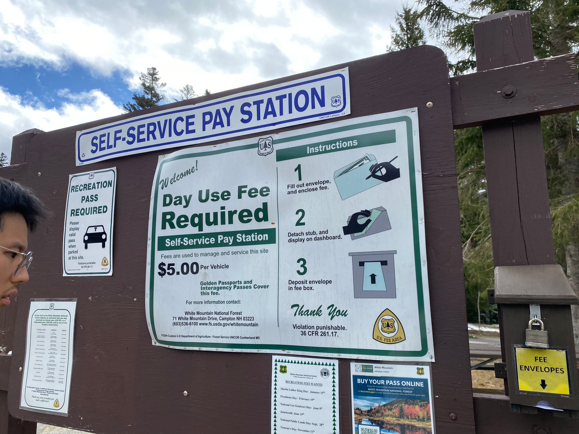 After crossing the border (legally), we drove for a couple more hours to reach the trailhead. We decided to take the Ammonoosuc Ravine Trail up and the Jewell Trail down. Both of these trails climb the mountain from its west side. We had heard that parking on that side was $10 USD per person at the railway base station’s parking lot, so we brought lots of $10 USD bills, but there’s actually a cheaper parking lot about 1km down the road operated by White Mountain National Forest, where parking is $5/vehicle, payable there. We only had $10 bills so we ended up leaving them a generous tip. Bring a pen to write your details on the envelope.