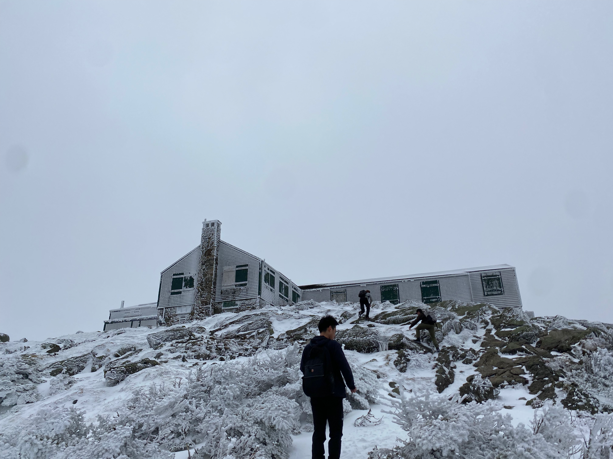 The path ascends the western slope of the mountain, then forks; we took the right fork to reach the summit. At the last second the buildings on the peak loomed out of the clouds. We took the obligatory group photo then huddled behind a wall to eat lunch. The windchill was below -20° C so we didn’t stay long.