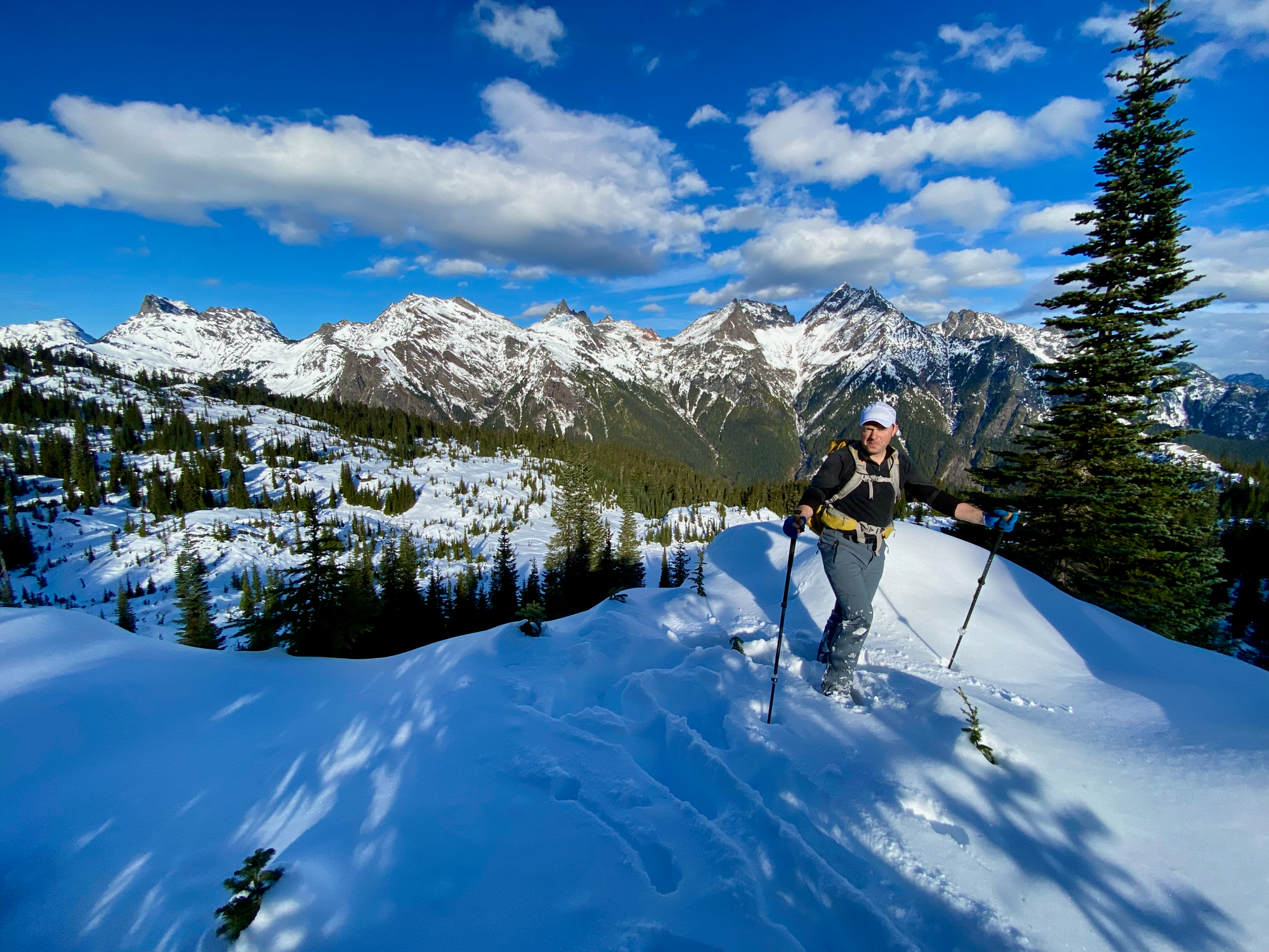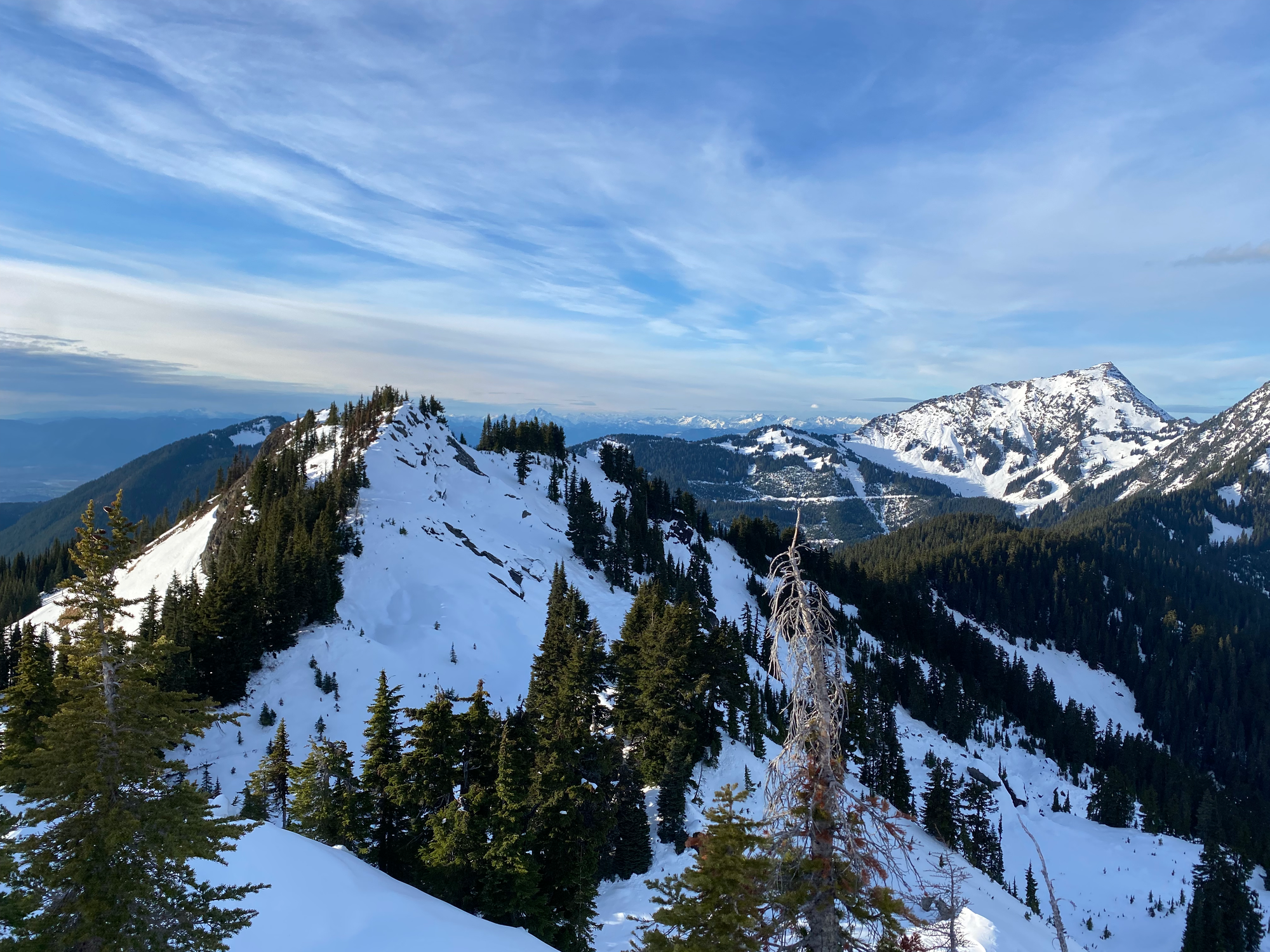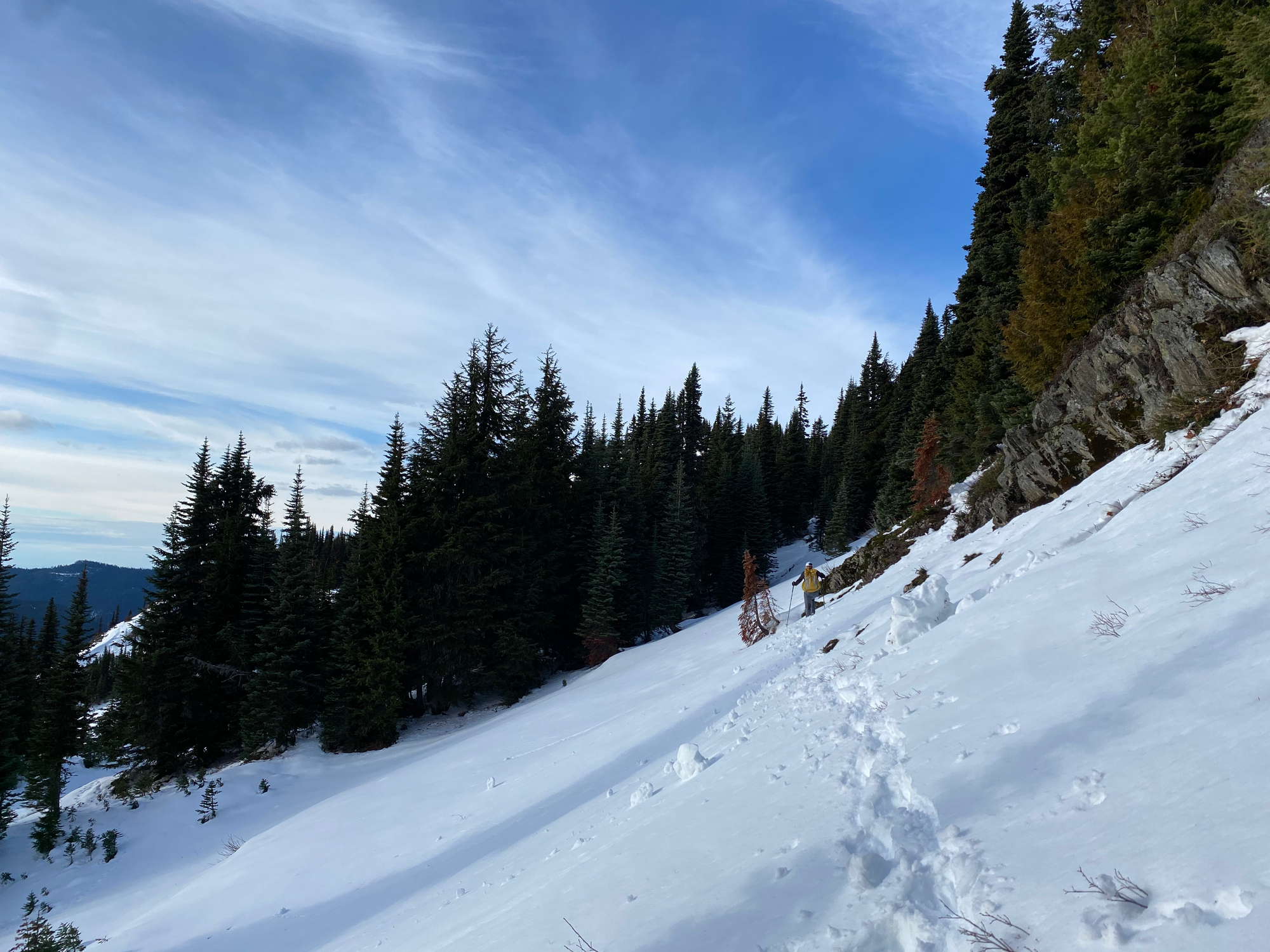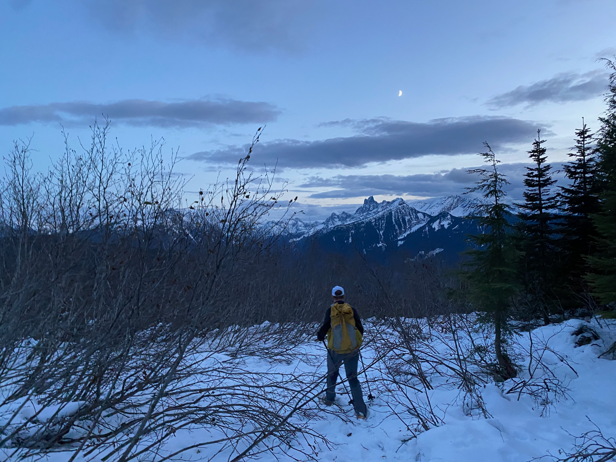 The first few kilometres were uneventful as we plodded up the logging road as it switchbacked. In hindsight a bike would have been useful. Snow started at 1100m so we put our snowshoes on.