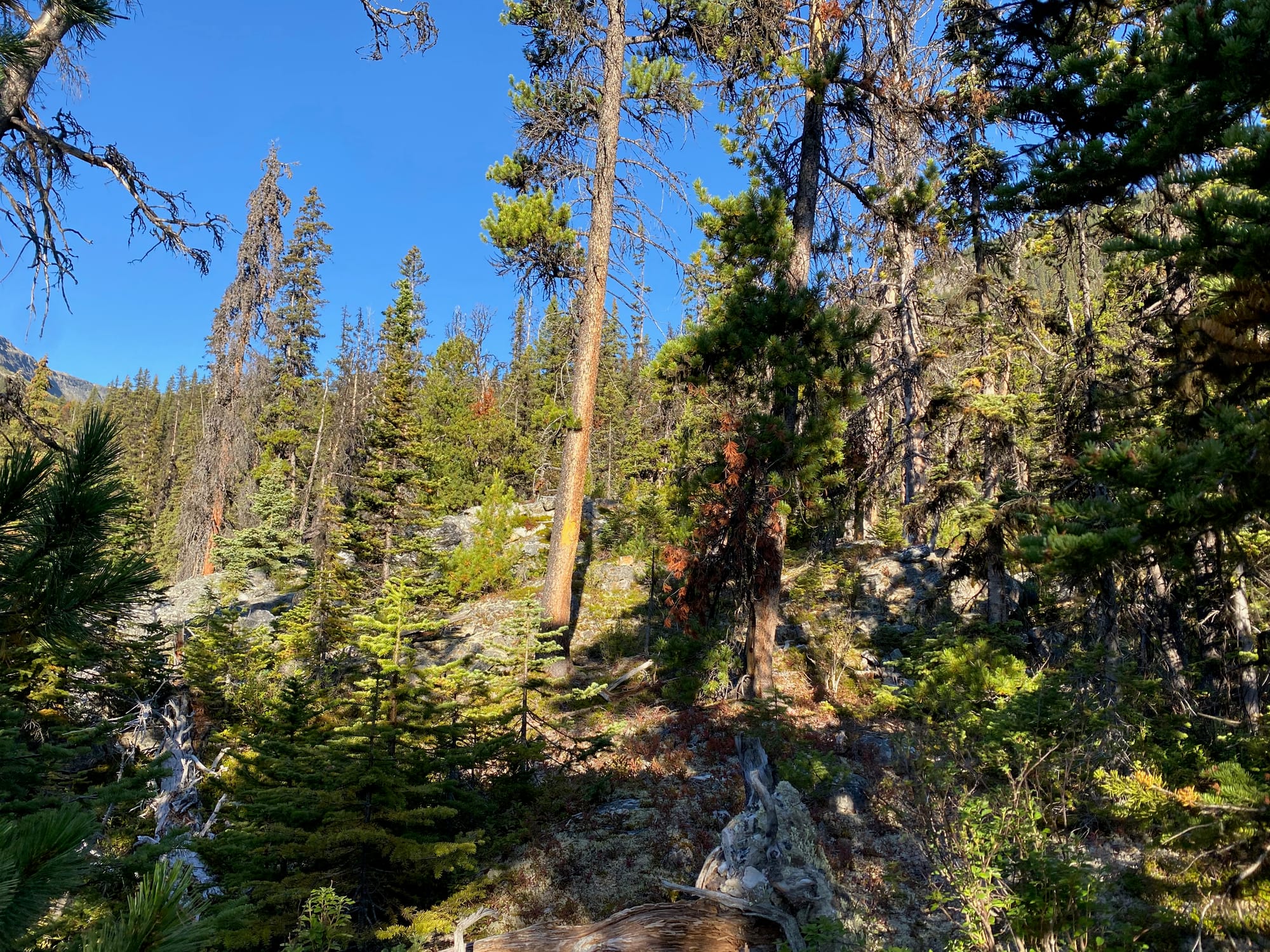 I left the Great Divide Trail about 1km north of the Carcajou river, heading west into the forest. In retrospect it would’ve been more efficient to leave the trail a few hundred metres further south. The first kilometre or so involved the standard Rockies bushwhacking, easier than what I'm used to on the coast.