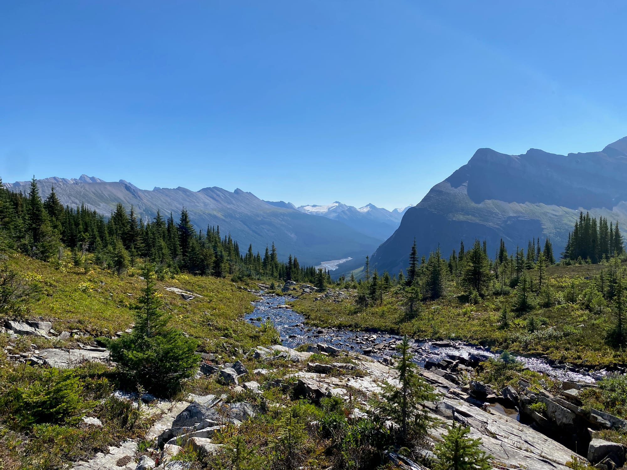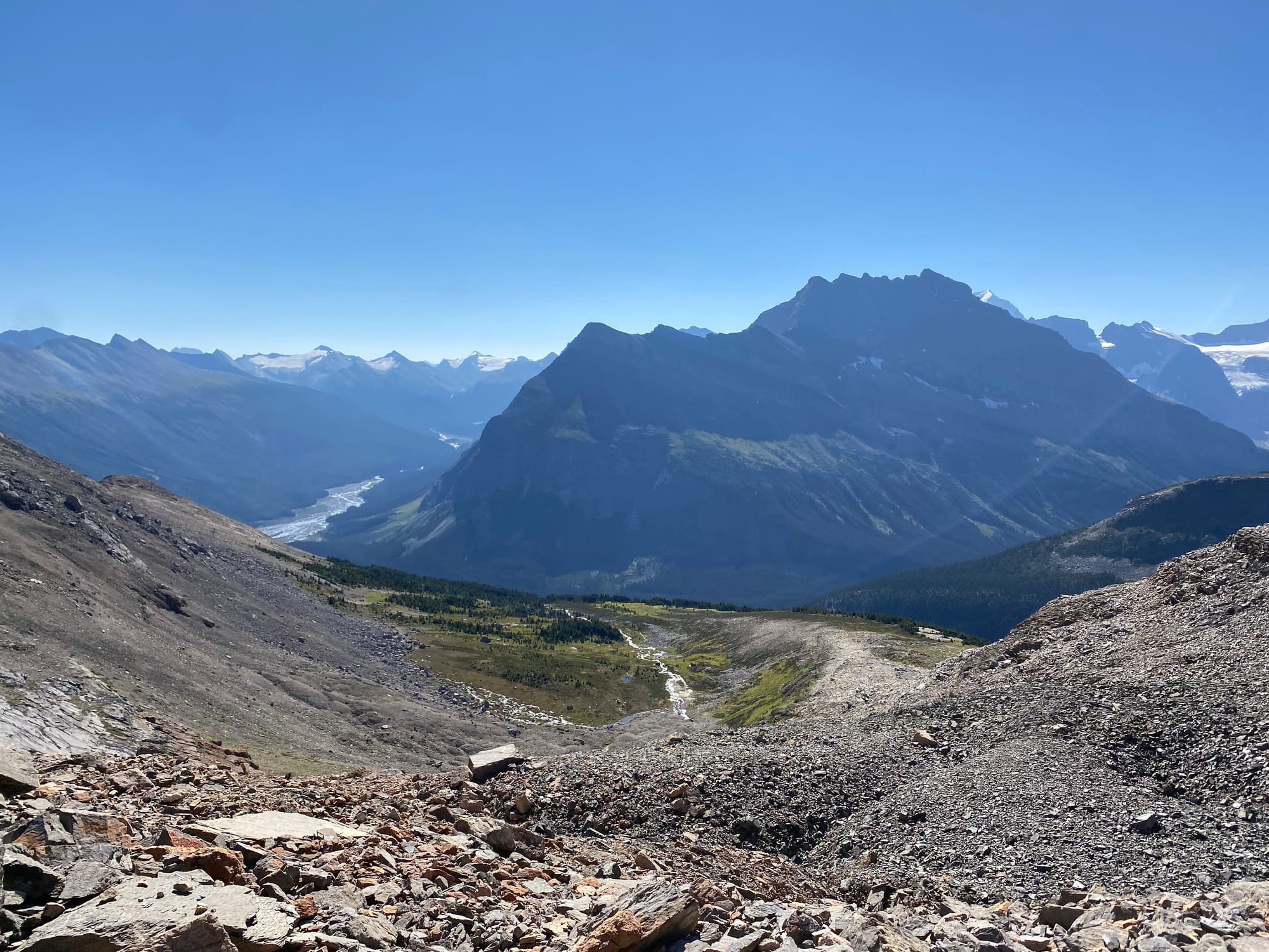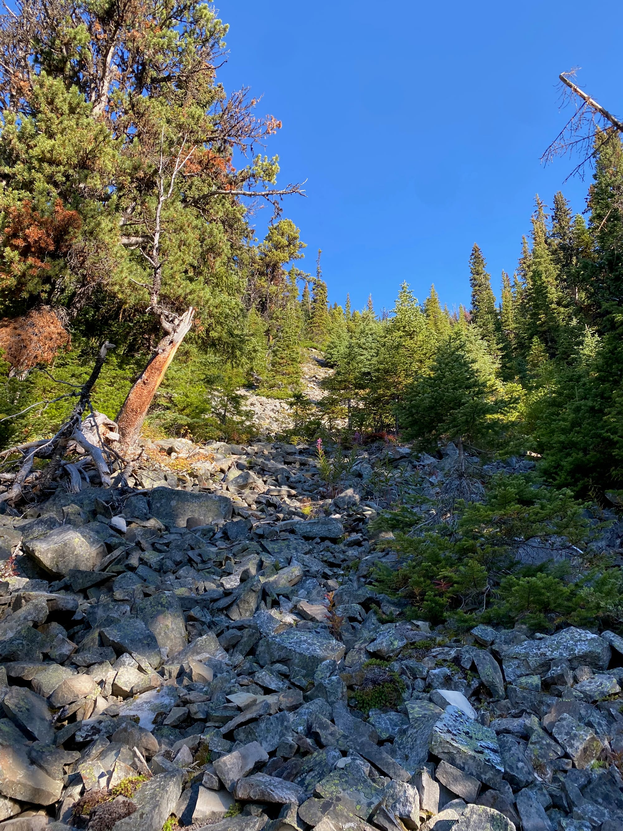 Eventually I started ascending the northern side of the valley. This got steeper and steeper. Around 1750m I reached a boulder field which made travel faster. Near the top of the boulder field I started getting brief views of the Smoky River, already far below me.