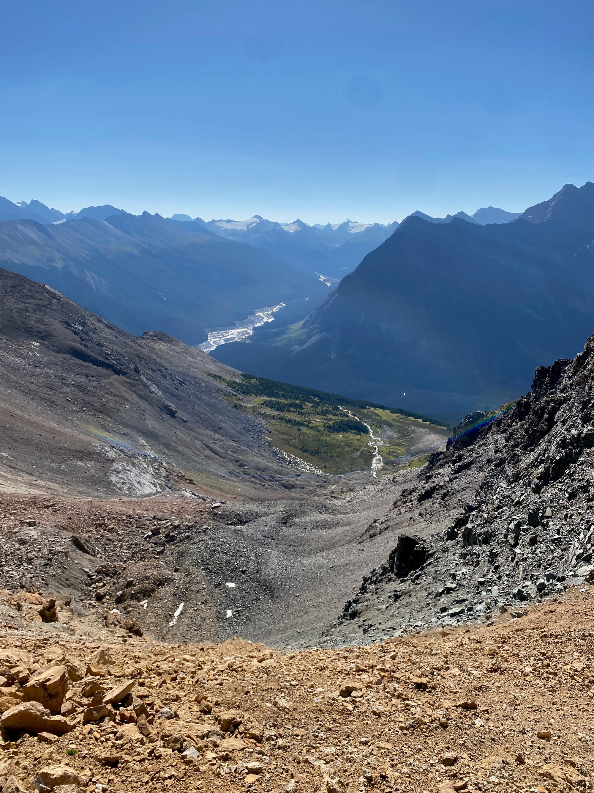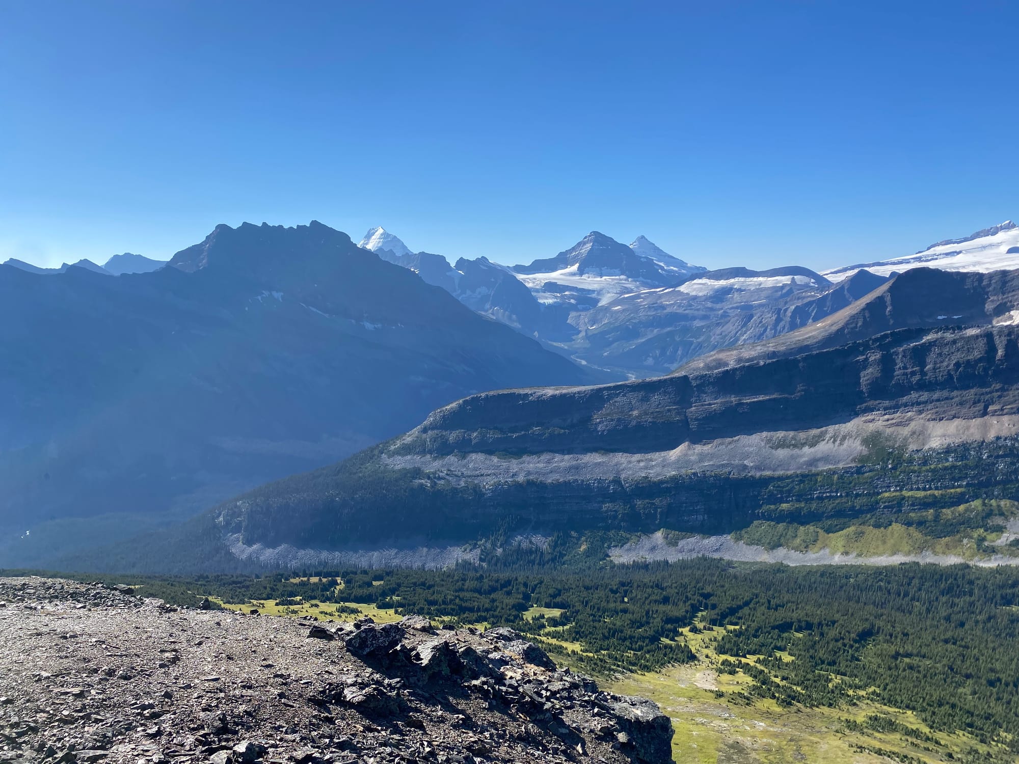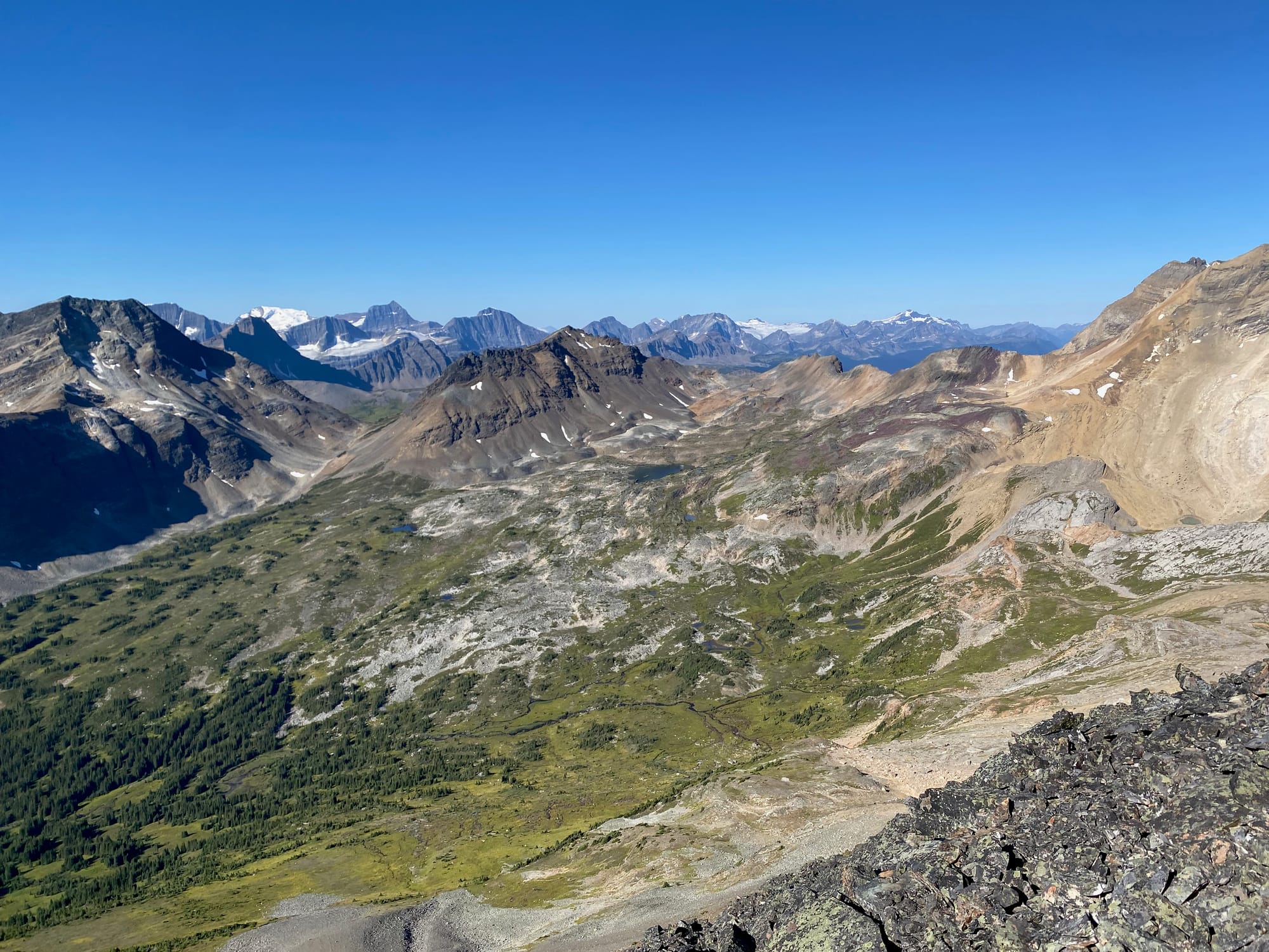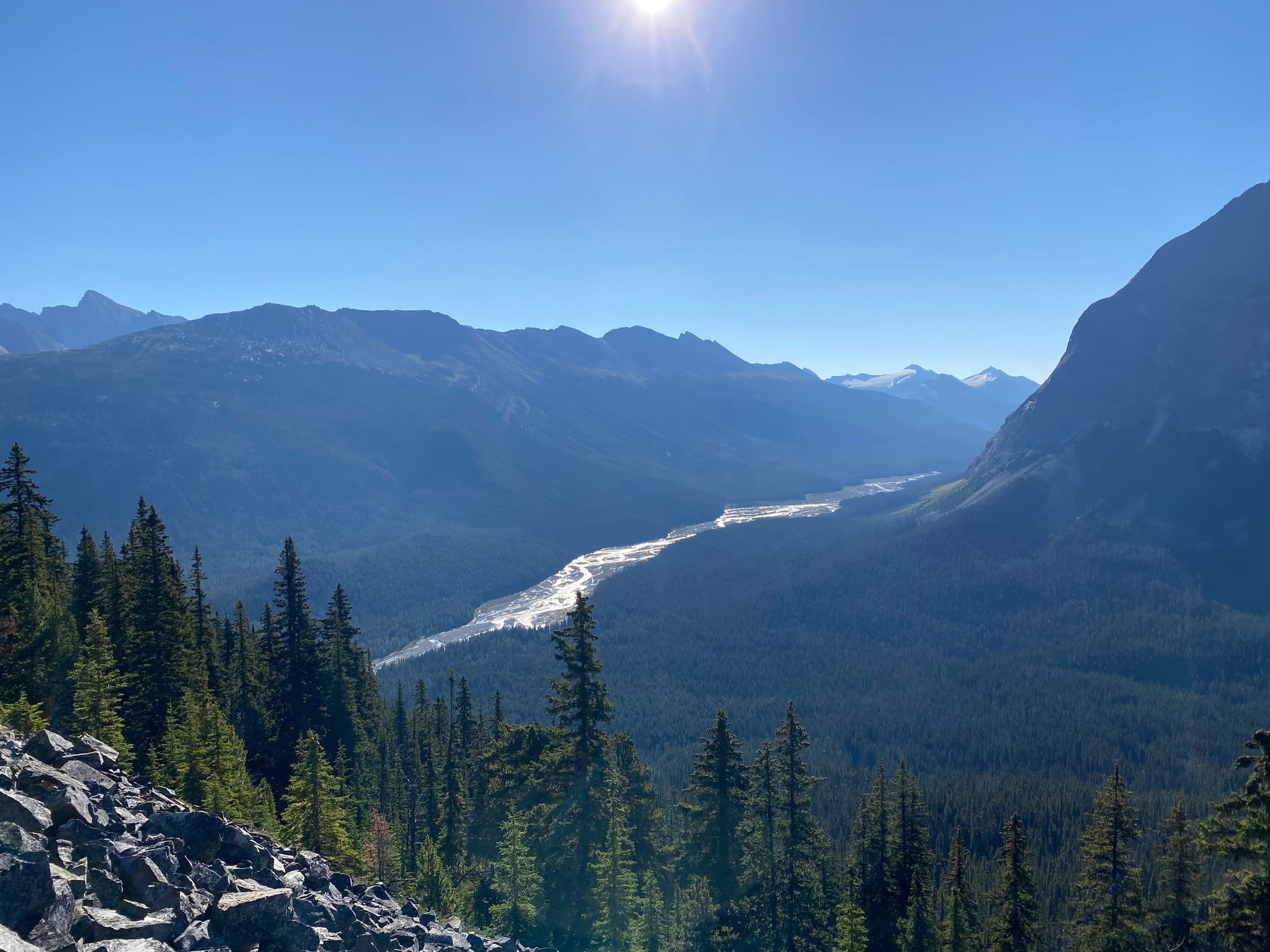 Eventually I started ascending the northern side of the valley. This got steeper and steeper. Around 1750m I reached a boulder field which made travel faster. Near the top of the boulder field I started getting brief views of the Smoky River, already far below me.