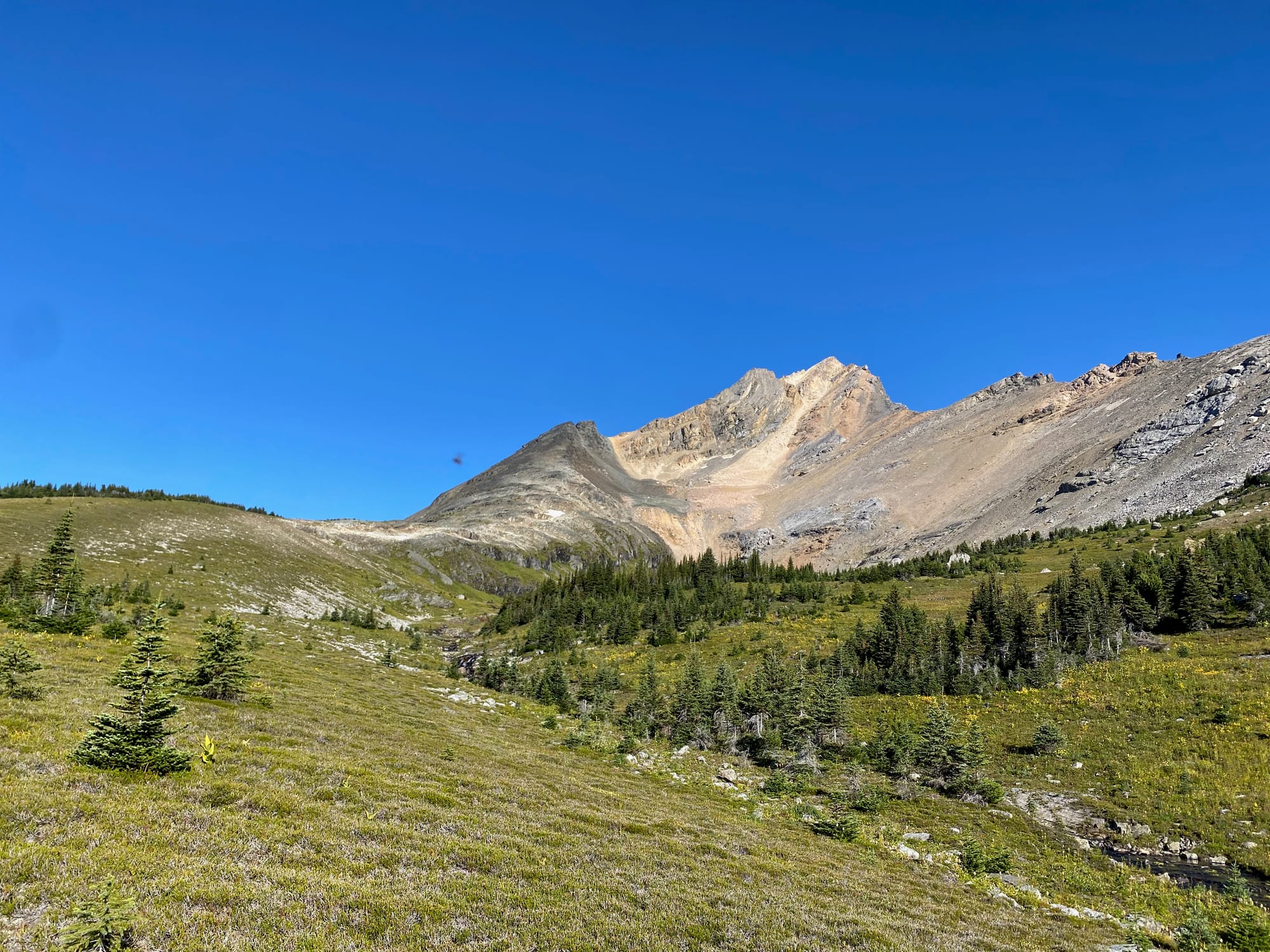 Past the boulder field, the terrain got less steep. I walked northwest through a series of small meadows, which eventually opened up into a larger meadow around 2050m with a picturesque stream running through it. The summit and its two false summits came into view.