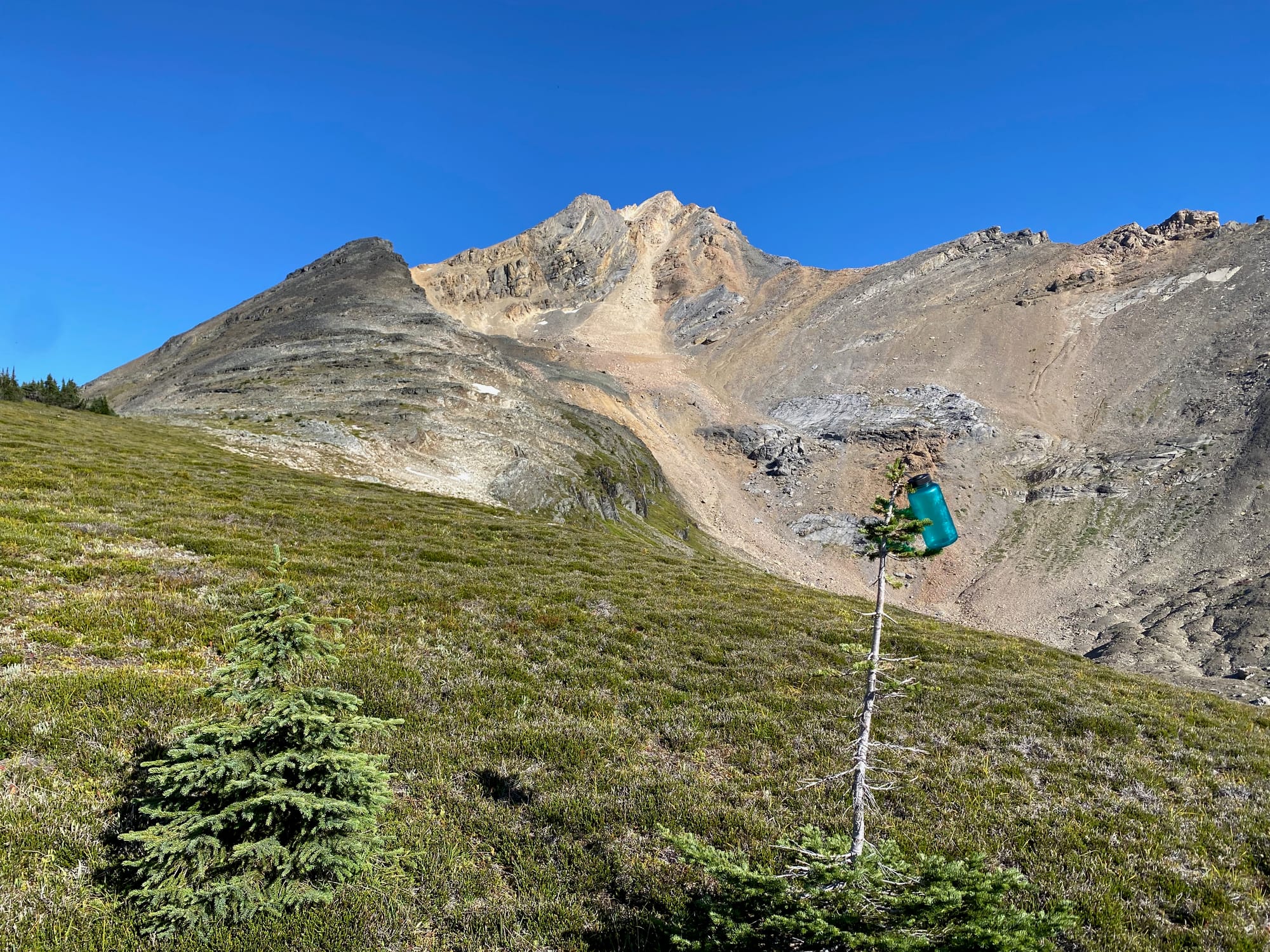 I had this peak on my radar as a potential GDT side trip: there was very little online information and no beta, but photos and topo maps made it seem like it might be doable. My plan was to ascend a valley running west-east to the south of Devout Peak, then climb to a flat area southeast of the summit, then scramble up the southern ridge. In the end I had to turn around 150m from the summit due to a risky section of exposed scrambling. It was still an enjoyable detour, but there are better GDT side trips out there.