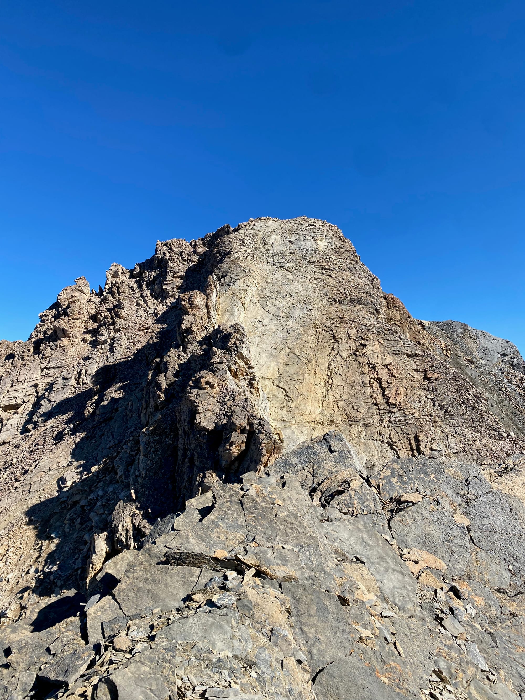 Up next was a steep downclimb, followed by a series of jagged pinnacles along a narrow ridge with massive exposure. Past that, a steep slab guarded the peak. If I was with other people closer to civilization, I might have continued. In such a remote area, at least a day’s hike from the nearest person, I didn’t want to take such a massive risk. It was time to turn around.