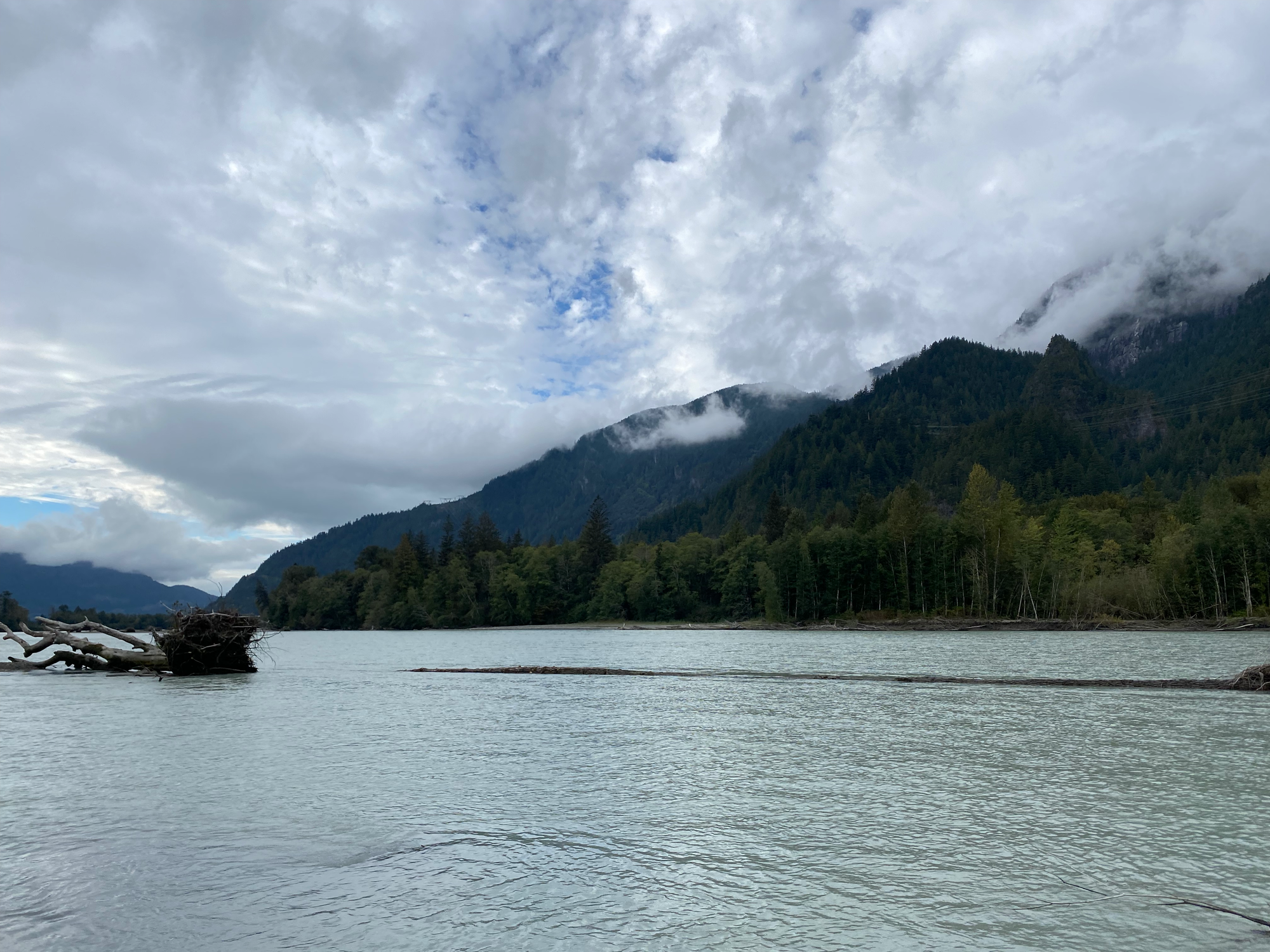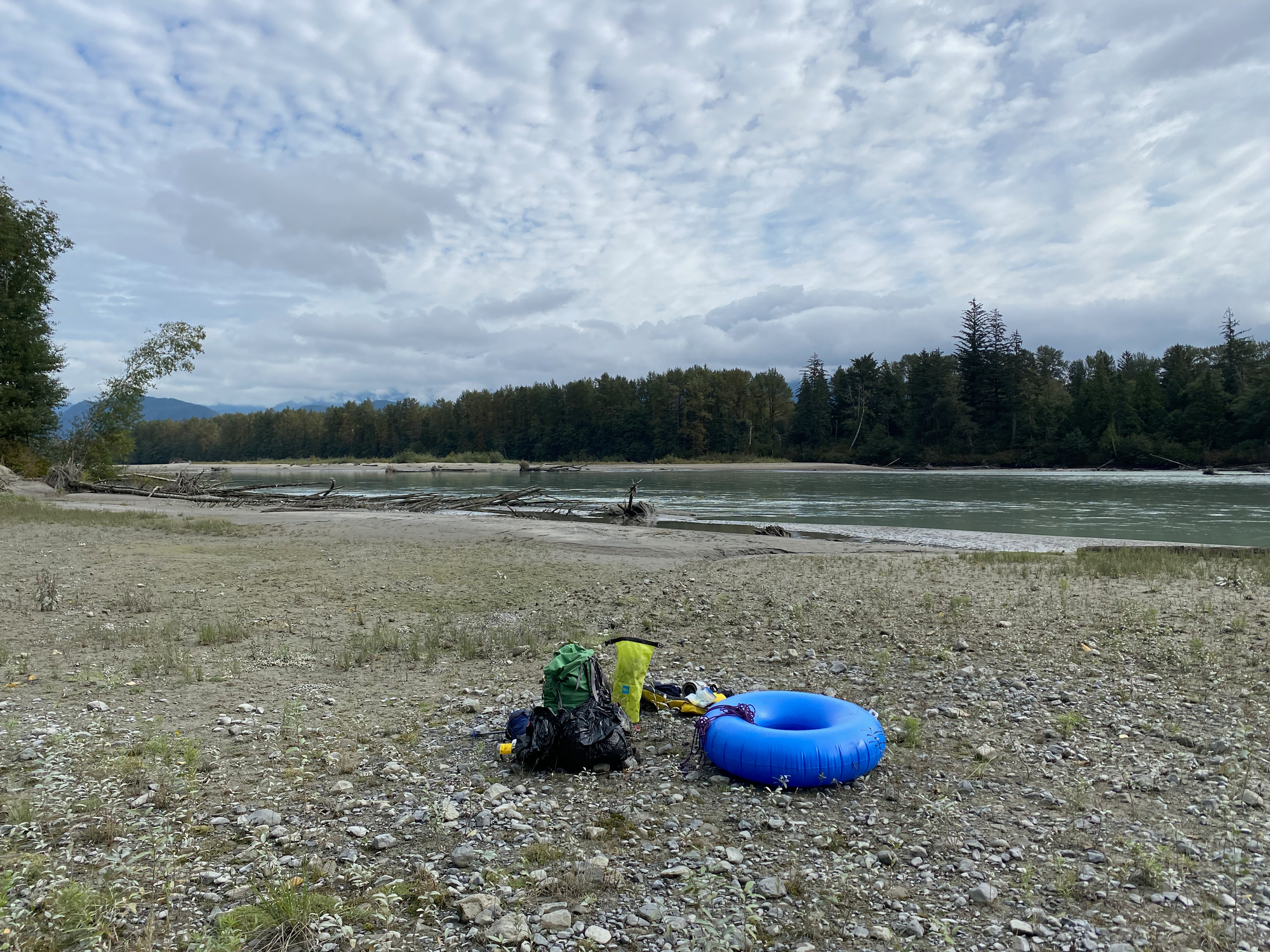 I took the Squamish Connector bus to downtown Squamish and walked down Spit Road to the Squamish River. I spent some time on the beach wrapping important belongings in garbage bags, inflating a newly bought Canadian Tire inner tube - this took a while - then tying my backpack to the tube with paracord. My original plan was to tie rope around my waist, attach the other end to the raft, and swim across.