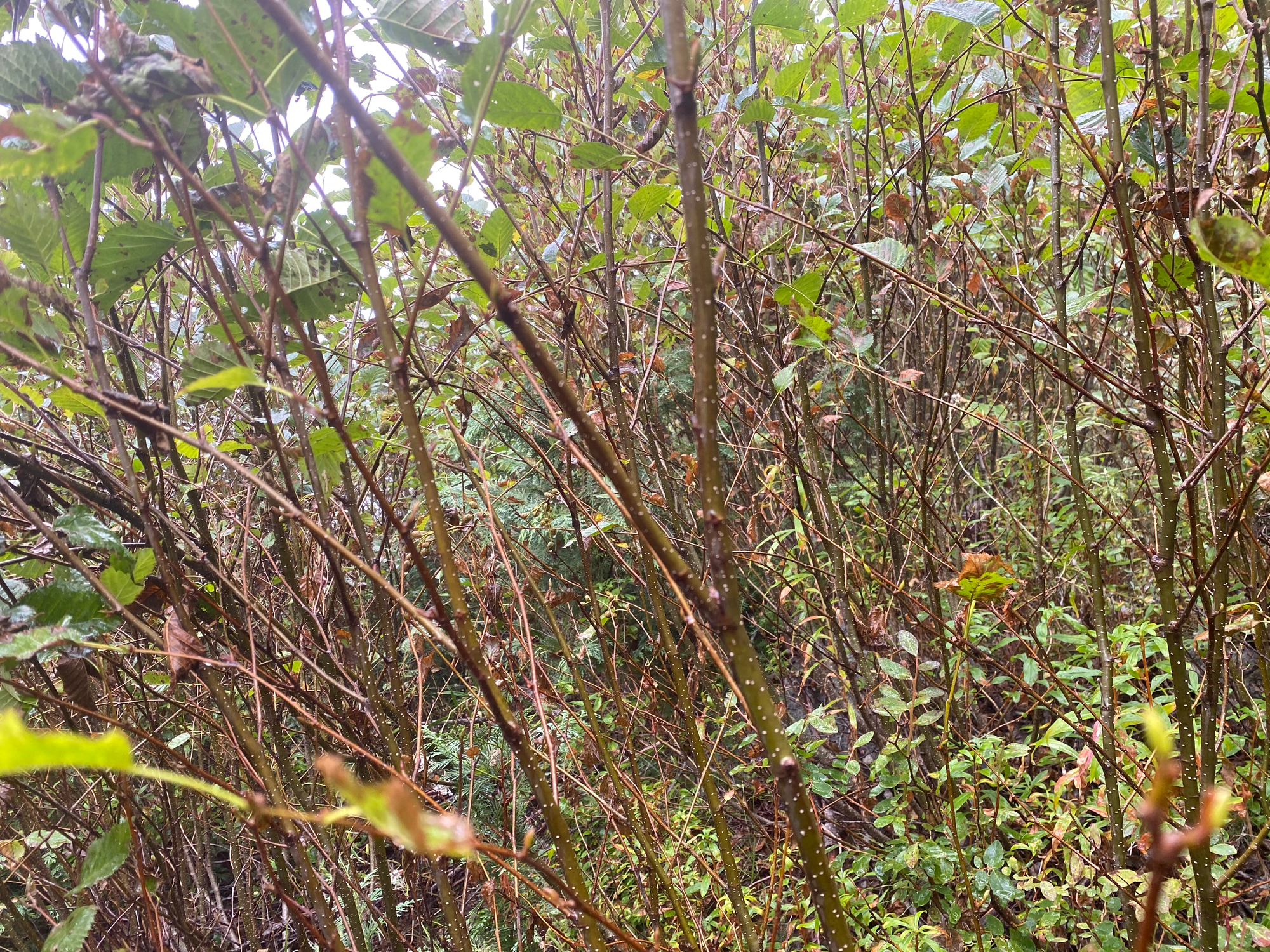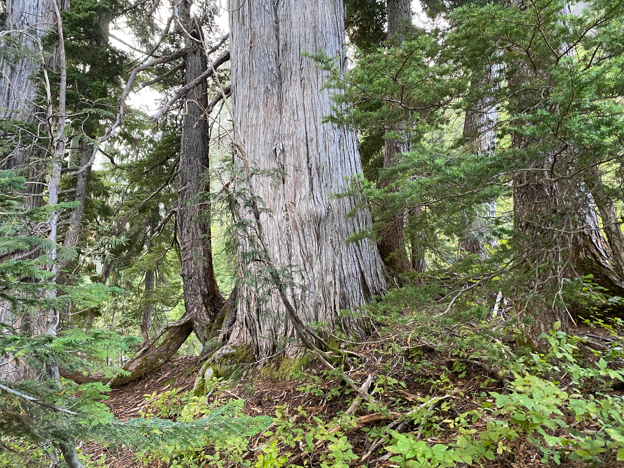 Near the end, I took a shortcut downhill to bypass a granite wall, but the wall kept going for hundreds of vertical metres, and I ended up descending another very steep gully. On the bright side, the gully had several stands of large old-growth trees that had not been seen by anyone in a long time. Eventually I reached an old FSR.