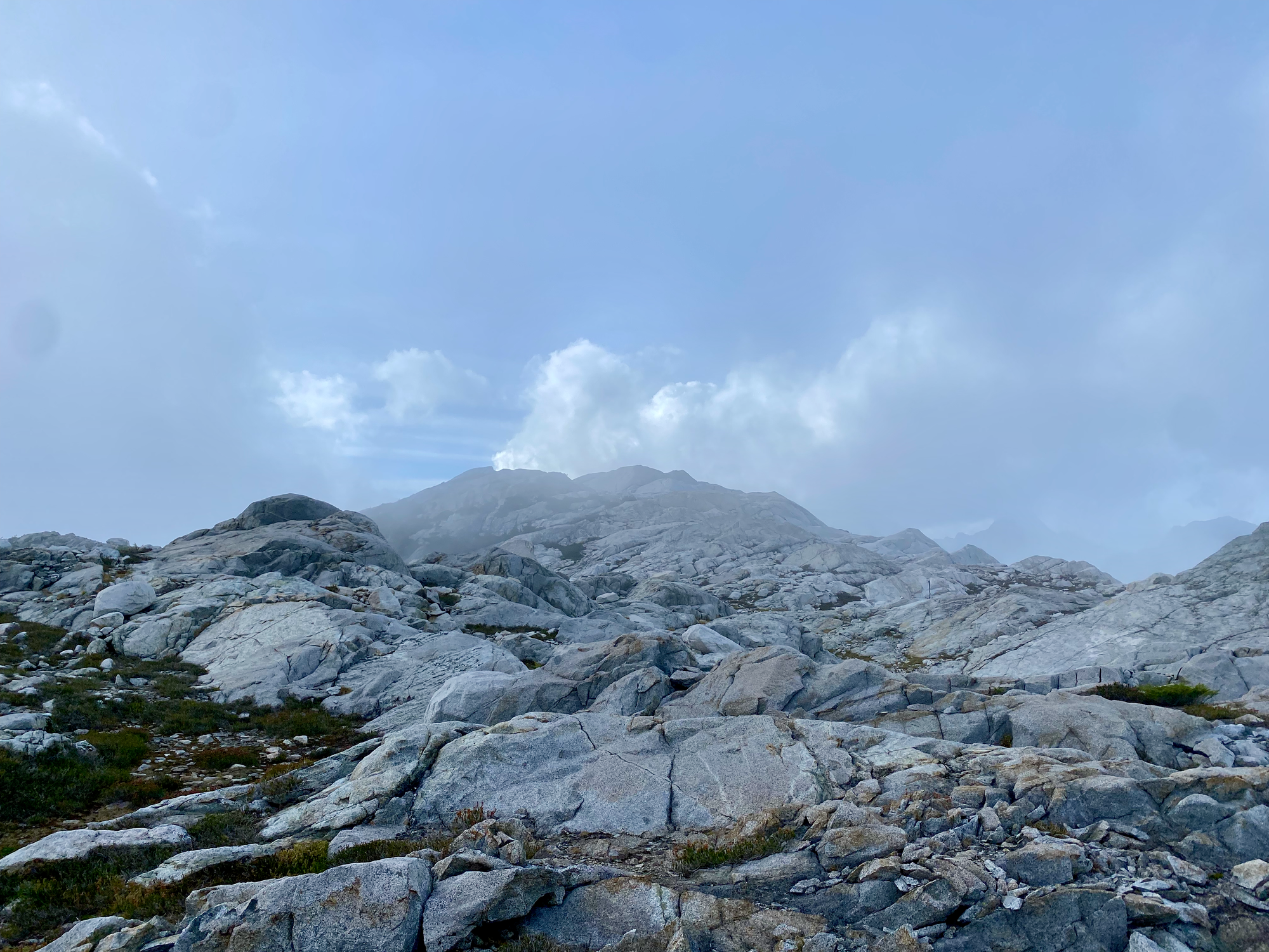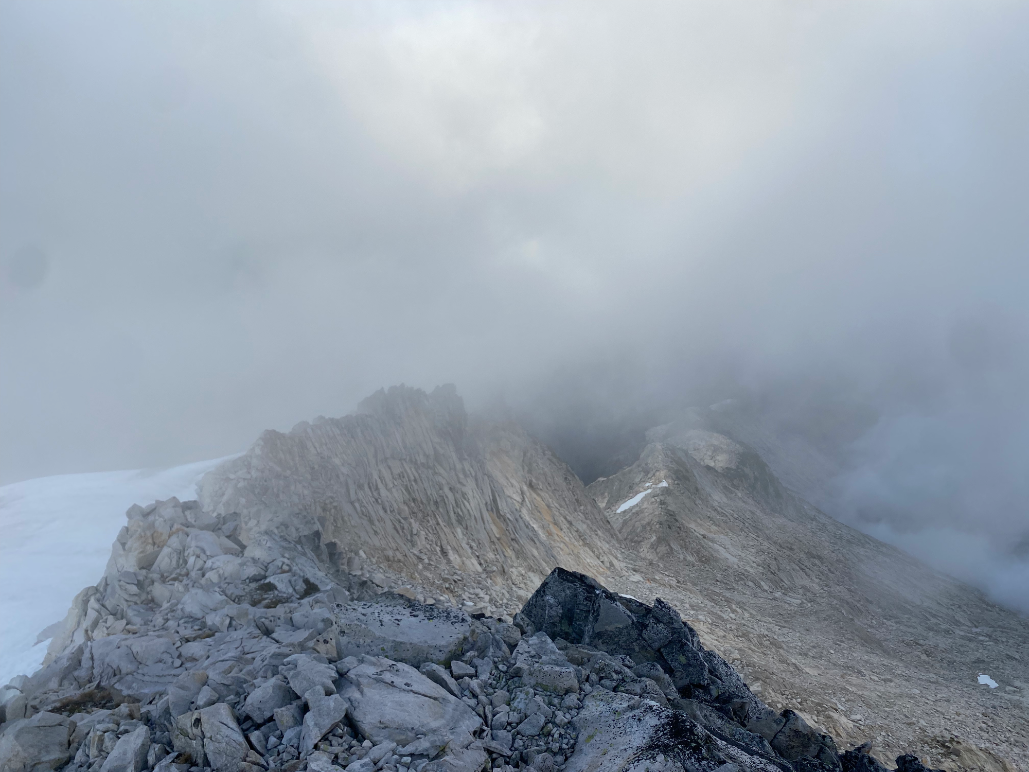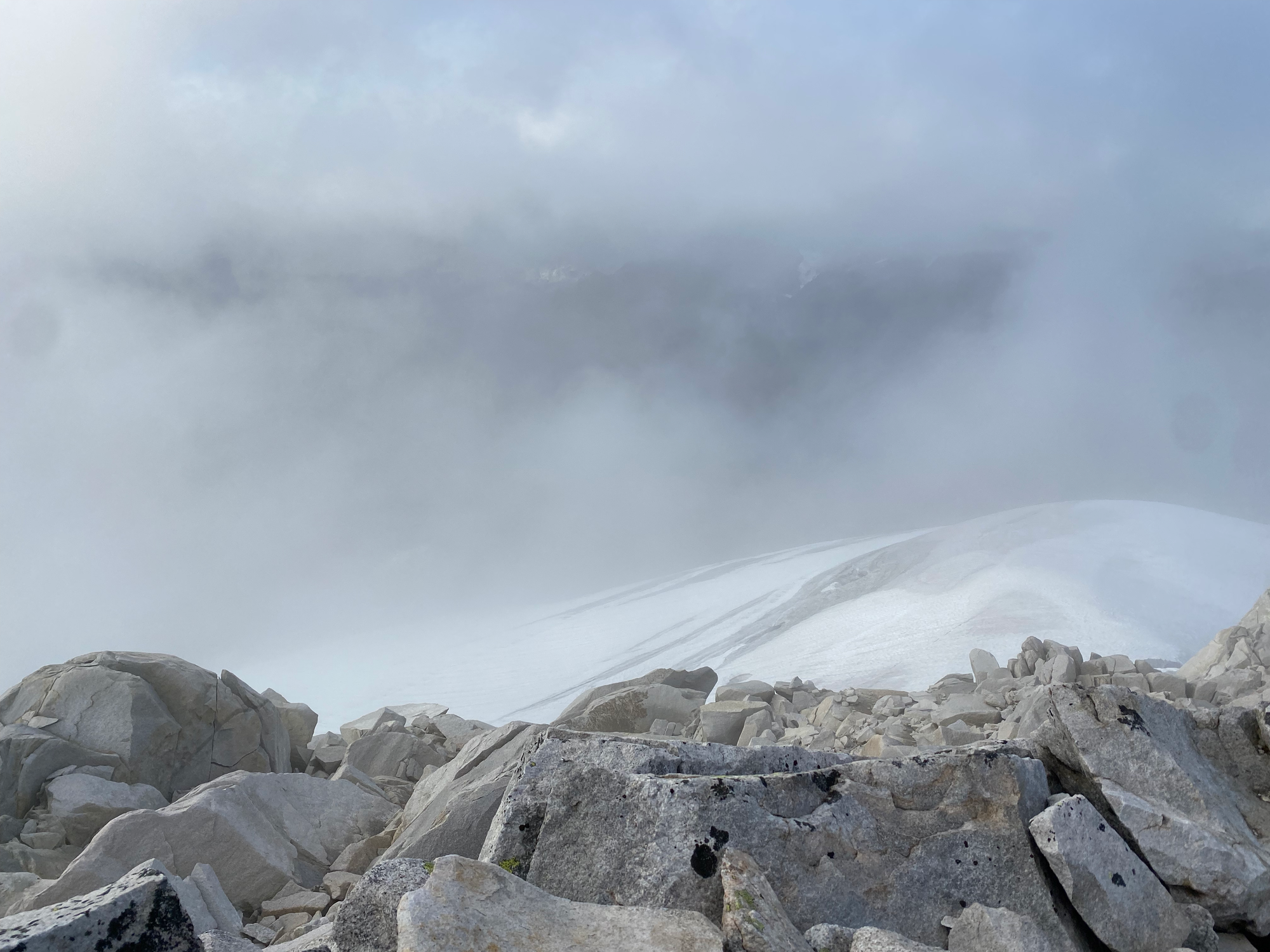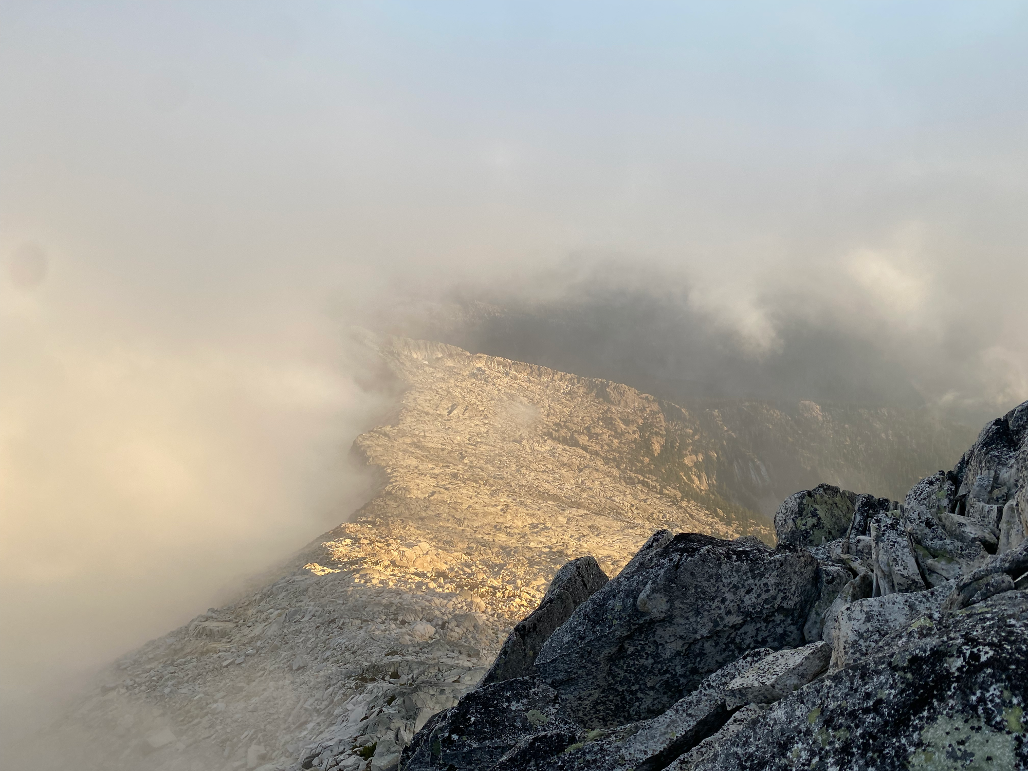 Eventually I arrived at the ridge and a short Class 2 scramble took me to the summit. I had dinner on the summit, and caught fleeting glimpses of views, but still felt a bit robbed.