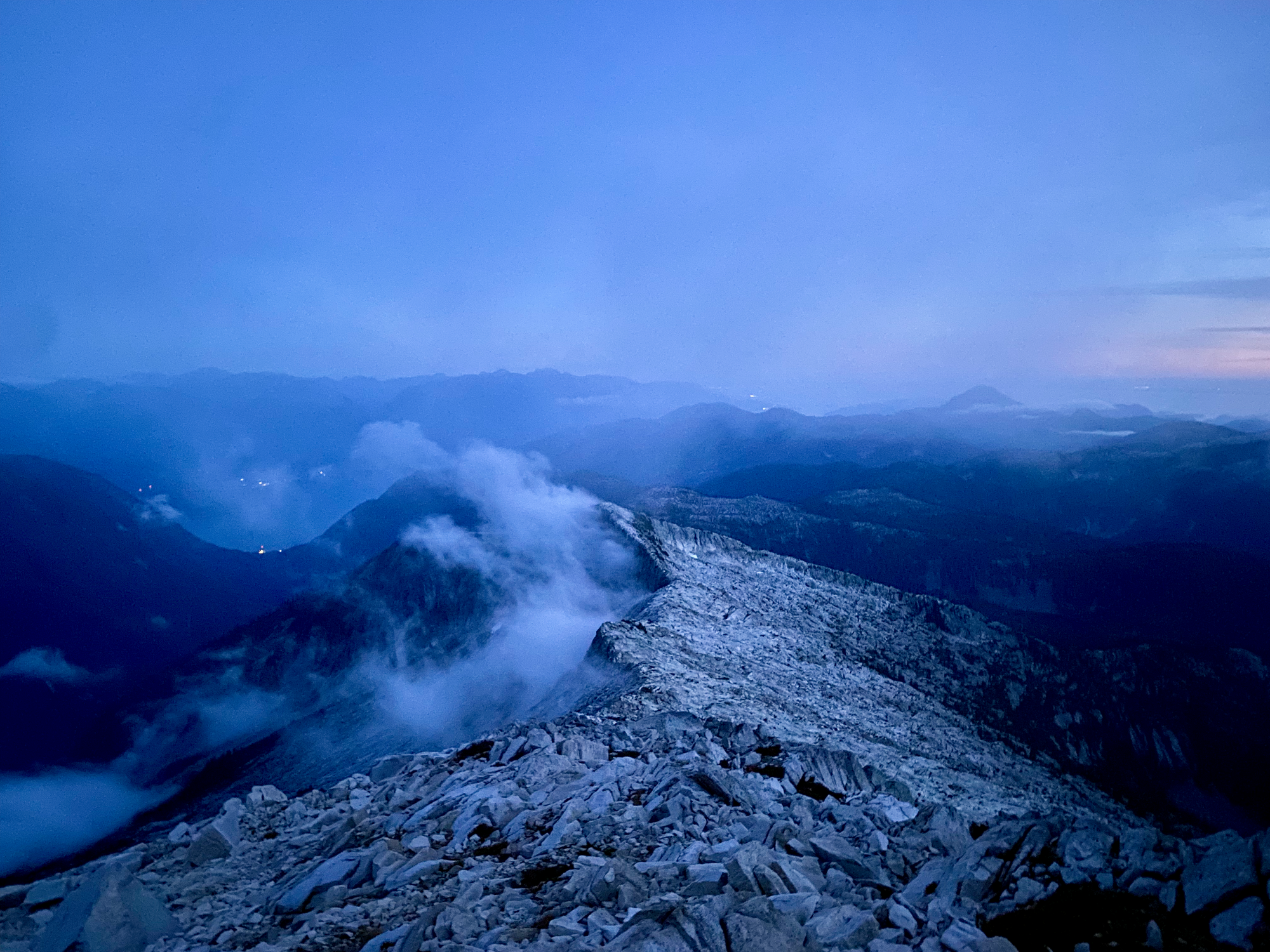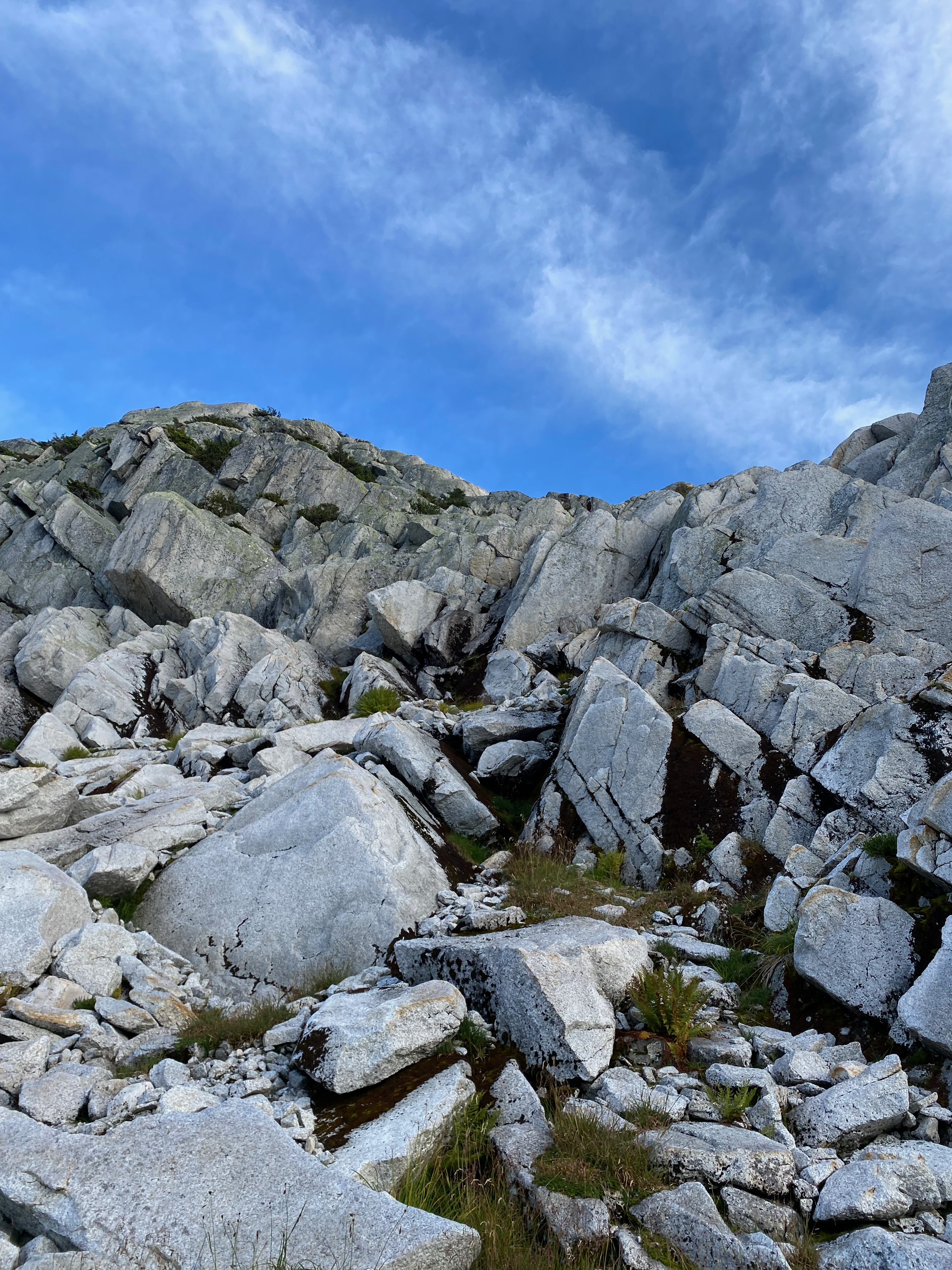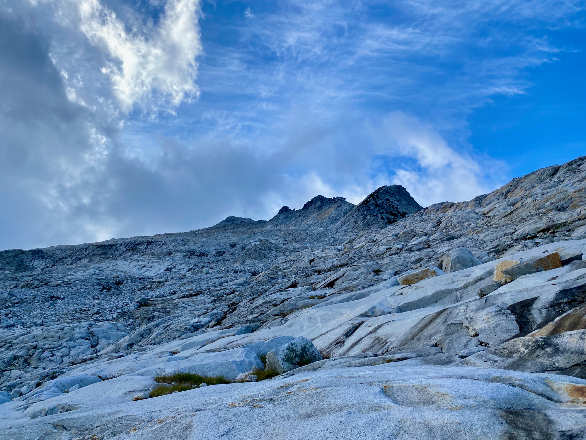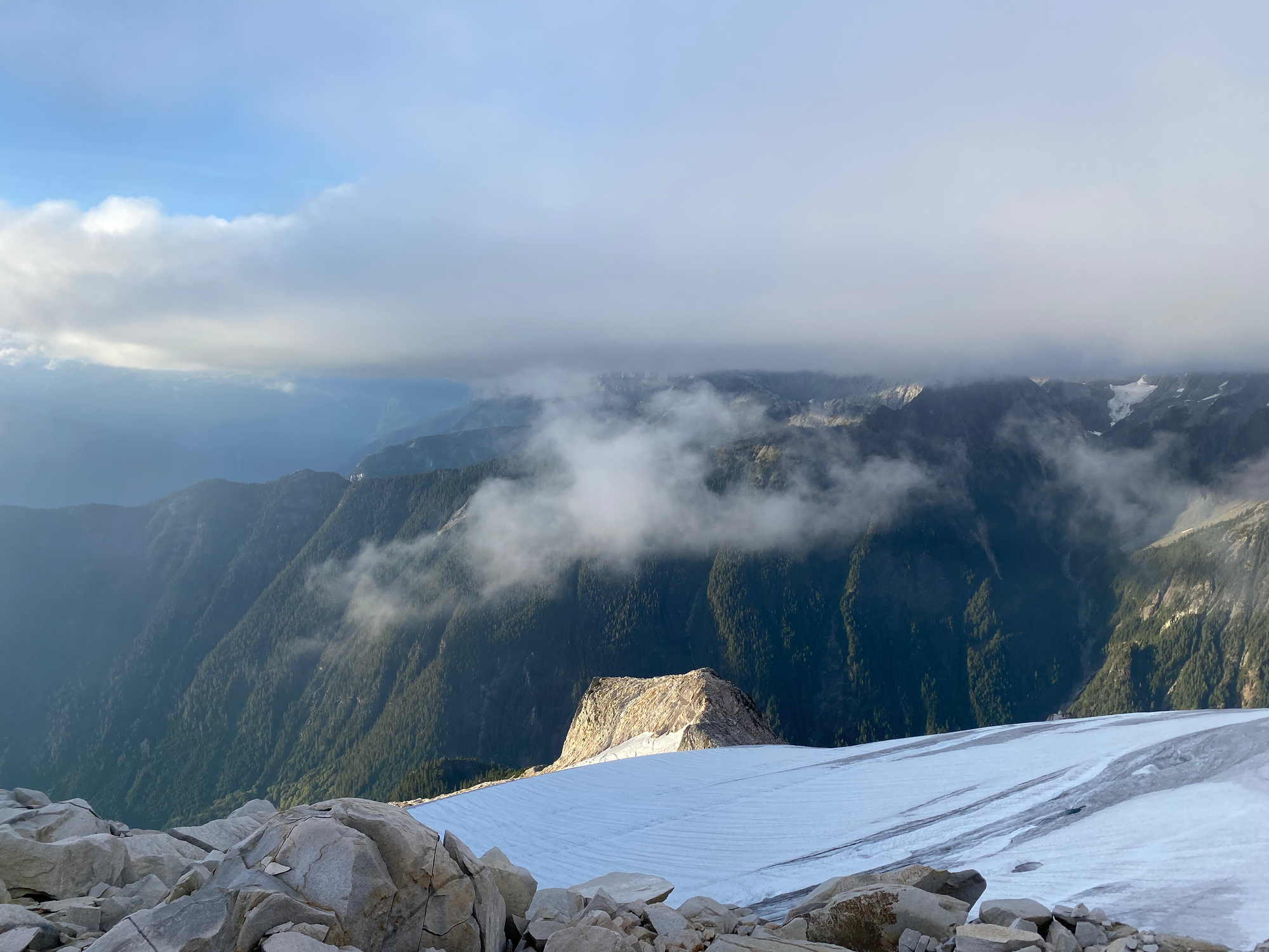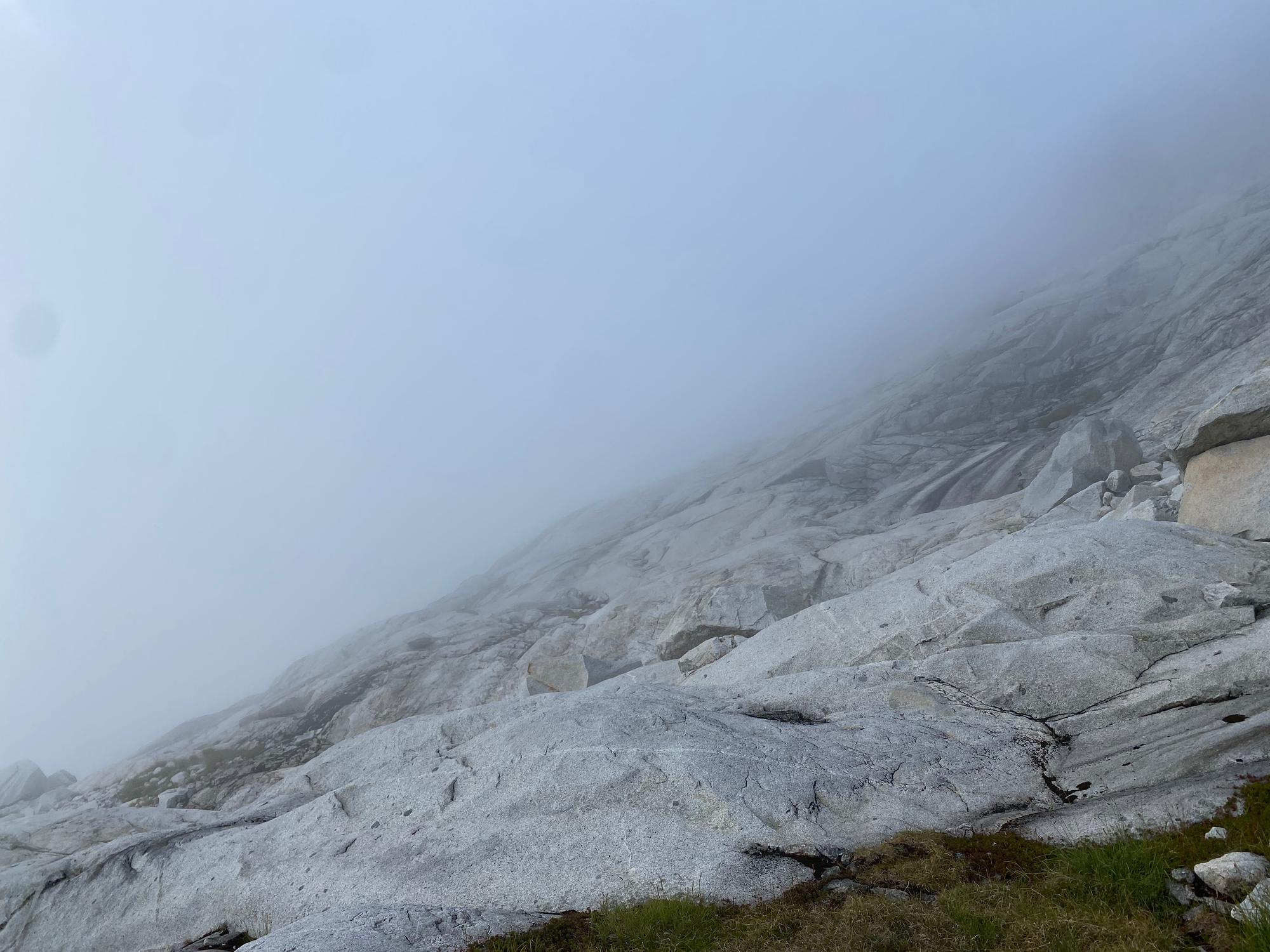 Eventually I arrived at the ridge and a short Class 2 scramble took me to the summit. I had dinner on the summit, and caught fleeting glimpses of views, but still felt a bit robbed.