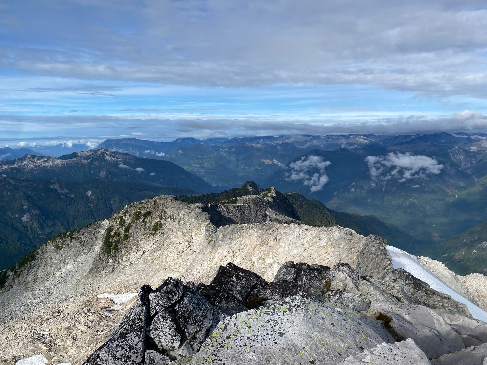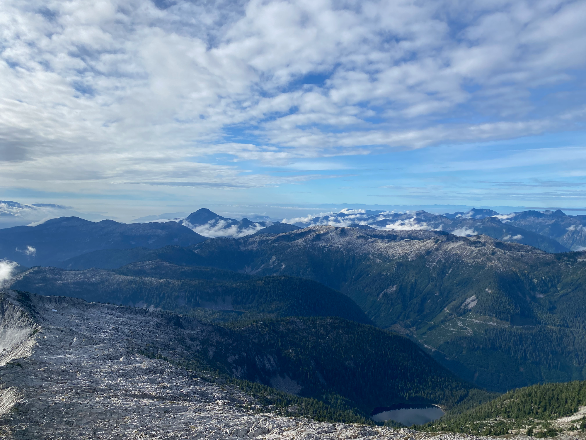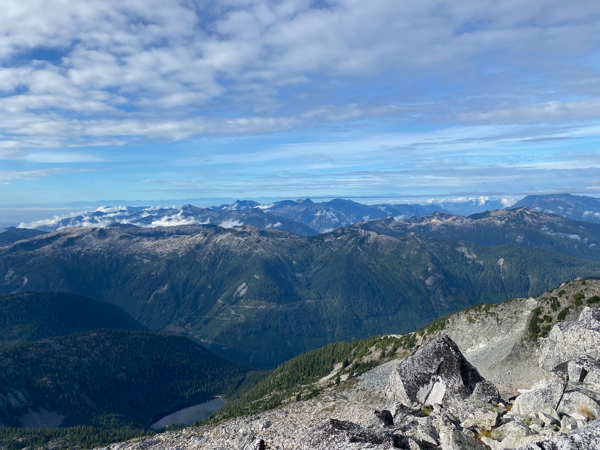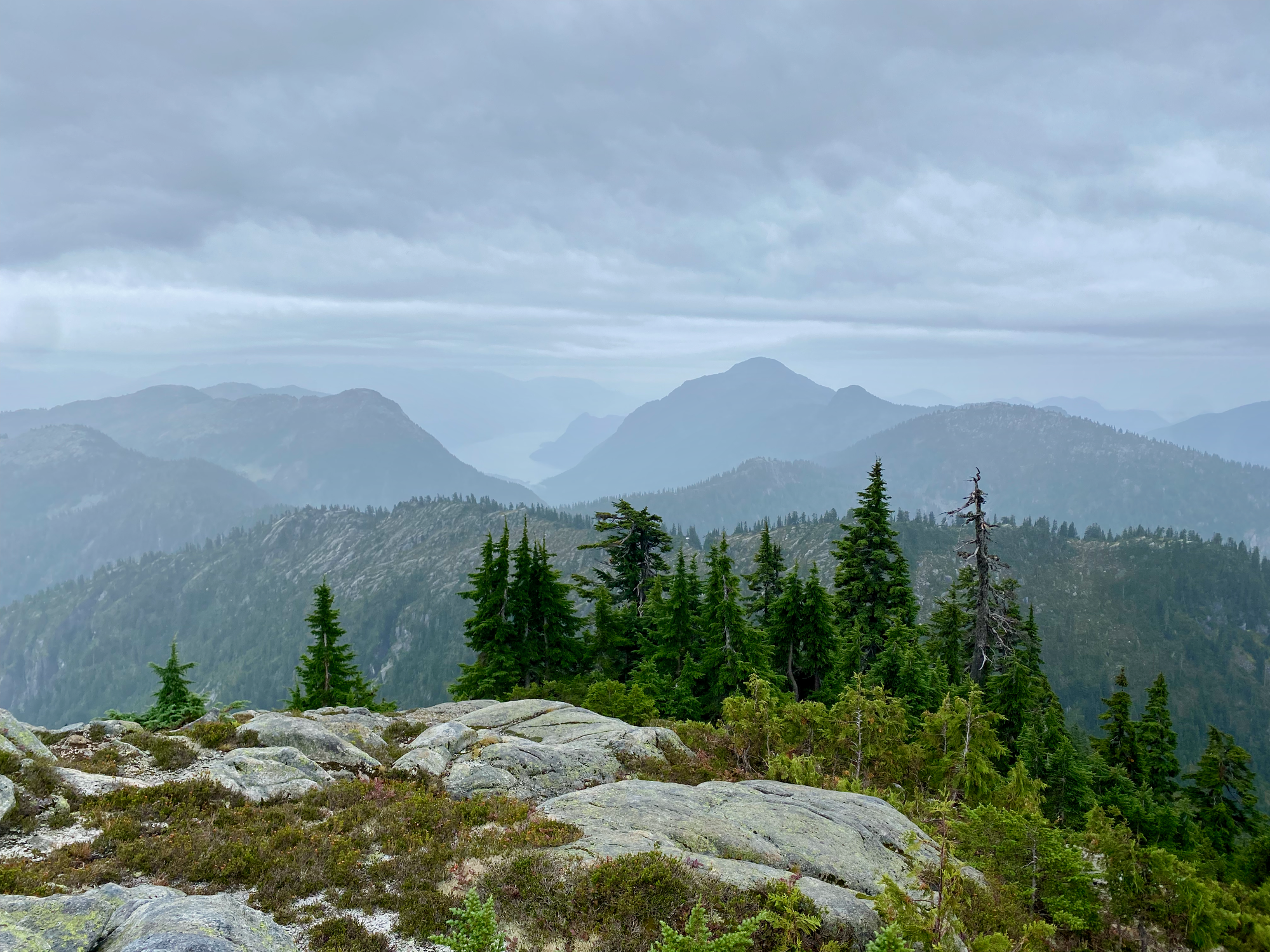 As predicted, the clouds cleared around 9am, and I was treated to one of the best mountain views BC has to offer. To the east were the familiar North Shore and Squamish peaks from an entirely different perspective. To the west was the massive, remote Tzoonie Mountain massif, with even more distant peaks further beyond. The bare granite of Sedgwick’s southern ridge framed the Lower Sunshine Coast to the south. To the north was a wall of cloud over the Tantalus Range, which never quite cleared.