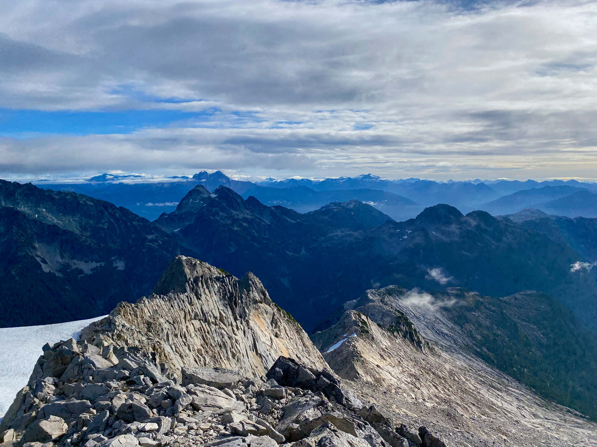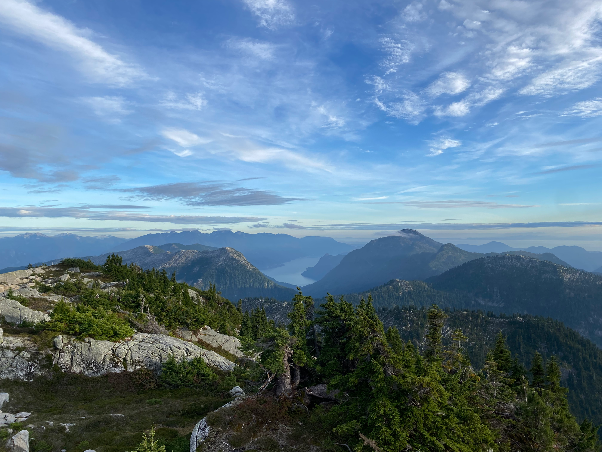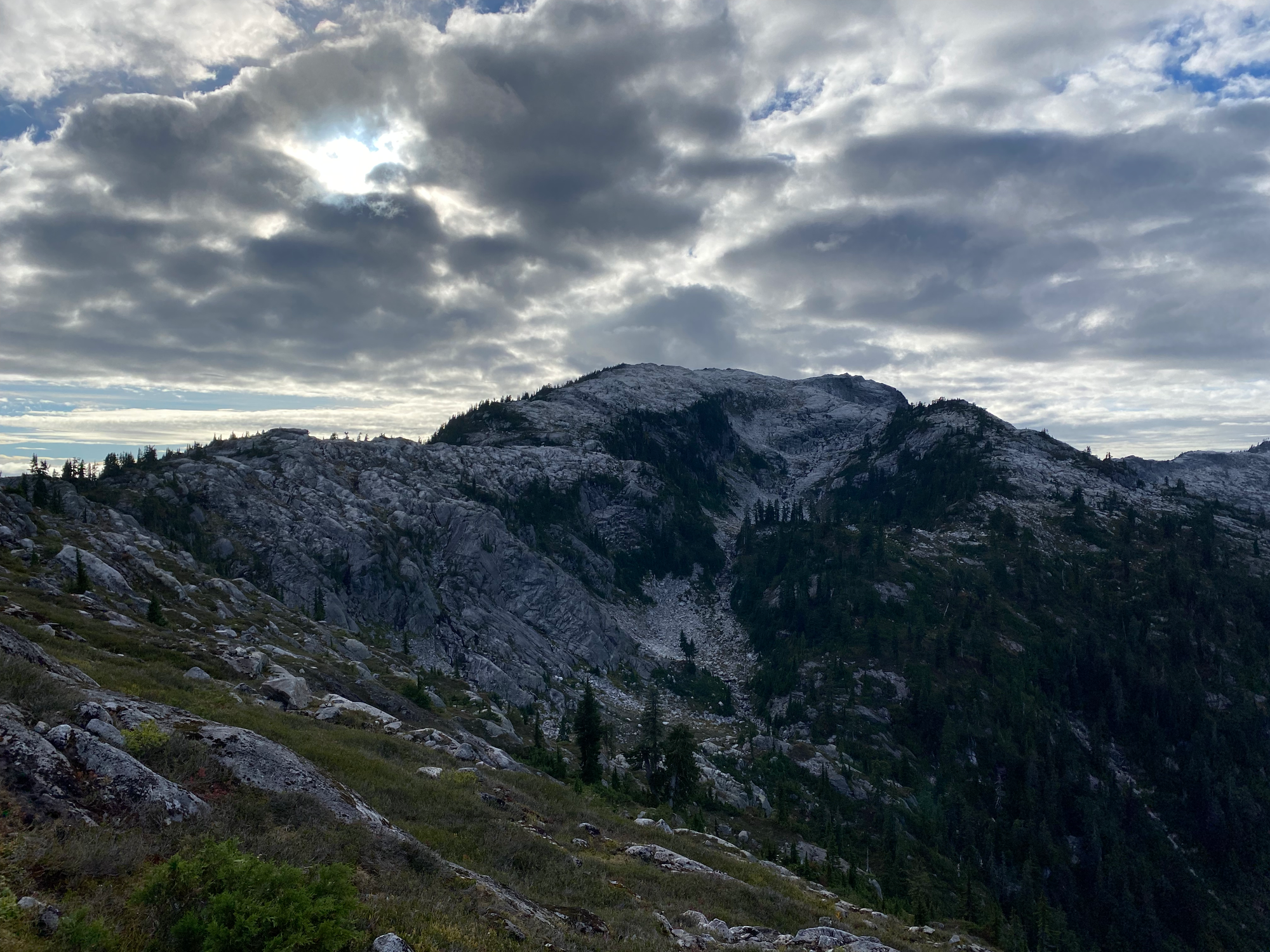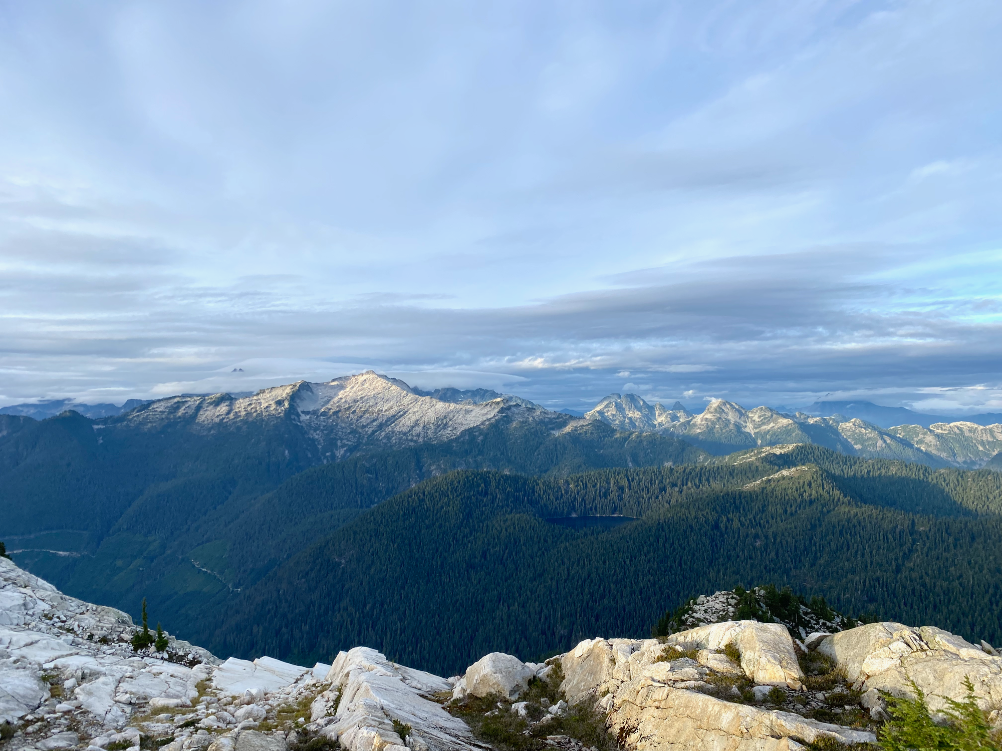 As predicted, the clouds cleared around 9am, and I was treated to one of the best mountain views BC has to offer. To the east were the familiar North Shore and Squamish peaks from an entirely different perspective. To the west was the massive, remote Tzoonie Mountain massif, with even more distant peaks further beyond. The bare granite of Sedgwick’s southern ridge framed the Lower Sunshine Coast to the south. To the north was a wall of cloud over the Tantalus Range, which never quite cleared.