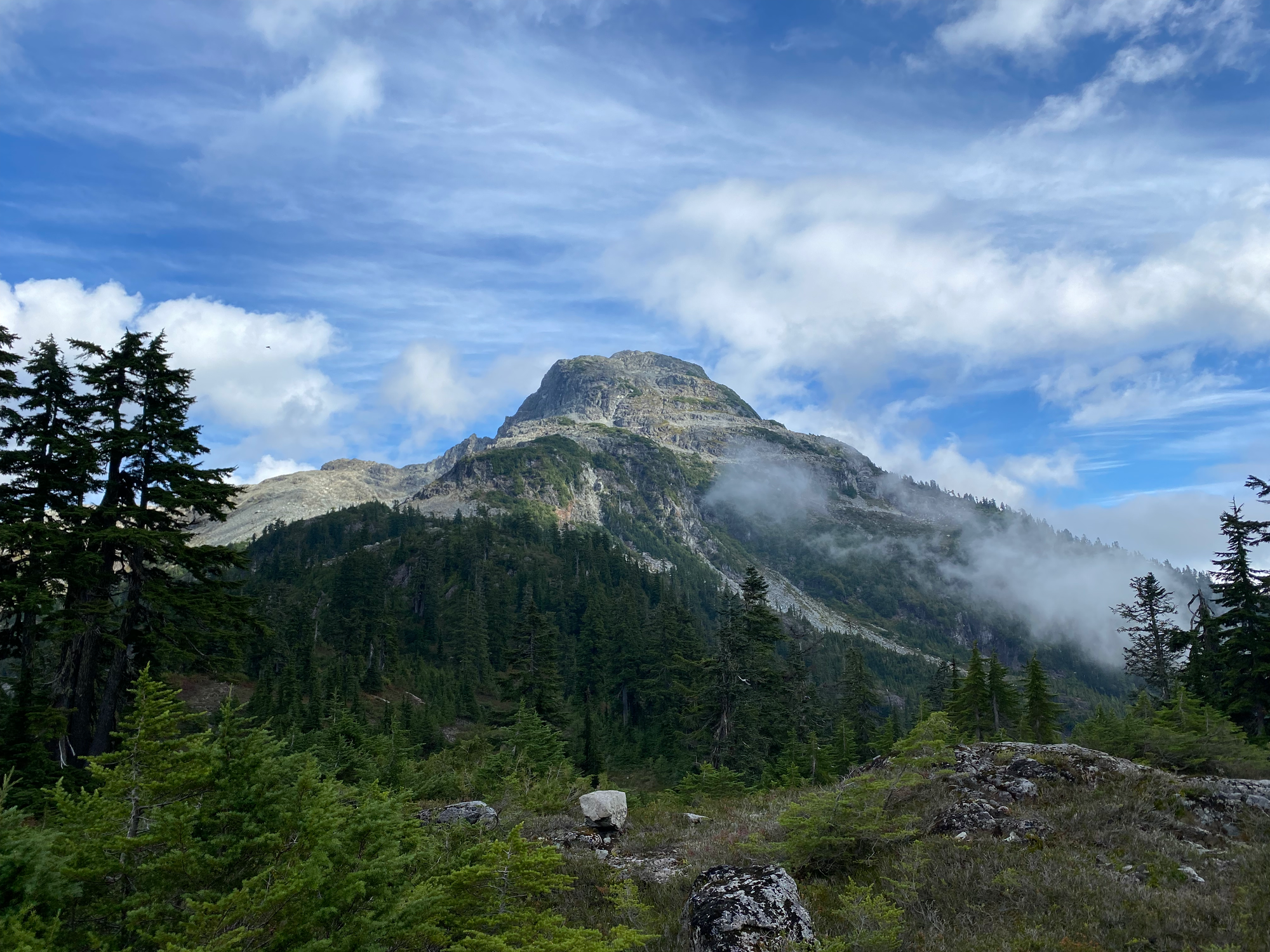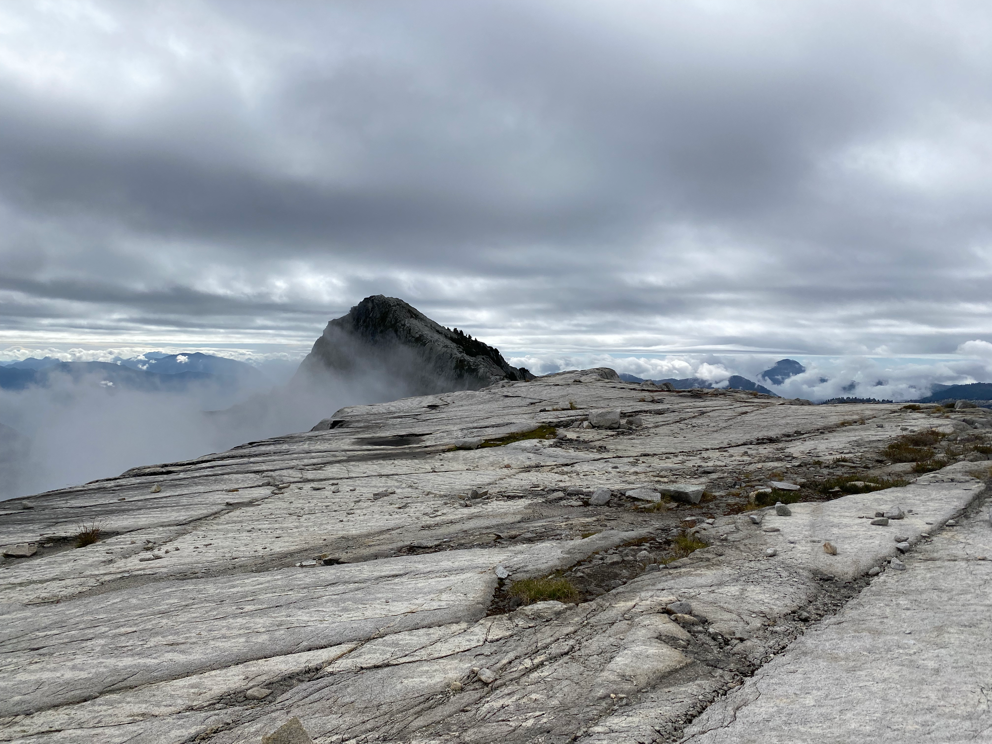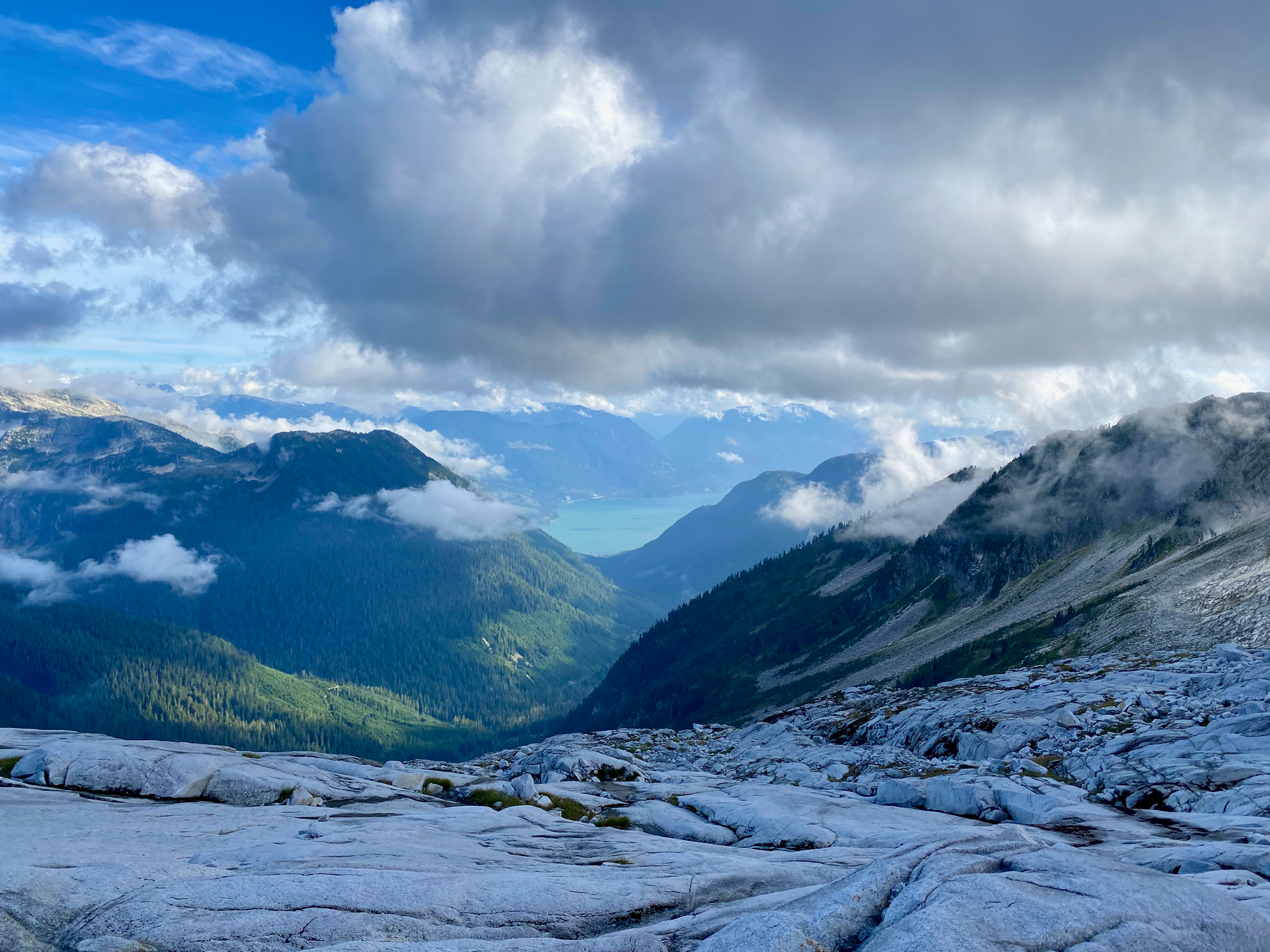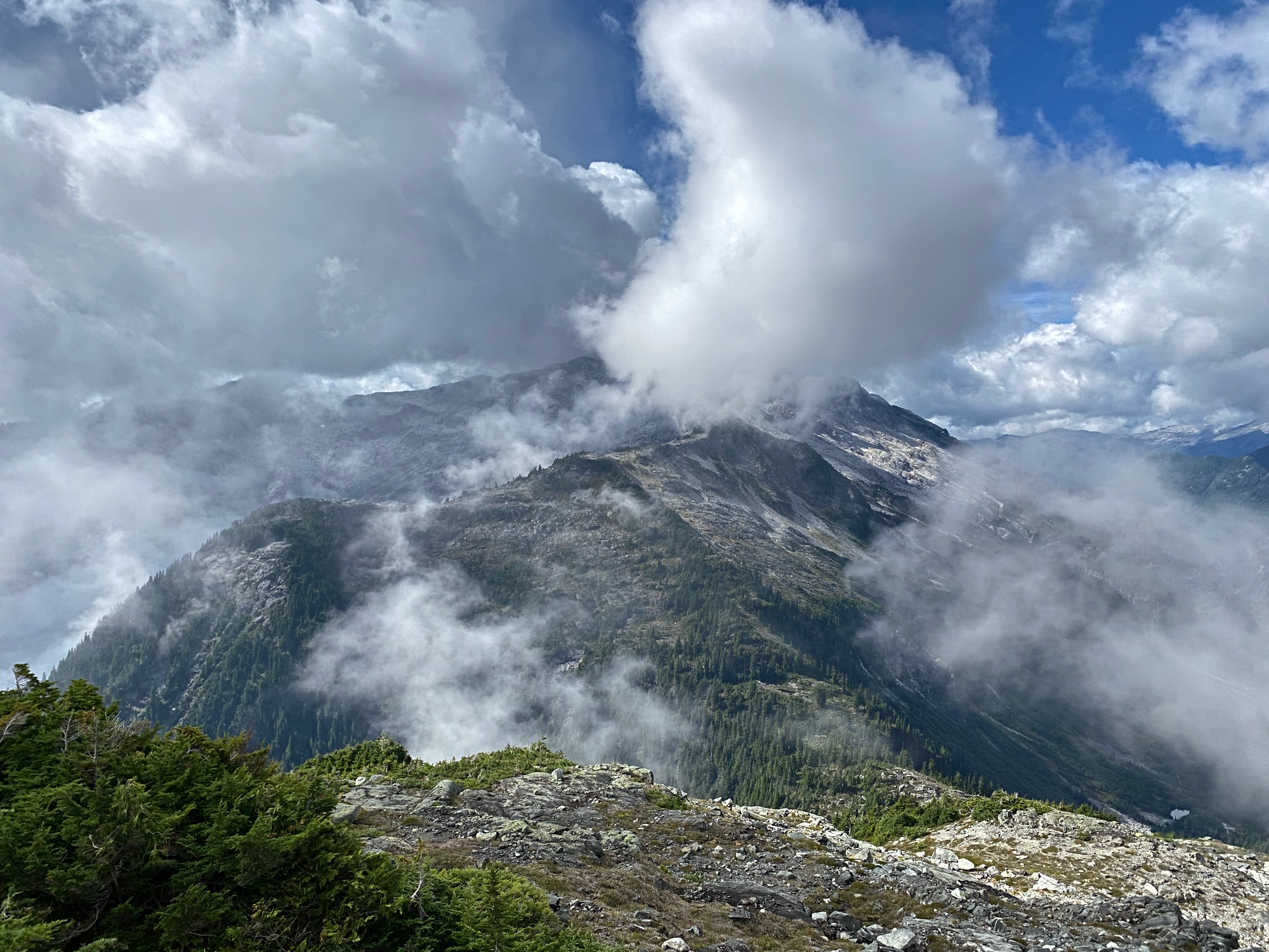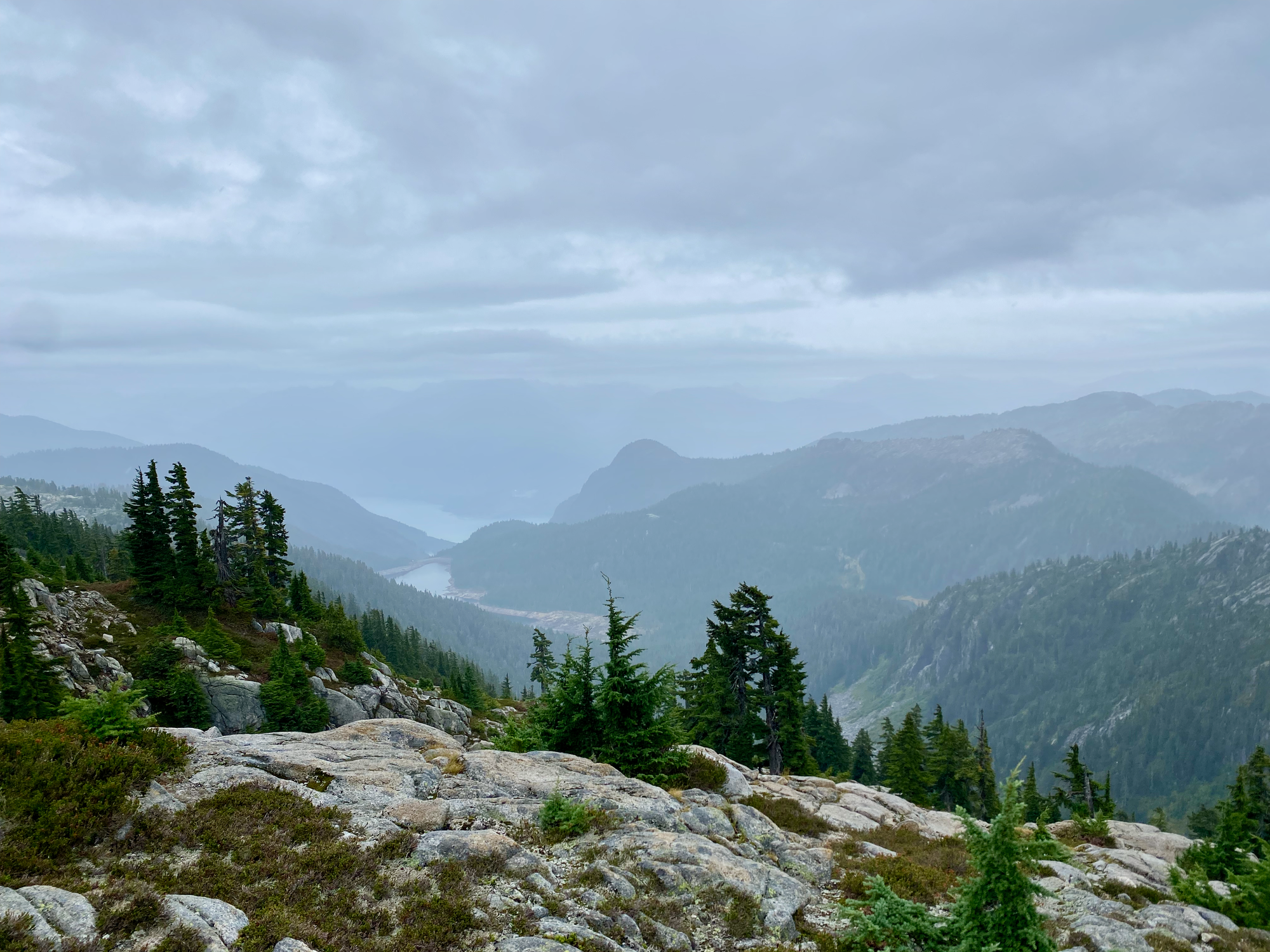 As predicted, the clouds cleared around 9am, and I was treated to one of the best mountain views BC has to offer. To the east were the familiar North Shore and Squamish peaks from an entirely different perspective. To the west was the massive, remote Tzoonie Mountain massif, with even more distant peaks further beyond. The bare granite of Sedgwick’s southern ridge framed the Lower Sunshine Coast to the south. To the north was a wall of cloud over the Tantalus Range, which never quite cleared.