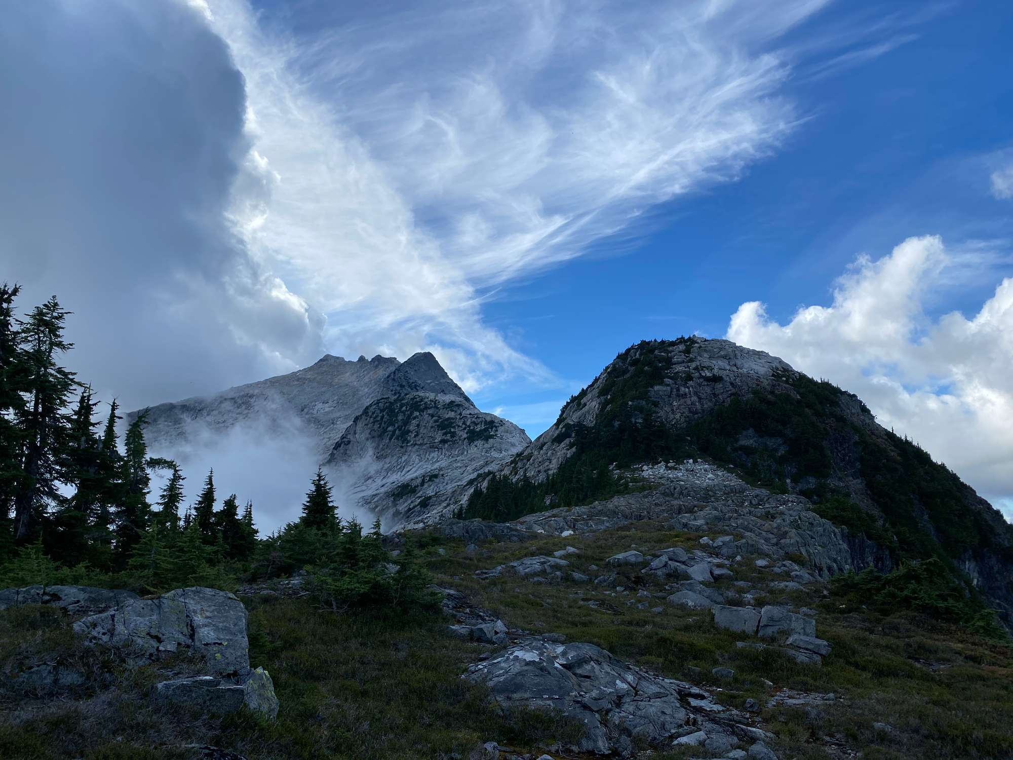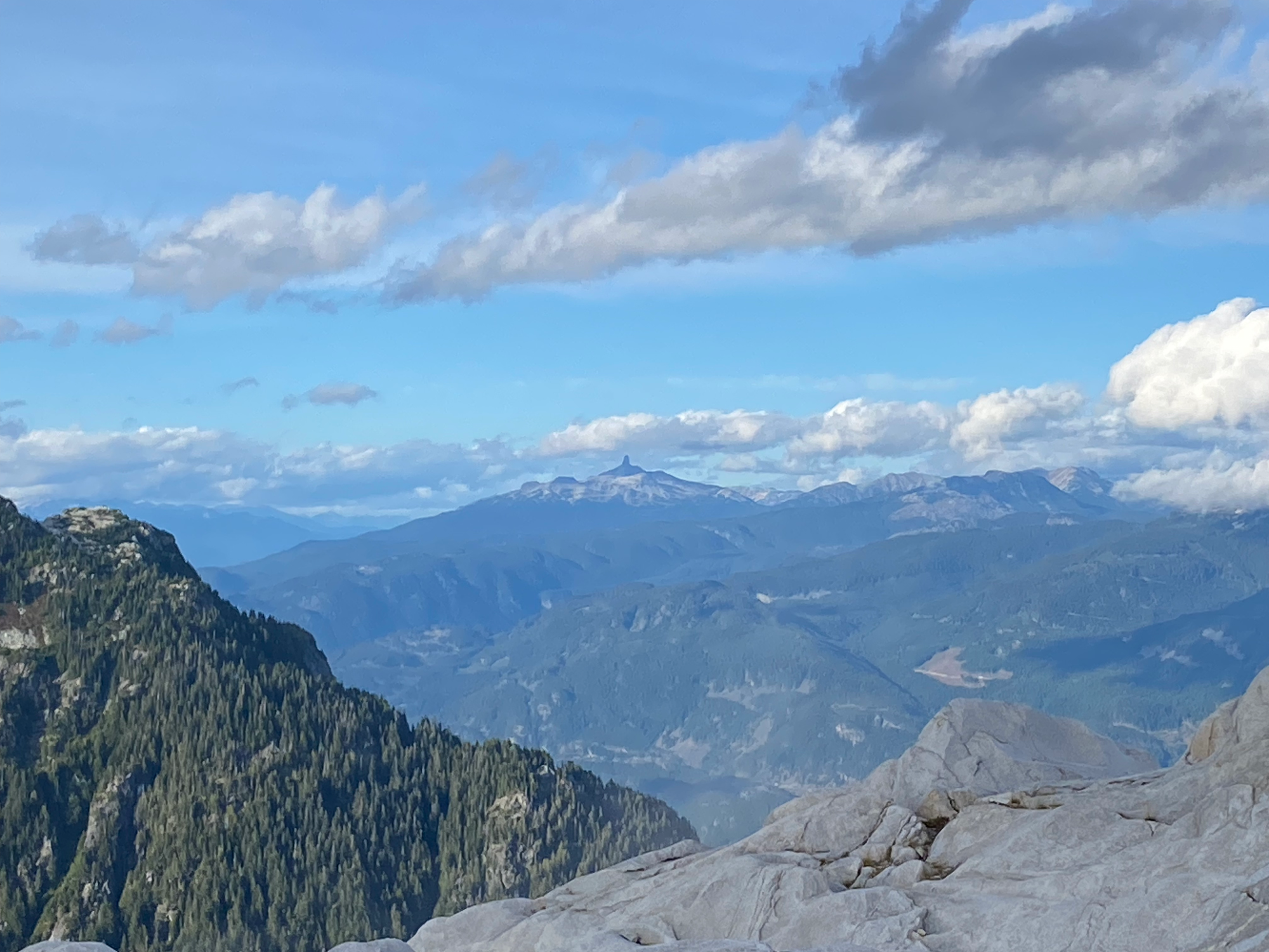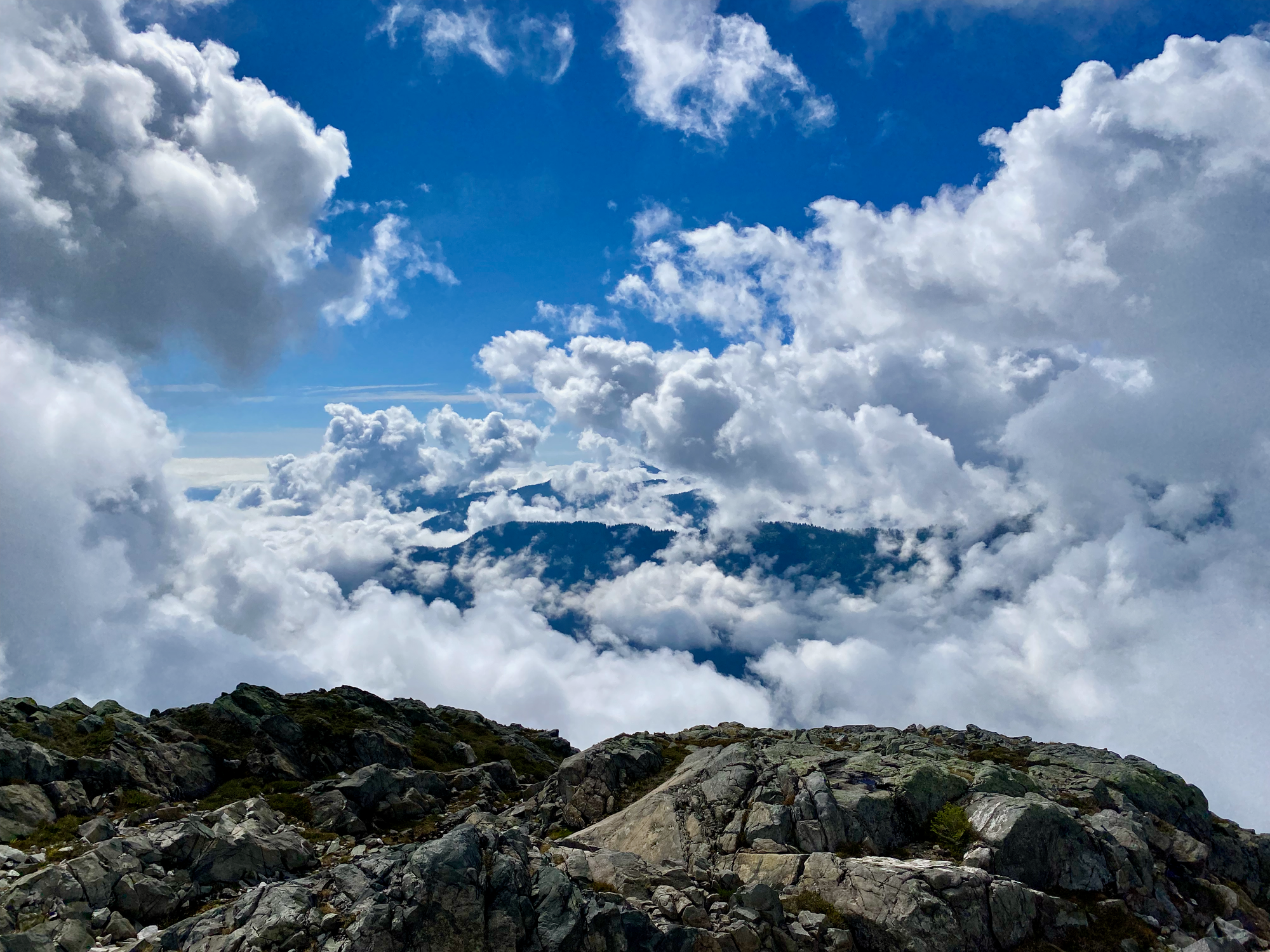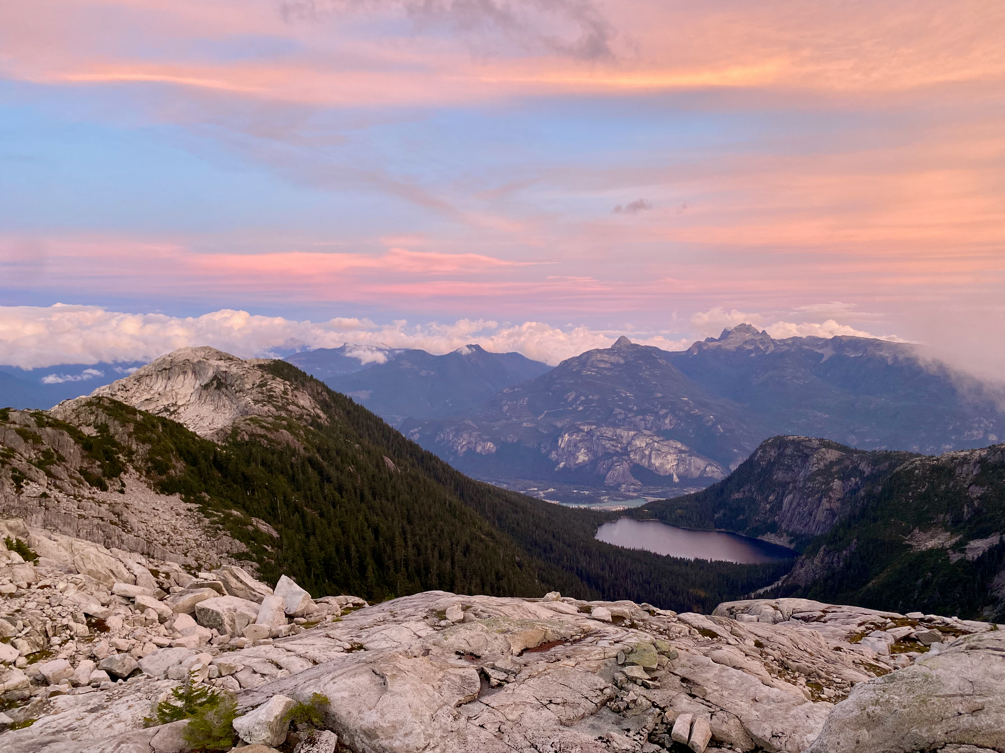 As predicted, the clouds cleared around 9am, and I was treated to one of the best mountain views BC has to offer. To the east were the familiar North Shore and Squamish peaks from an entirely different perspective. To the west was the massive, remote Tzoonie Mountain massif, with even more distant peaks further beyond. The bare granite of Sedgwick’s southern ridge framed the Lower Sunshine Coast to the south. To the north was a wall of cloud over the Tantalus Range, which never quite cleared.