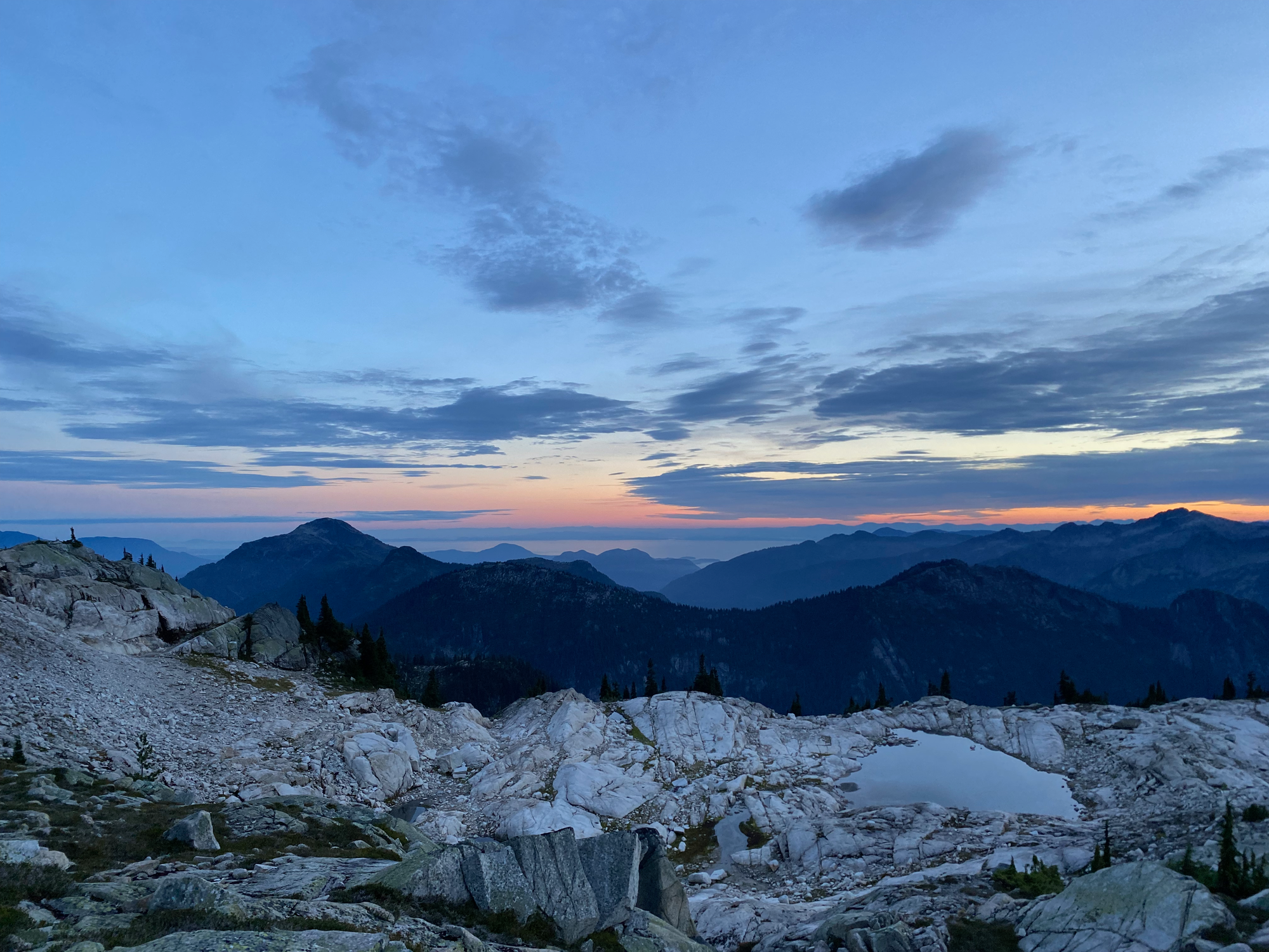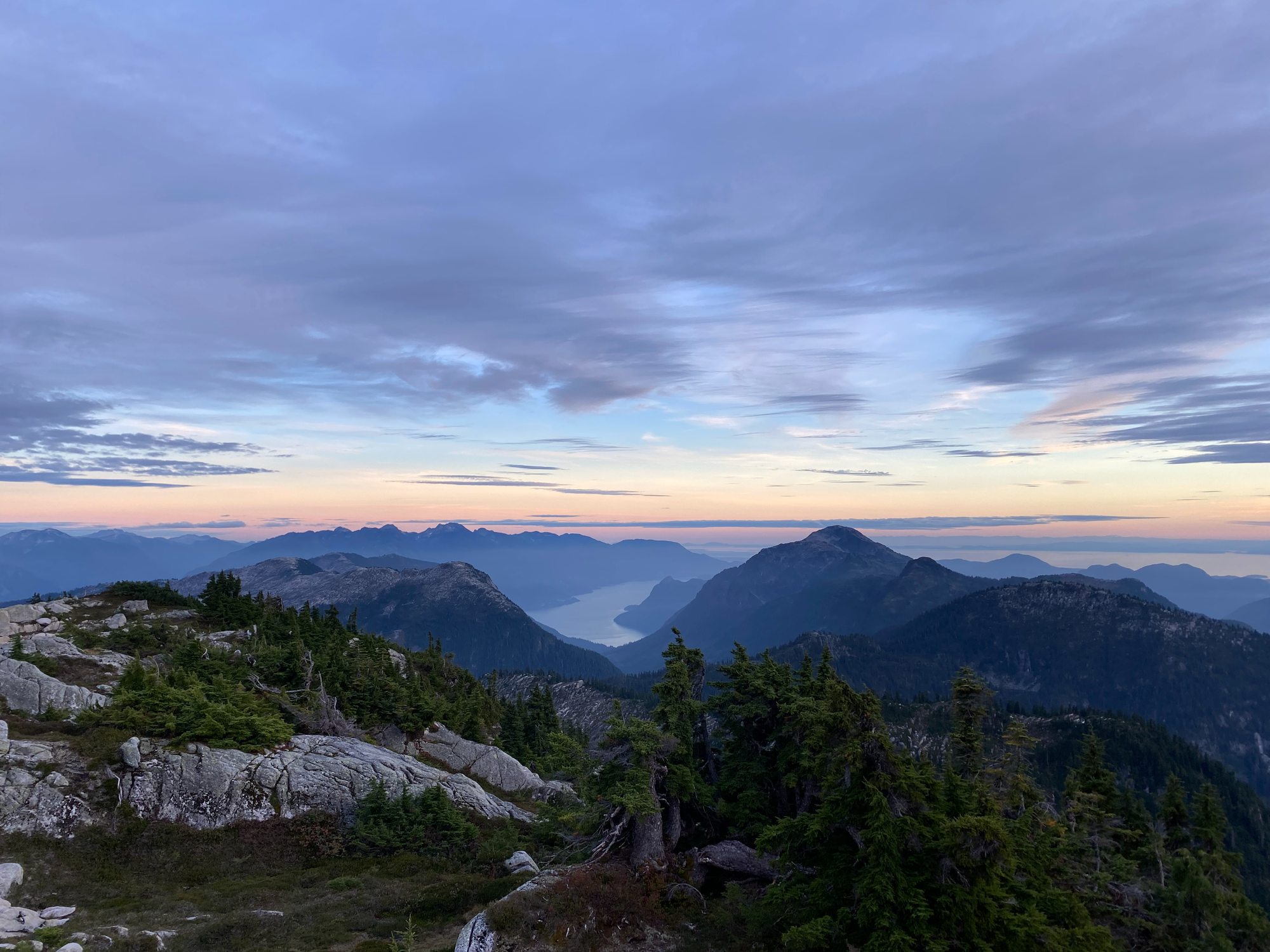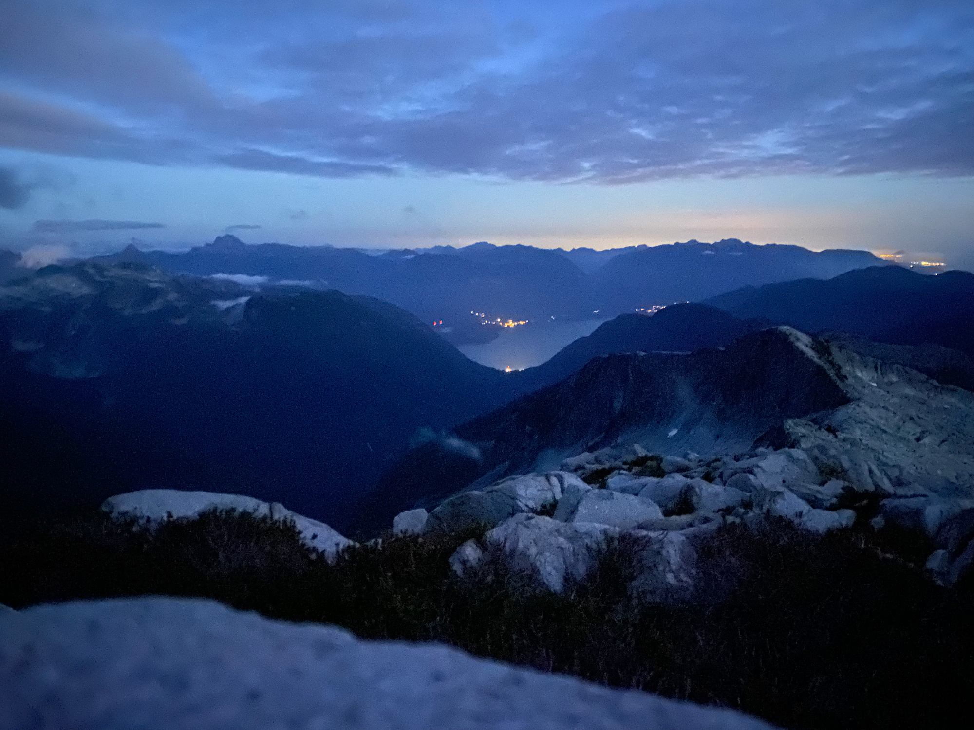 I’d planned to continue a bit further that day, but instead I decided to camp near the summit and come back if/when the clouds dissipated the next morning. From my campsite I could see the lights of Vancouver, Victoria, Nanaimo, and Britannia Beach, but my perch still felt extremely remote.