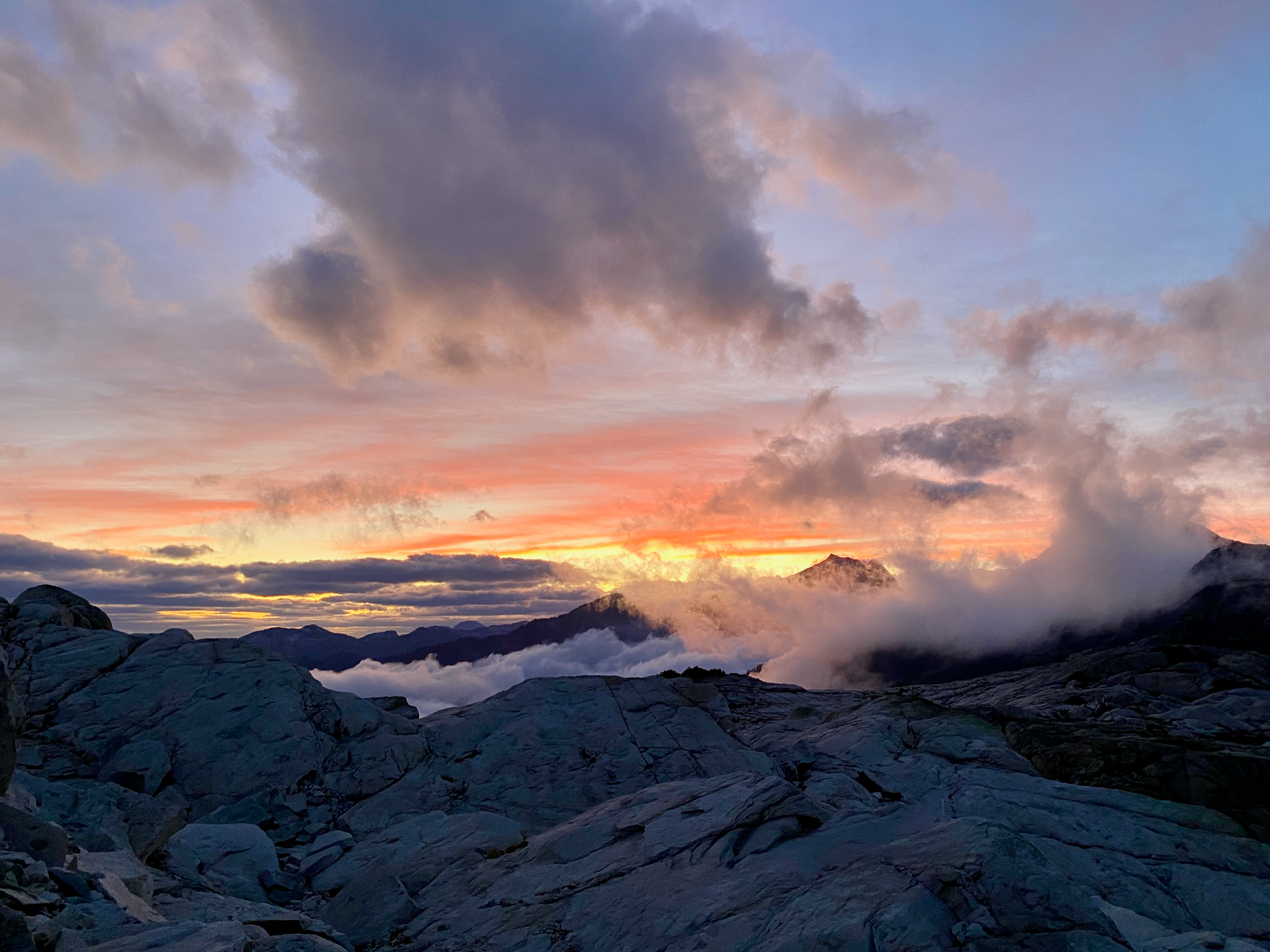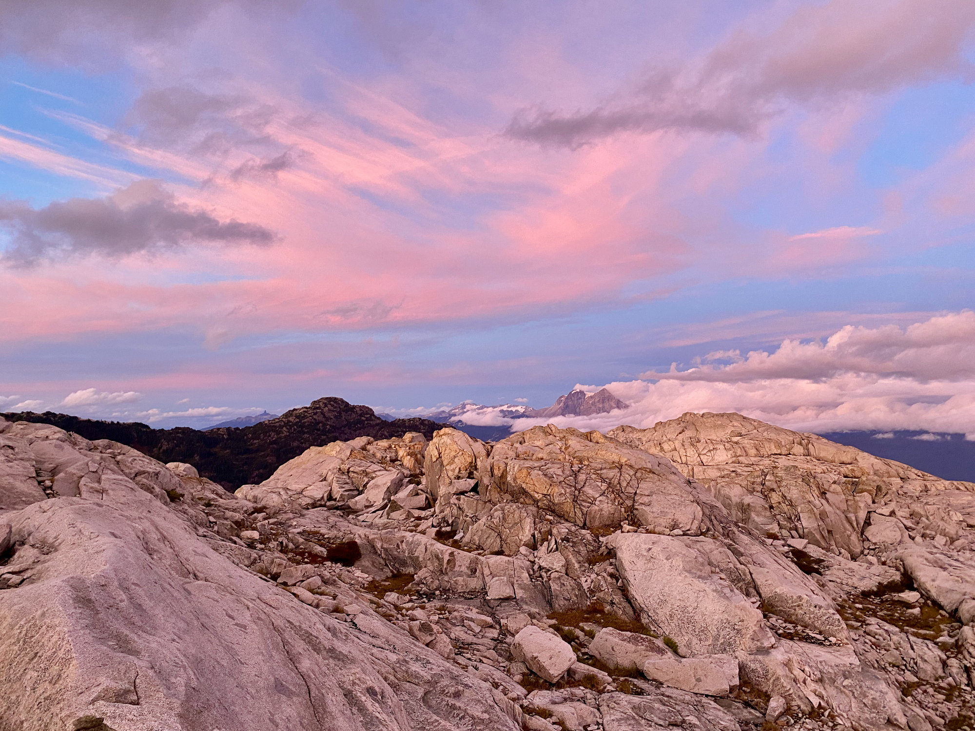 There was still about an hour of daylight left so I continued to the Lapworth-Murchison col and set up camp there. It was mostly easy ridge walking with a couple Class 2-3 sections. Just before sunset, the clouds cleared and I saw Mt. Sedgwick for the first time on this trip. Sunset was spectacular with a sea of clouds in the valley below Sedgwick.