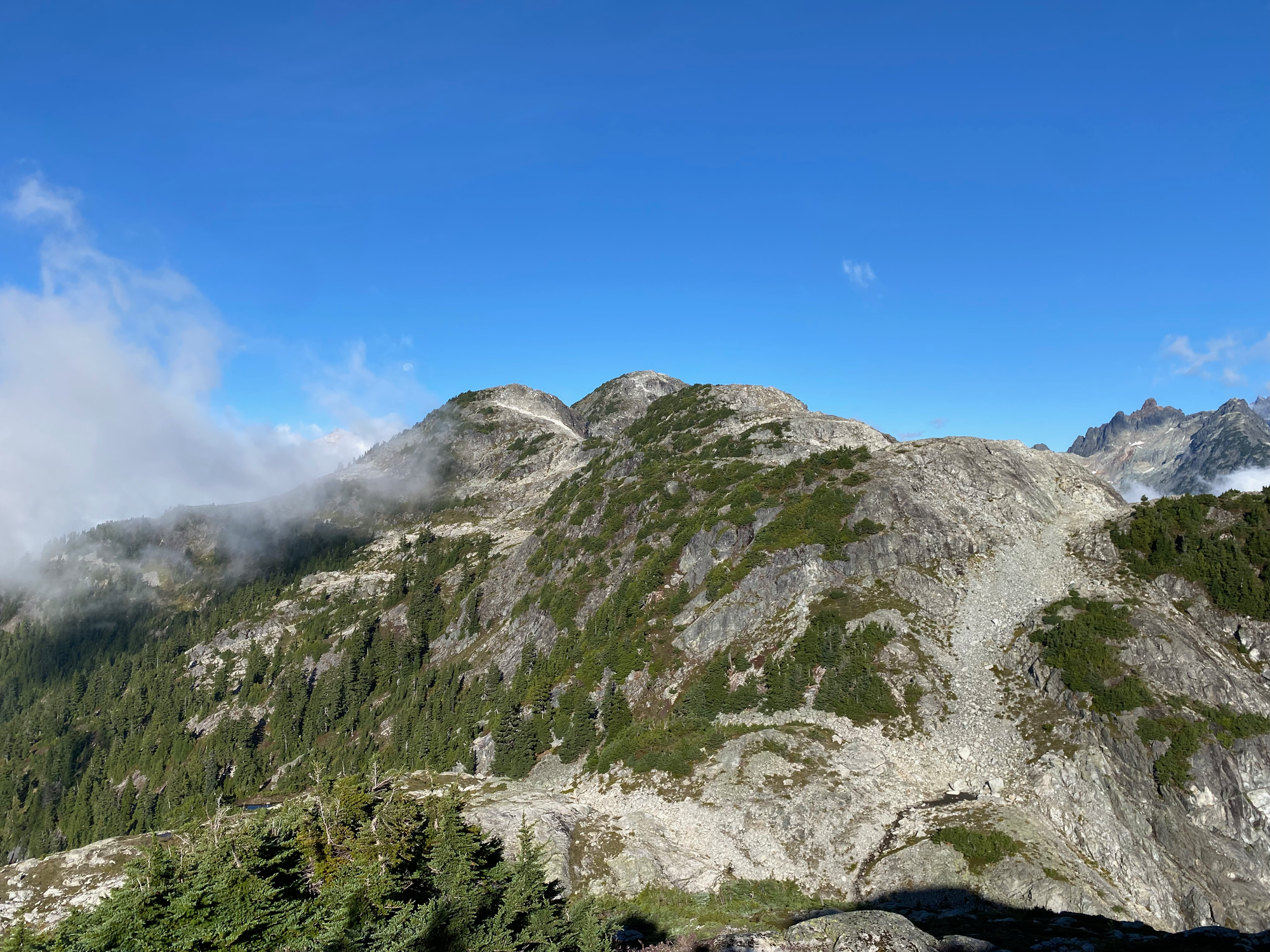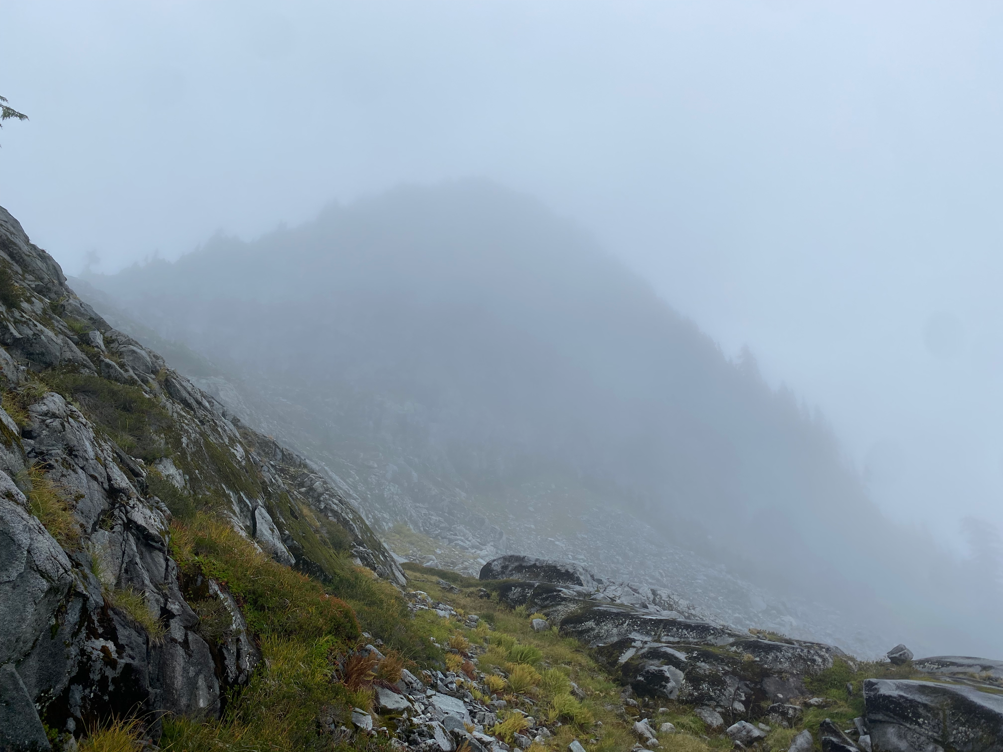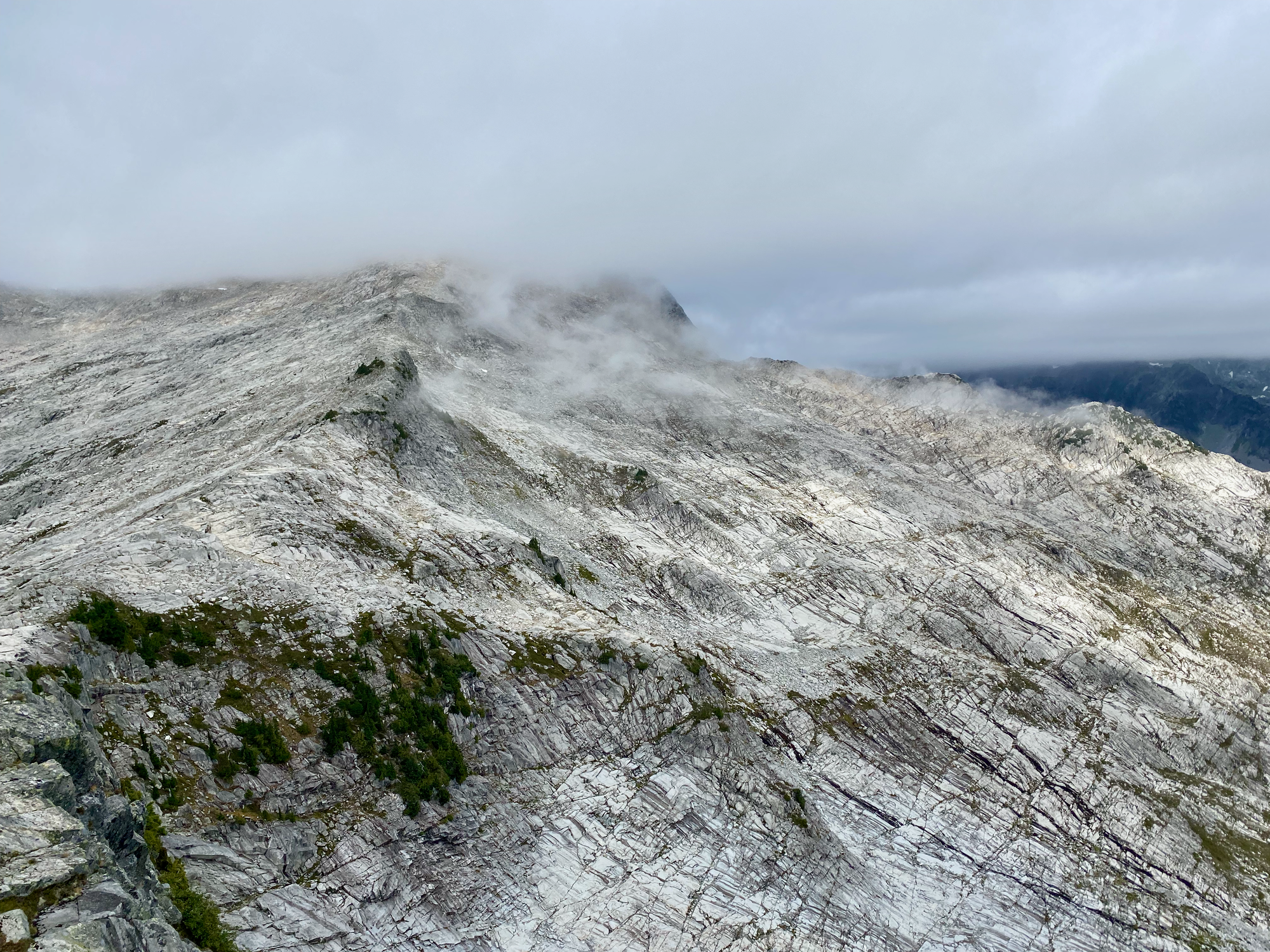 The ascent from the col to Sedgwick wasn’t technically difficult, but it did involve almost 800 vertical metres of elevation gain. I climbed to a bench at 1550m then traversed across Sedgwick’s massive southern face. Every few minutes the clouds would clear, giving me a glimpse of the castle-like summit ridge and the rock face sloping into the Woodfibre Creek valley hundreds of metres below. In the distance I heard the sounds of construction at Woodfibre.
