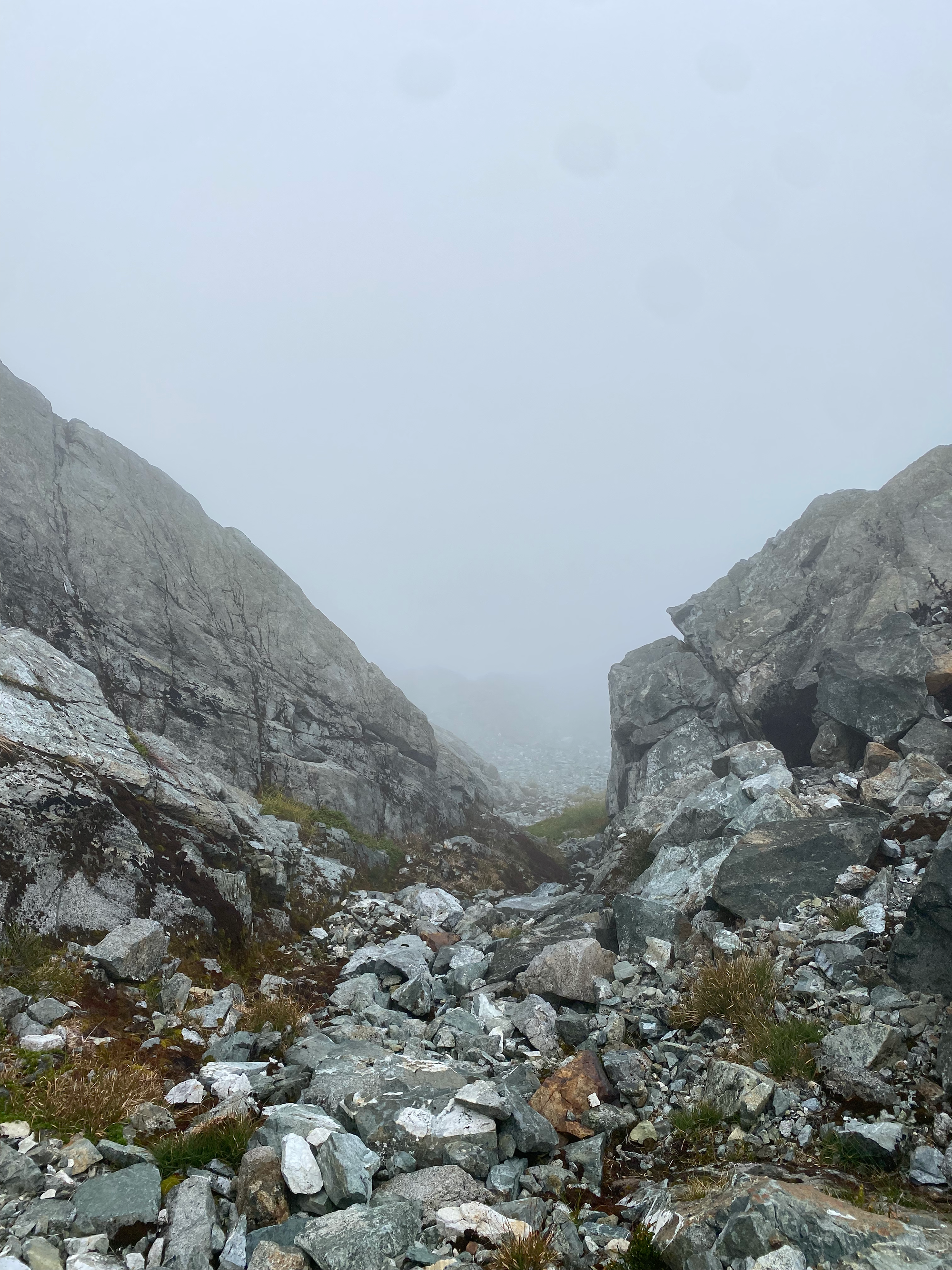 Visibility was quite poor, which made the descent from Conybeare more difficult than it needed to be. I descended a gully to the west, navigated a series of ledges to reach a boulder field around 1650m, then sidehilled to the ridge. Around 1530m I took a detour north to avoid a cliff. The ridge was rejoined at 1400m, and from there it was an easy, mildly bushwhacky, ridge walk to the col.