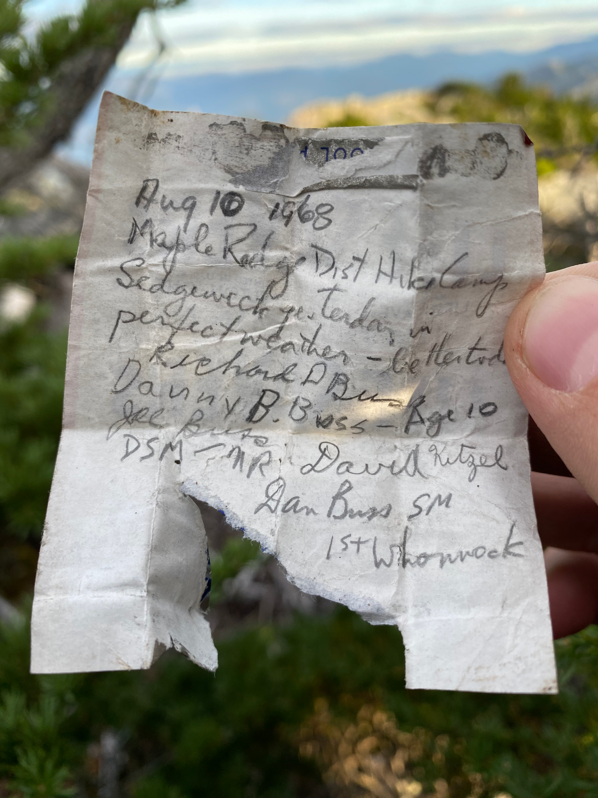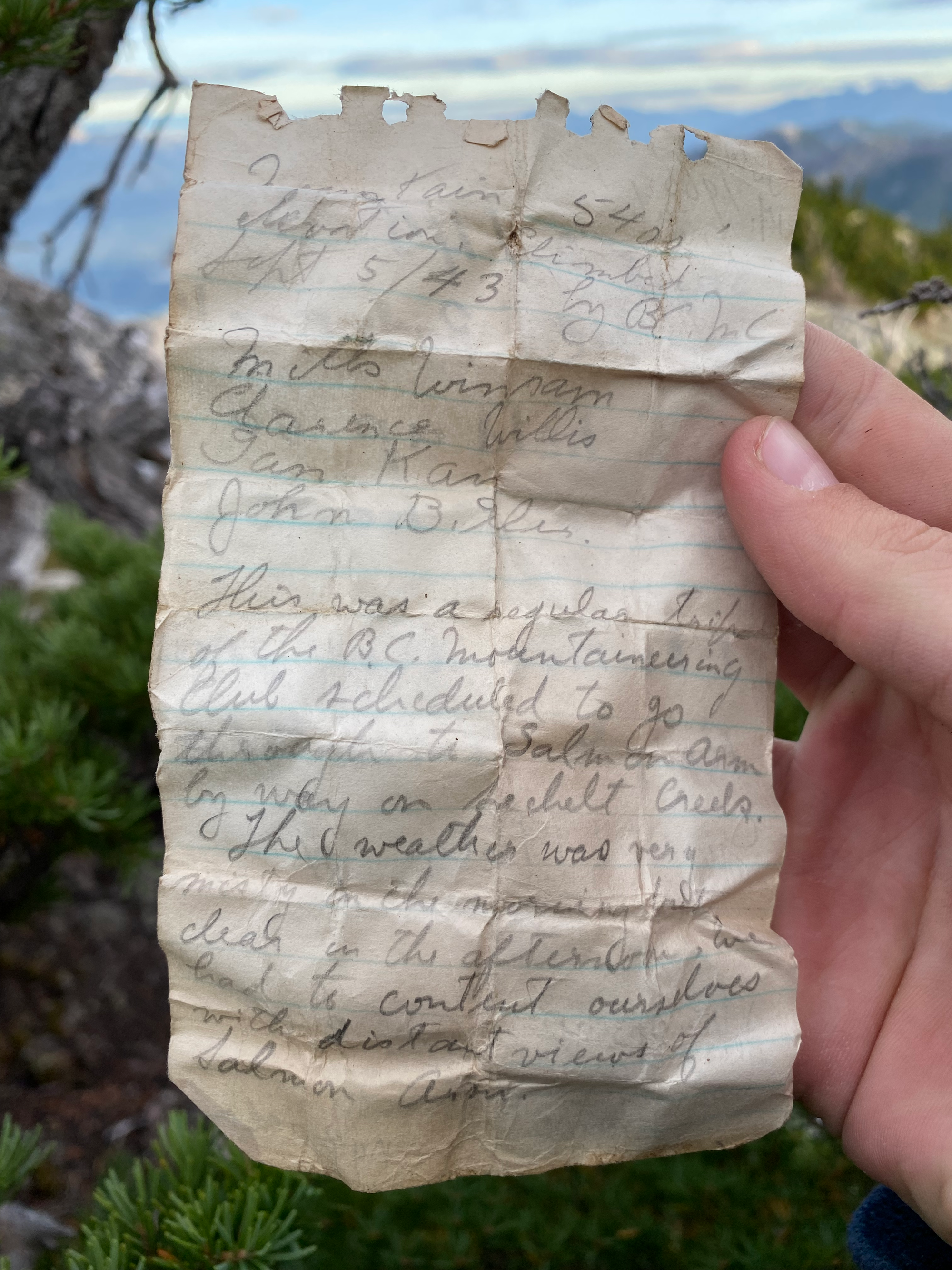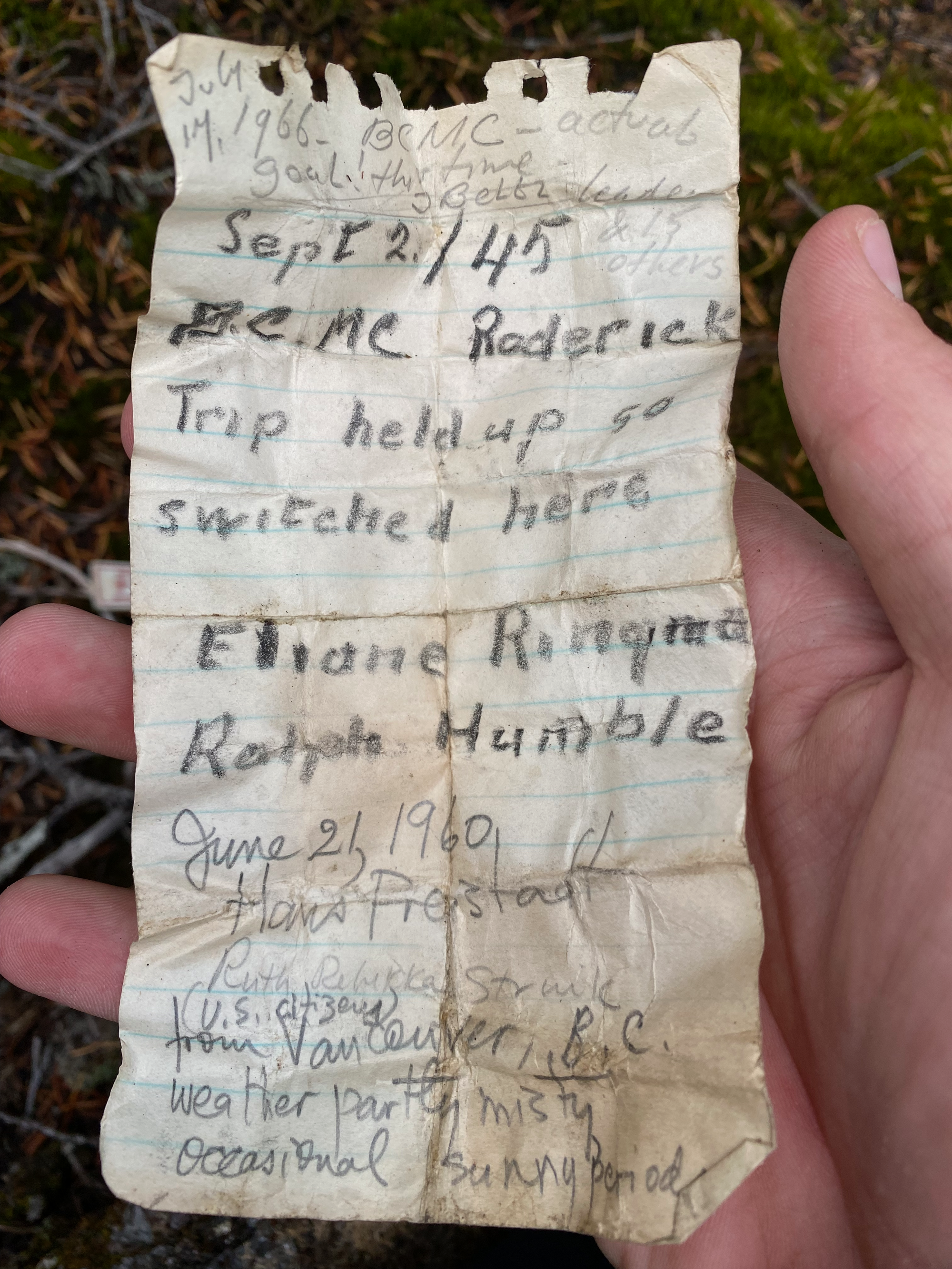 The highest point was a large boulder covered in krummholtz trees. Beneath one of these trees, a well-hidden cairn concealed a small canister containing a summit register. The oldest entry was a BCMC trip from 1943! There were no entries between 1974 and Thomas Morrissey’s trip in 2023.