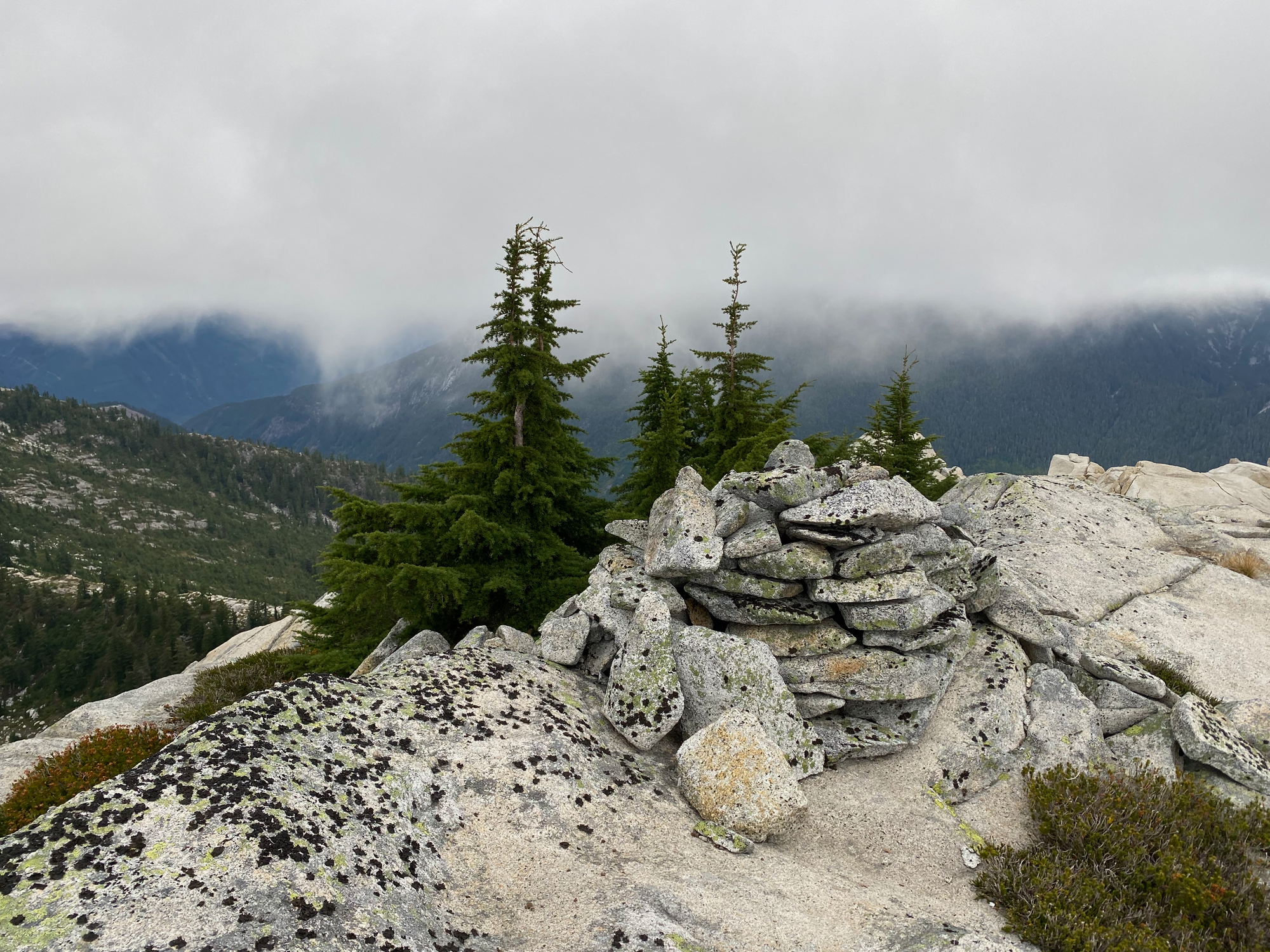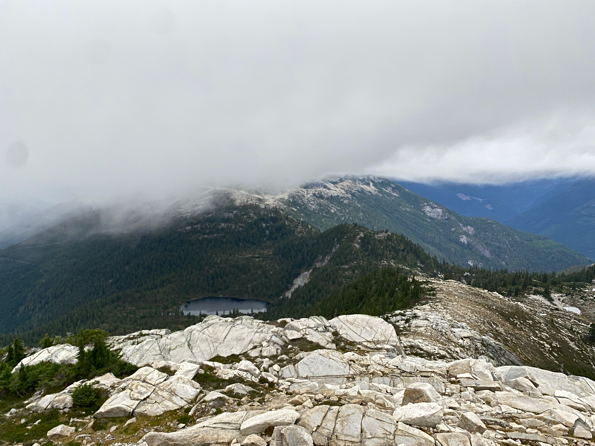 The summit of Lapworth was a granite dome. Through the clouds I caught glimpses of the southern Tantalus Range and an interesting perspective on Squamish. A circle of rocks surrounded the lid of a summit register container, but the rest of the container and the logbook itself were nowhere to be found.