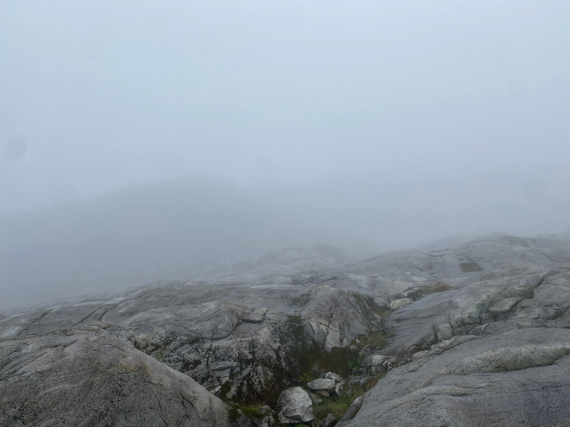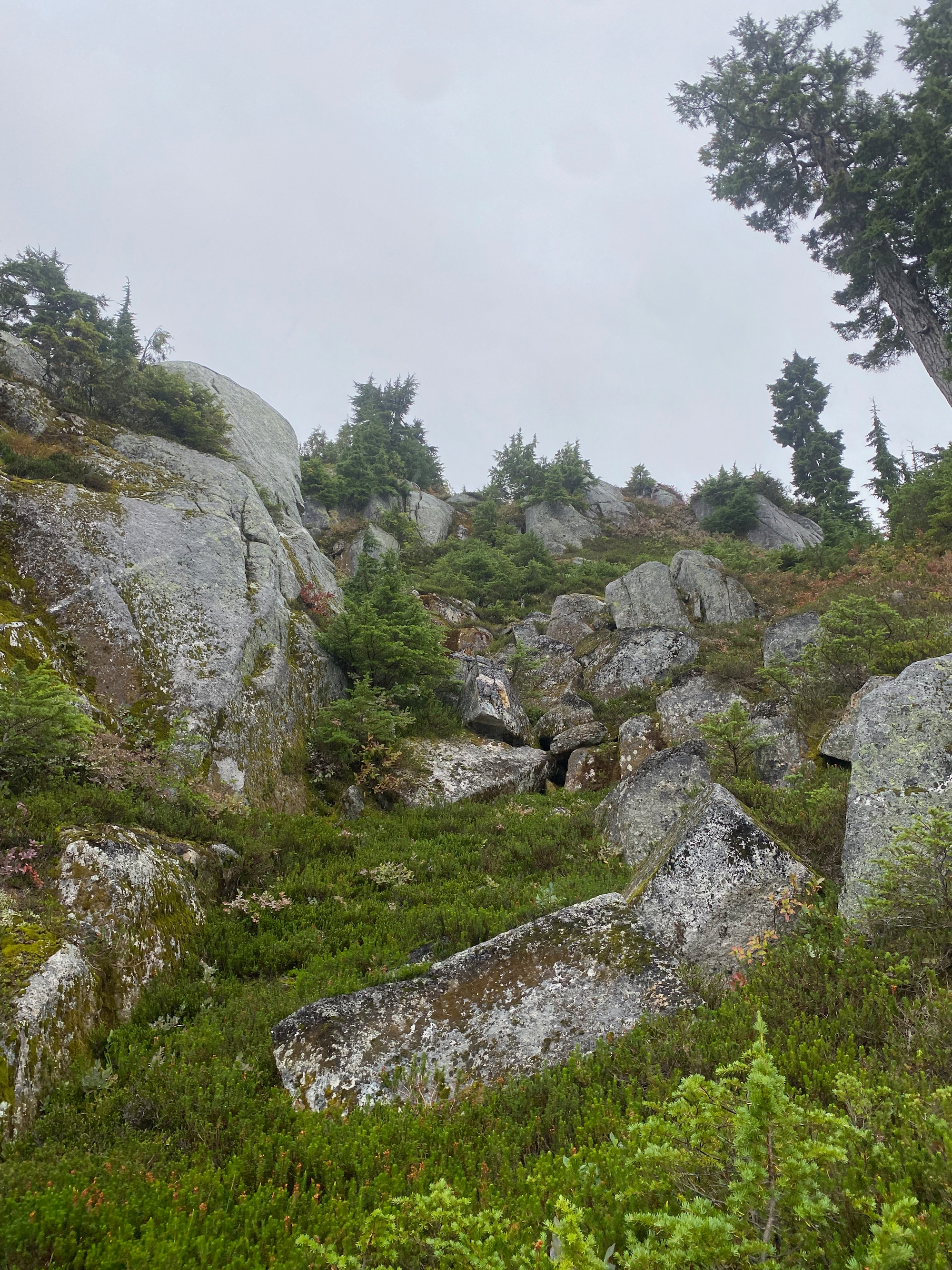A few small bluffs and micro terrain scrambles later, I was at the base of Mt. Varley. A granite wall loomed up in front of me so I traversed to the right (west) to gain the ridge. It turned out that this was only a false summit: the true summit involved a traverse along down-sloping blueberry bushes that would be straightforward in dry conditions but was a bit dicey in the rain. Throughout all of this the clouds never cleared and there were no views.