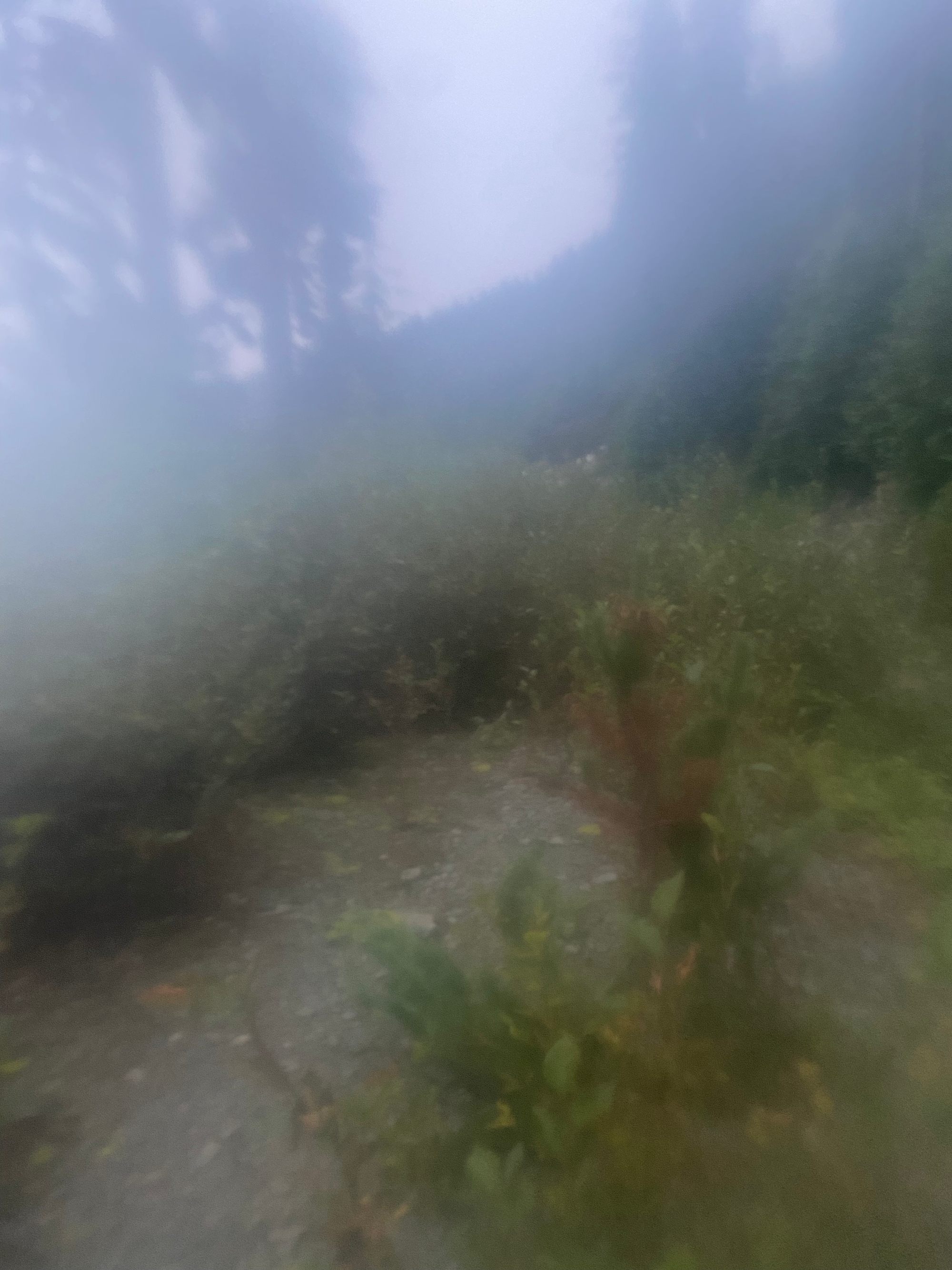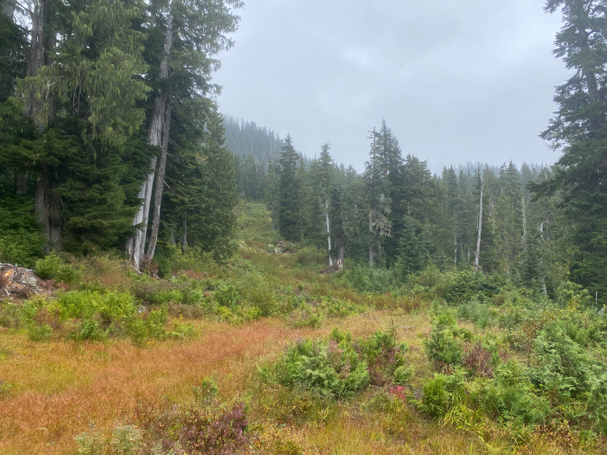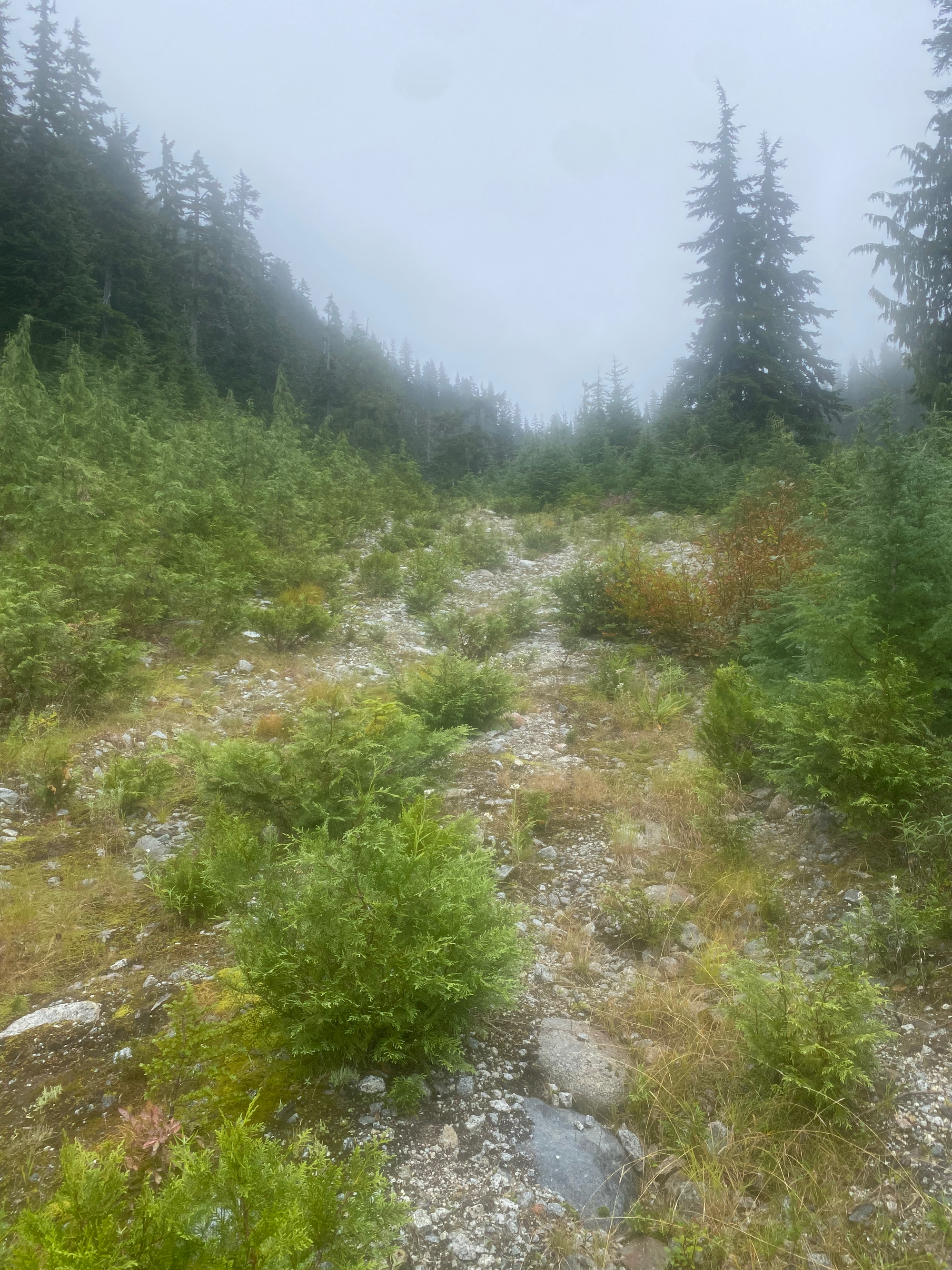 My original plan was to traverse over Sechelt Ridge, climb the extremely obscure Mt. Donaldson and “Slippery Peak” to the north, then descend from Donaldson to the FSR built for the Woodfibre pipeline. However, the latest forecasts indicated that clouds and rain would roll in mid-morning, and the rest of the trip would be in rainy whiteout conditions. There wouldn’t be any views, and scrambling something called “Slippery Peak” in rainy and slippery weather seemed like tempting fate, so I decided to bail to the pipeline road earlier than planned.