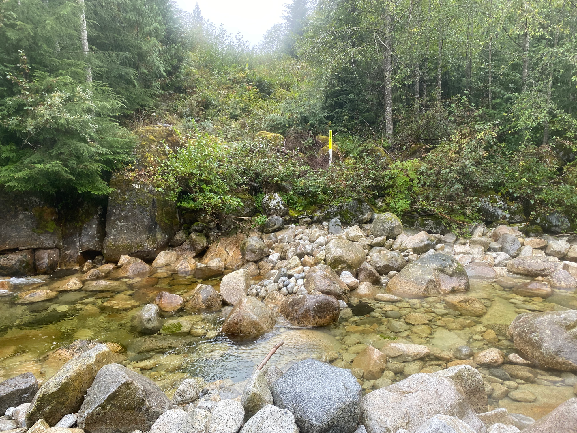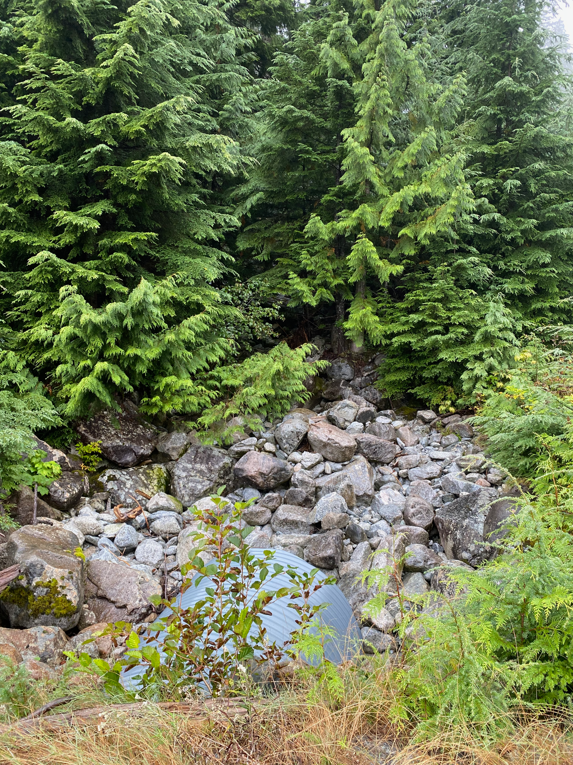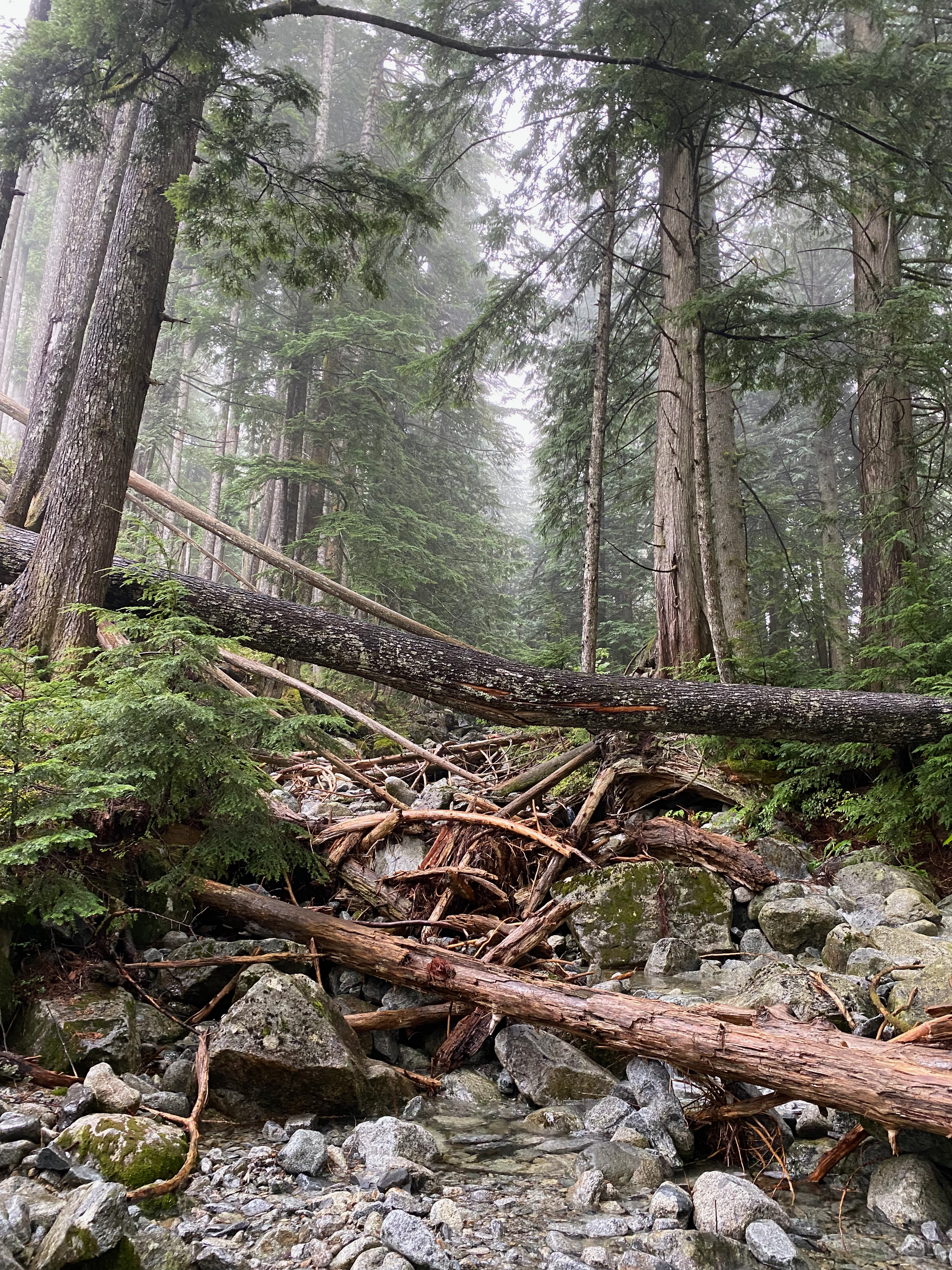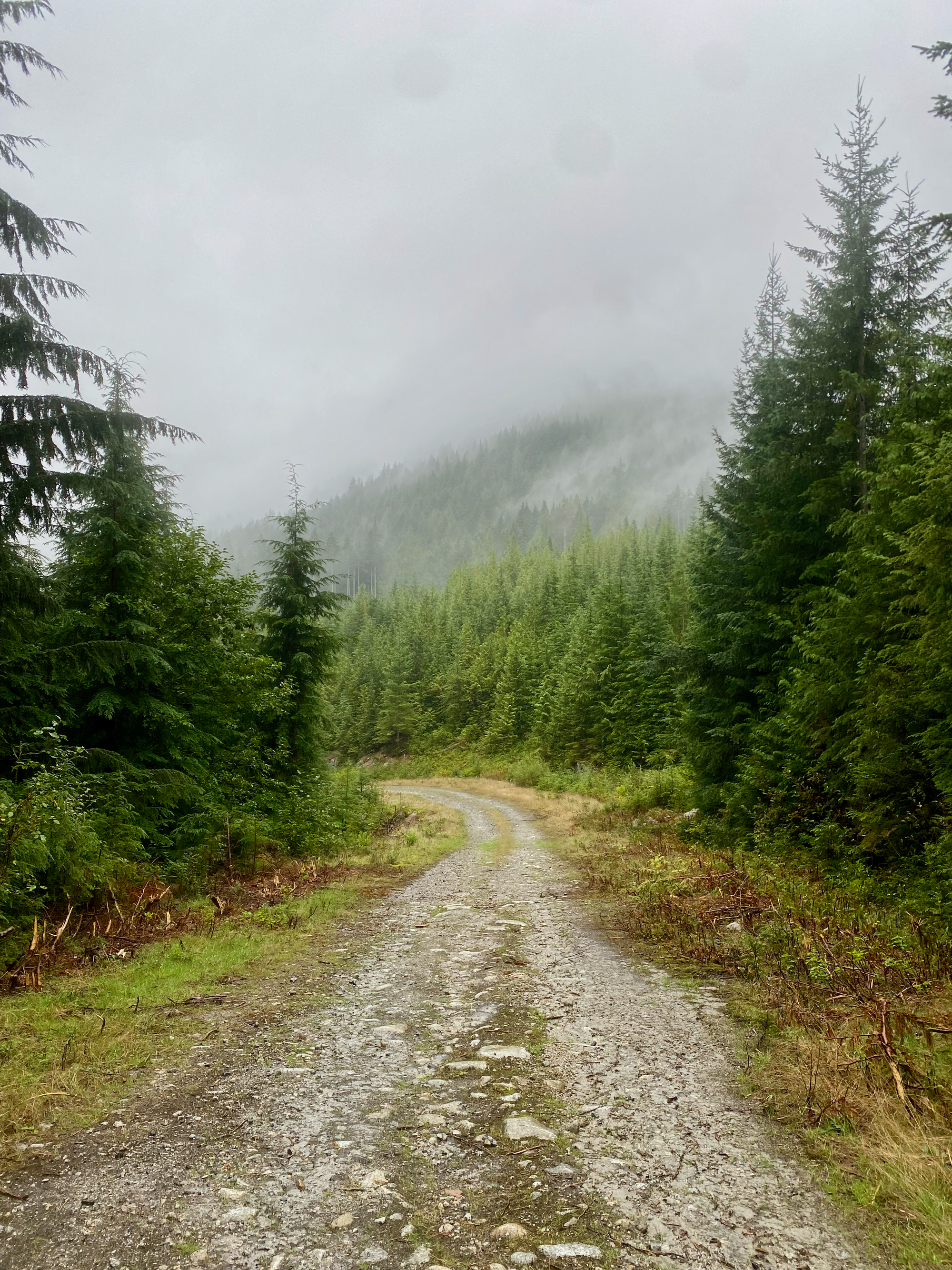 Thanks to logging and pipeline operations, a large array of new roads have been built recently, most of which aren’t shown on my maps or any mapping applications. Luckily I had recent satellite images of the area. The new road I was following split into several branches, which dead-ended at a powerline, but satellites showed another new road heading west on the other side of the powerline. This road had markers indicating the path of the LNG pipeline. A kilometre or so later, the pipeline markers continued along an abandoned road to the southwest, which I followed to Sechelt Creek. I walked through the creek, which was about ankle-deep, but I was so soaked that that made no difference. After about 50 metres I reached the McNab FSR which was in much better shape (could be driven by most cars). Note: about 200 metres to the northwest along McNab, there is a brand-new bridge over Sechelt Creek, which seems to connect to the road I left earlier.