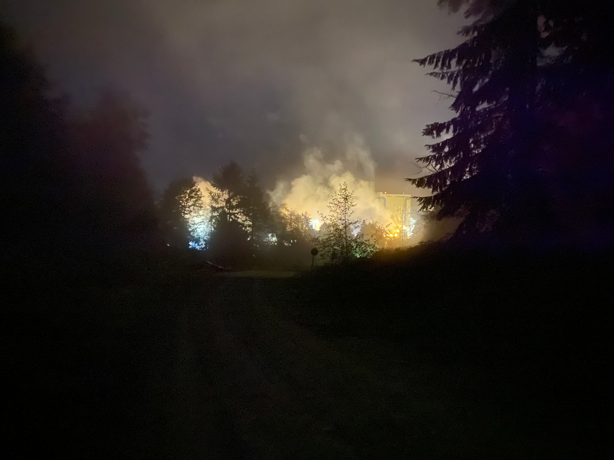 At the Rainy River FSR, I retrieved a previously stashed bike - hard to find in the dark - and biked about 7km to Port Mellon. Something was wrong with the bike; the front wheel was wobbling and at one point I wiped out. In the distance the lights of Port Mellon glowed like a wildfire. I eventually made it to the mill, biking past massive industrial plants.