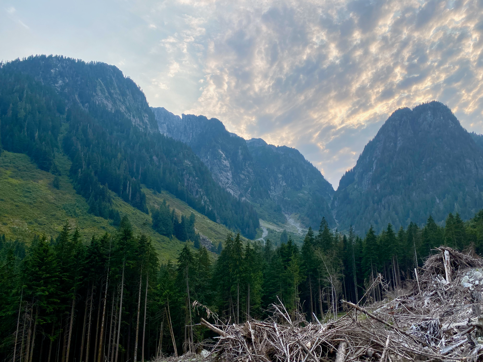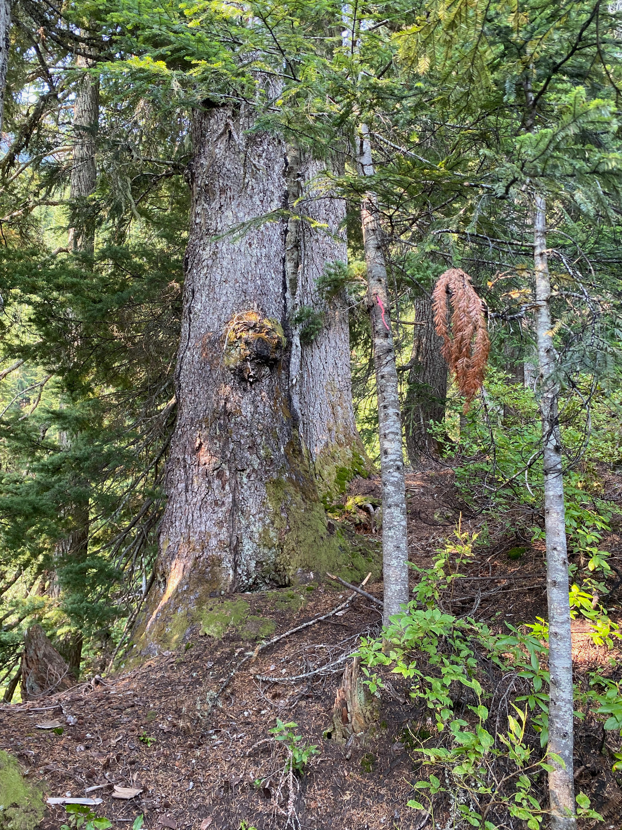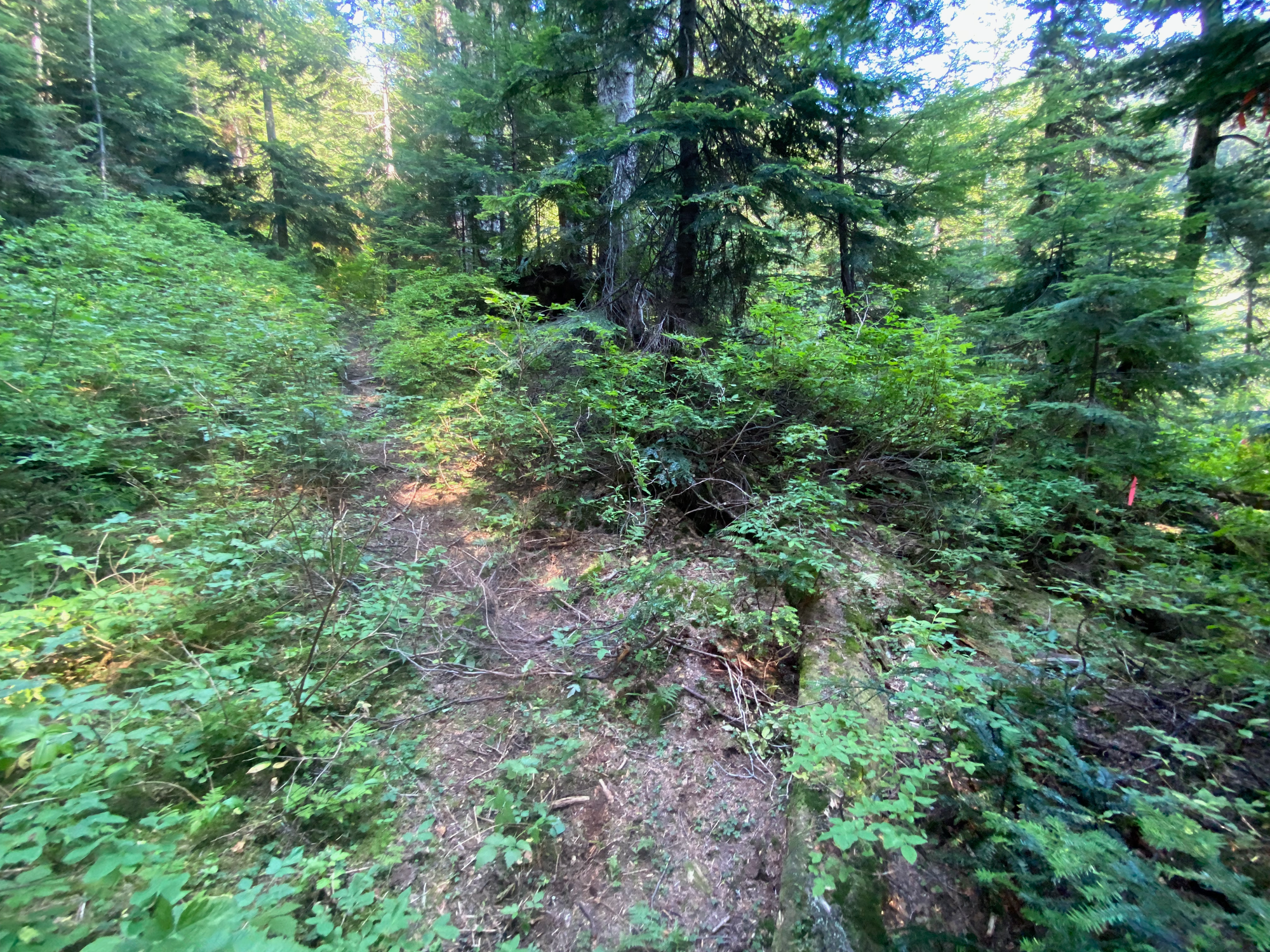 We walked along the FSR for a couple kilometres, then it ended in a clearcut and we walked into the woods. Sone bushwhacking was initially needed, but we soon found the faint trail, marked by orange and pink flagging tape. The trail soon connected with an old but easily navigable FSR, then left it and began a steep climb.