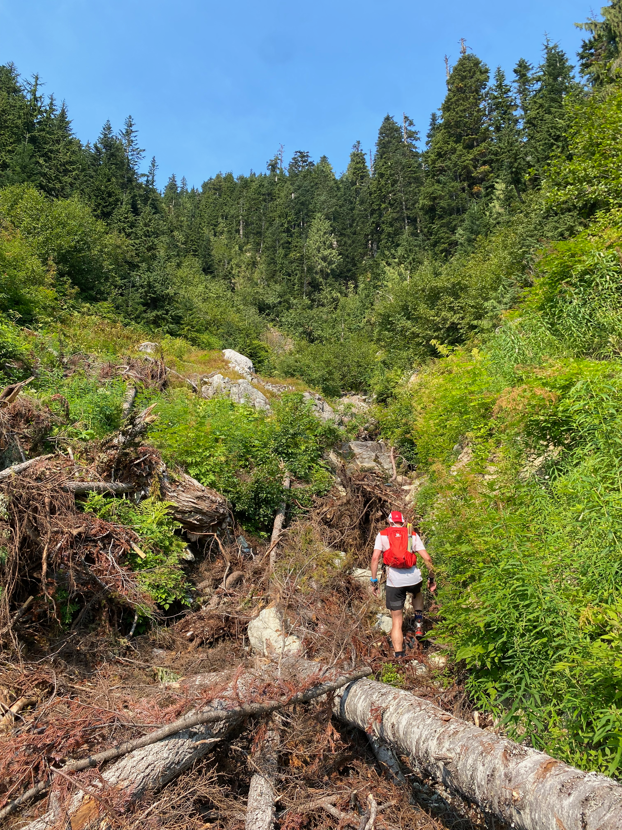 From Port Mellon, the FSR heads north into a valley ringed by massive cliffs. After about 8km we turned left onto a new logging road not marked on most mapping apps. Around 1.5km from Rainy River FSR, we bypassed a large rock on the road. Shortly past that, there were more rocks on the road and we had to park (at about 400m).