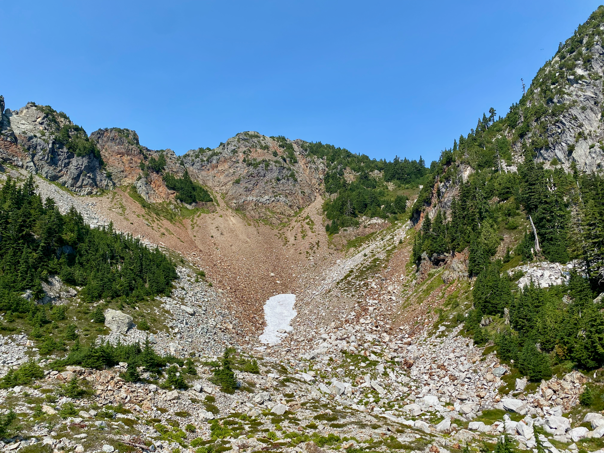 At about 1380m we reached a bowl below Tetahedron’s summit ridge. There is a small snowmelt-fed tarn here which would offer the last source of water.