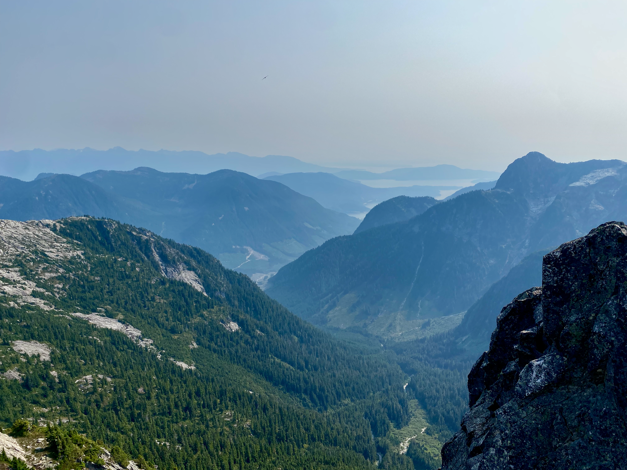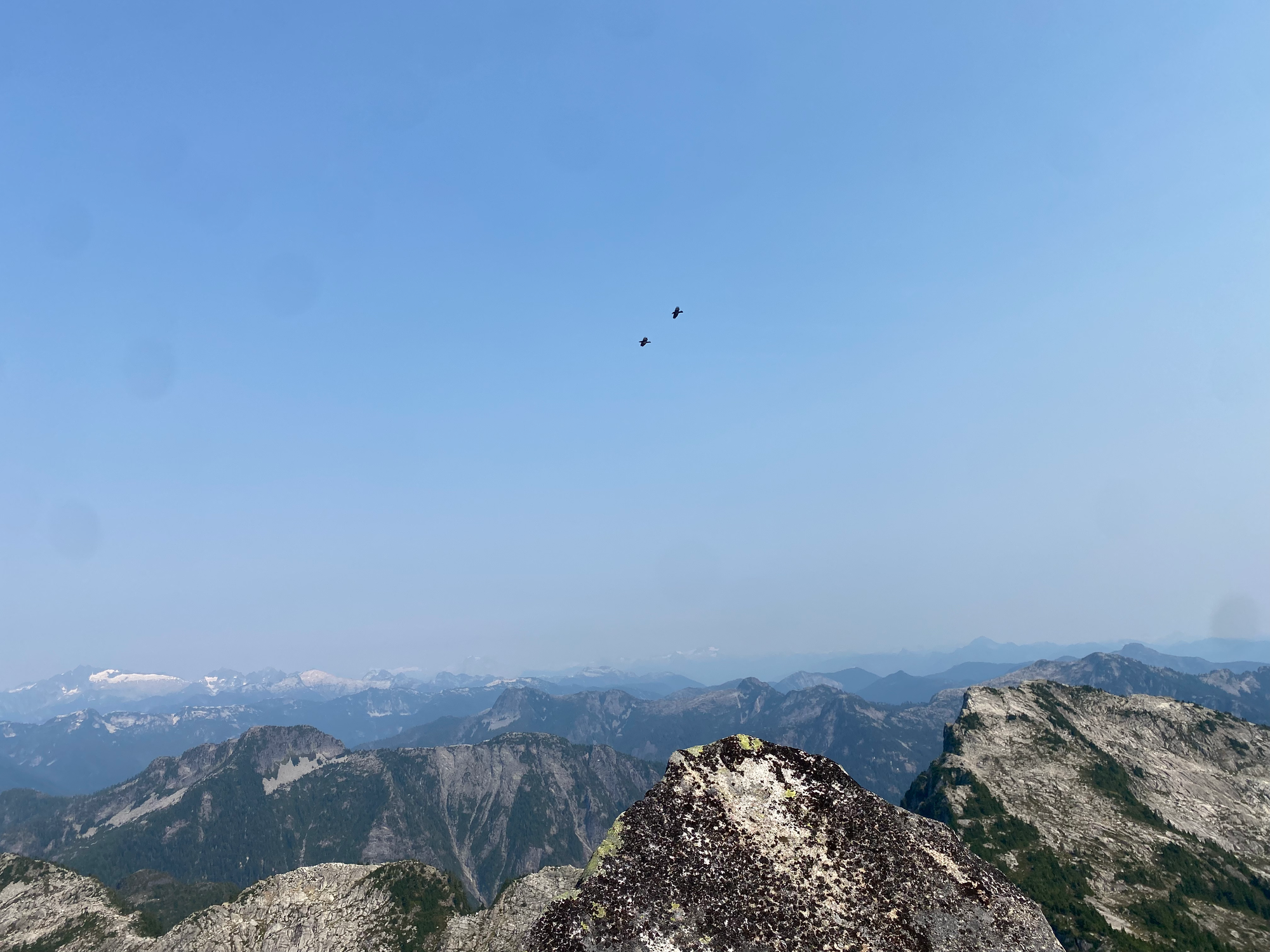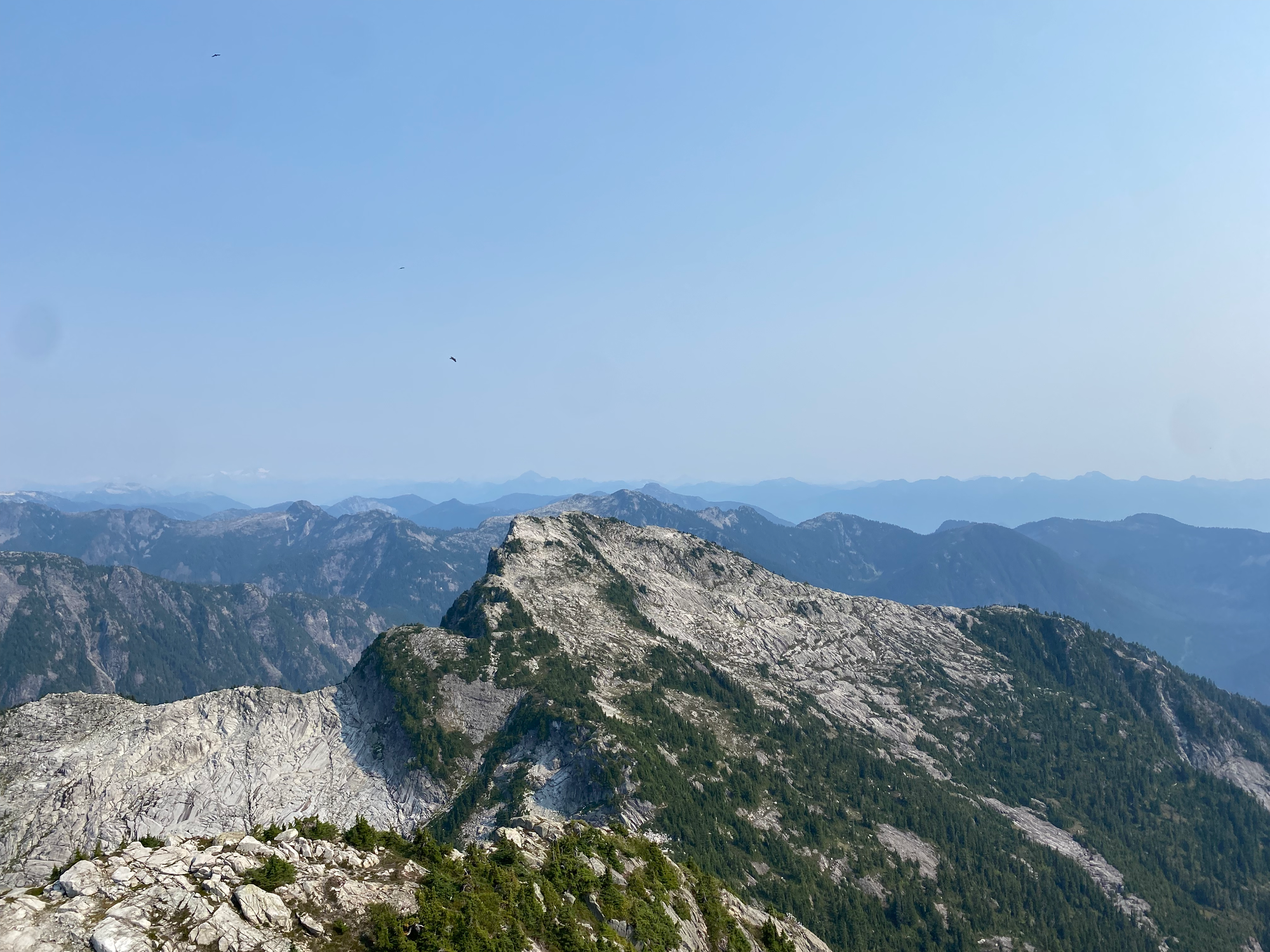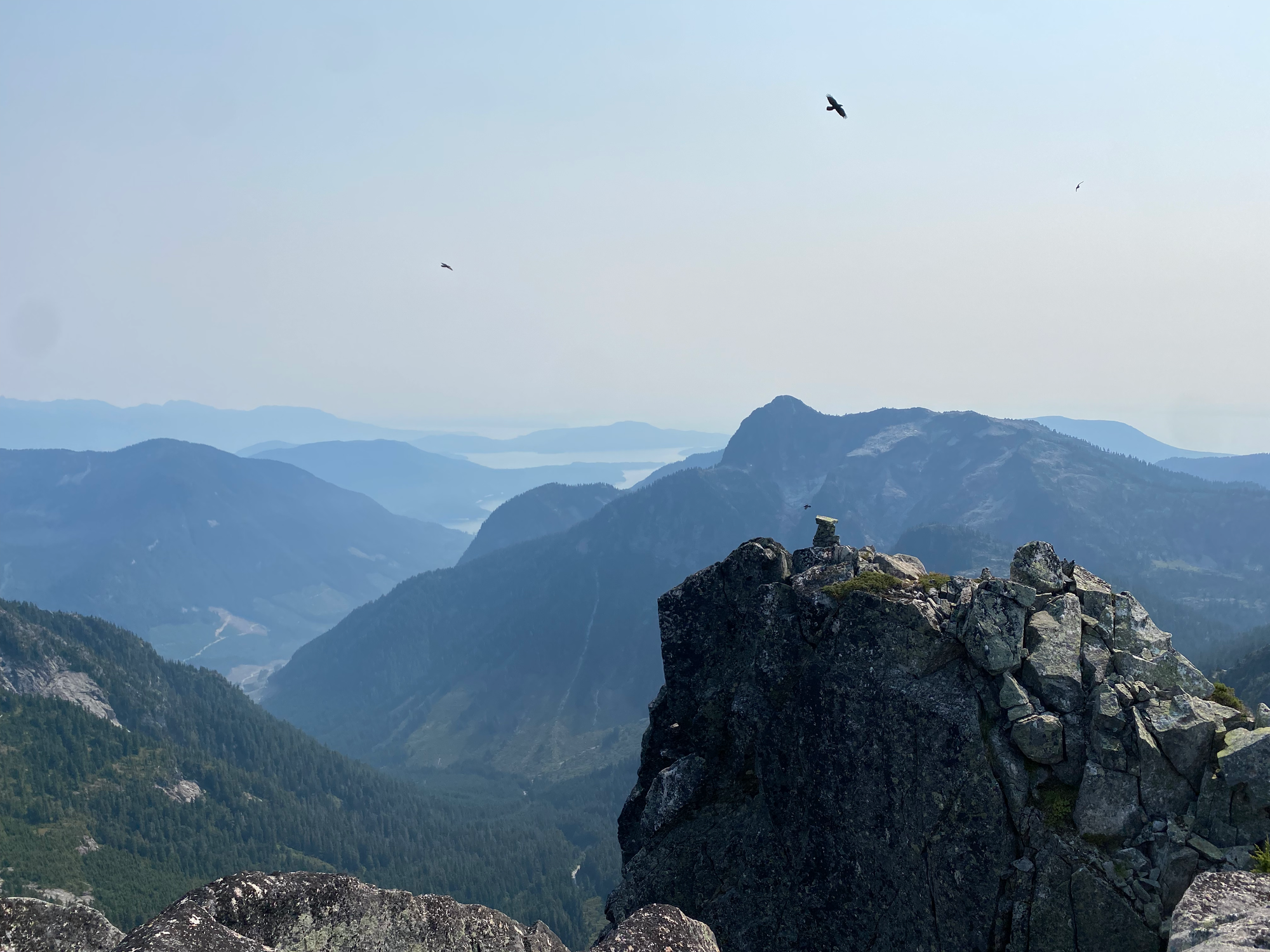 The air was quite hazy so views weren’t as extensive as they could have been, although we did get an impressive panorama of the Sunshine Coast, Tantalus Range, North Shore Mountains, and Howe Sound. Several ravens were circling around on the thermals, giving us a show.