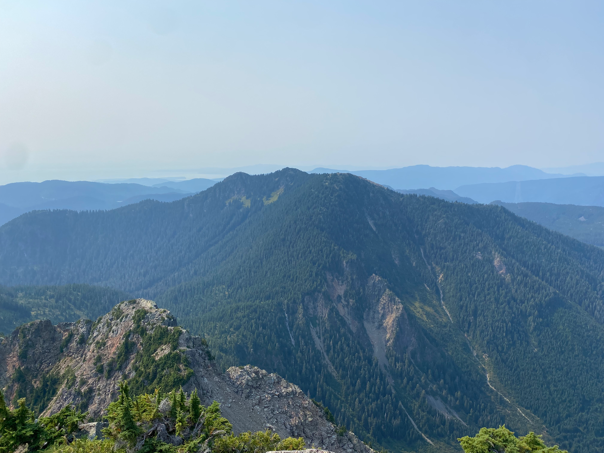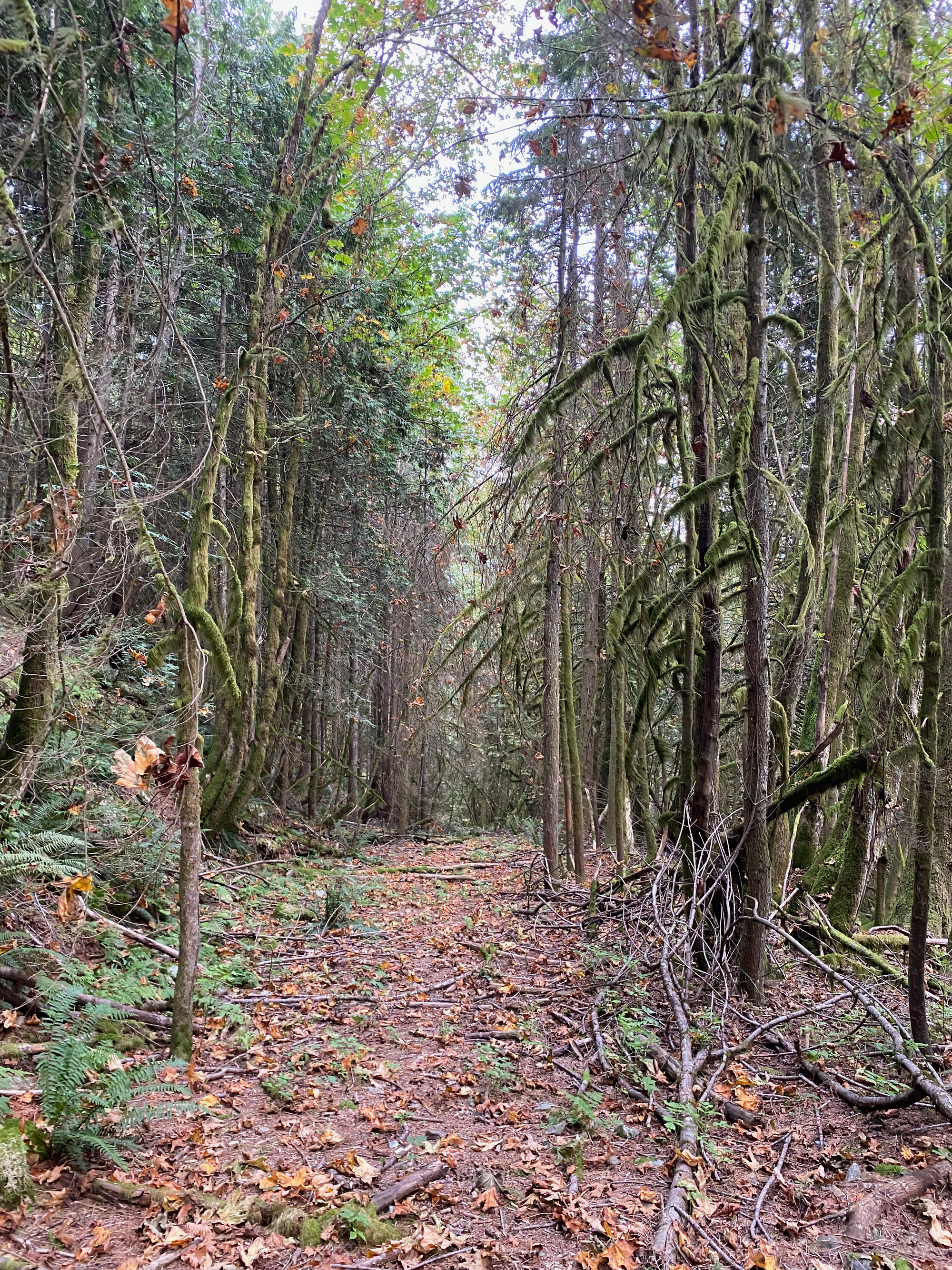 We descended at a reasonably fast pace to make sure we’d get back in time for the 8:15 ferry, slipping and sliding on the needles on the steep section. After leaving the old FSR, we ended up off the main trail, partly because the orange and pink flags seemed to go in different directions. This spit us out at the edge of a cutblock, from which we rejoined the main FSR and quickly returned to the car. After a quick side quest to stash a bike for another adventure, we drove back to Langdale in time for the ferry.