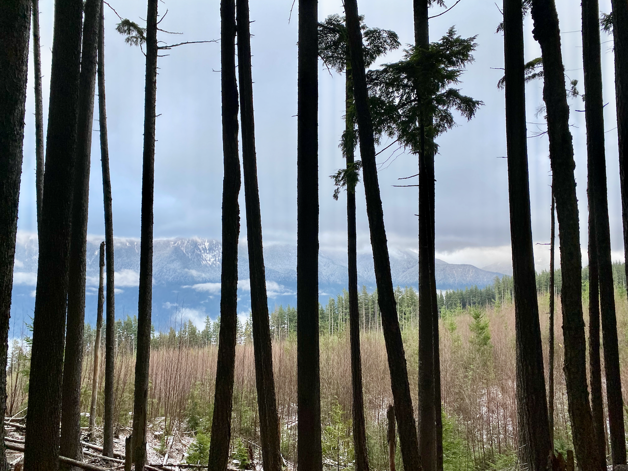 I woke up early and left town. I took the road to Cultus Lake, passing many RVs and billboards, then headed right (west) on Parmenter Road, passing a steady stream of trucks from the gravel pit. I drove up the Vedder Mountain FSR, which was recently graded and in excellent shape, and parked around 560m at the turnoff to Tower Road.