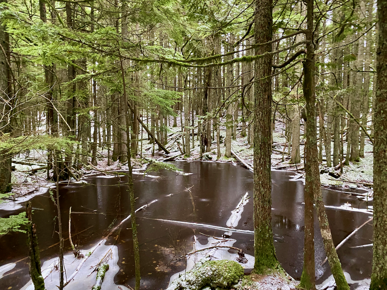 From this point, the trail continued southwest along the ridge, through third-growth forest, past ponds and rock outcrops. There are some short side trails to viewpoints. After about 700m there was a small amount (<5mm) of snow.
