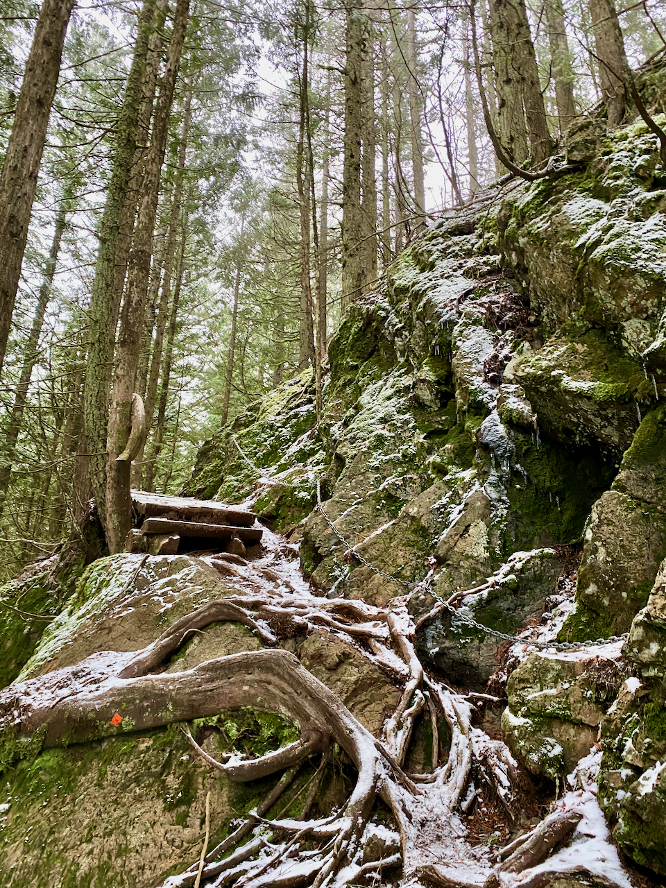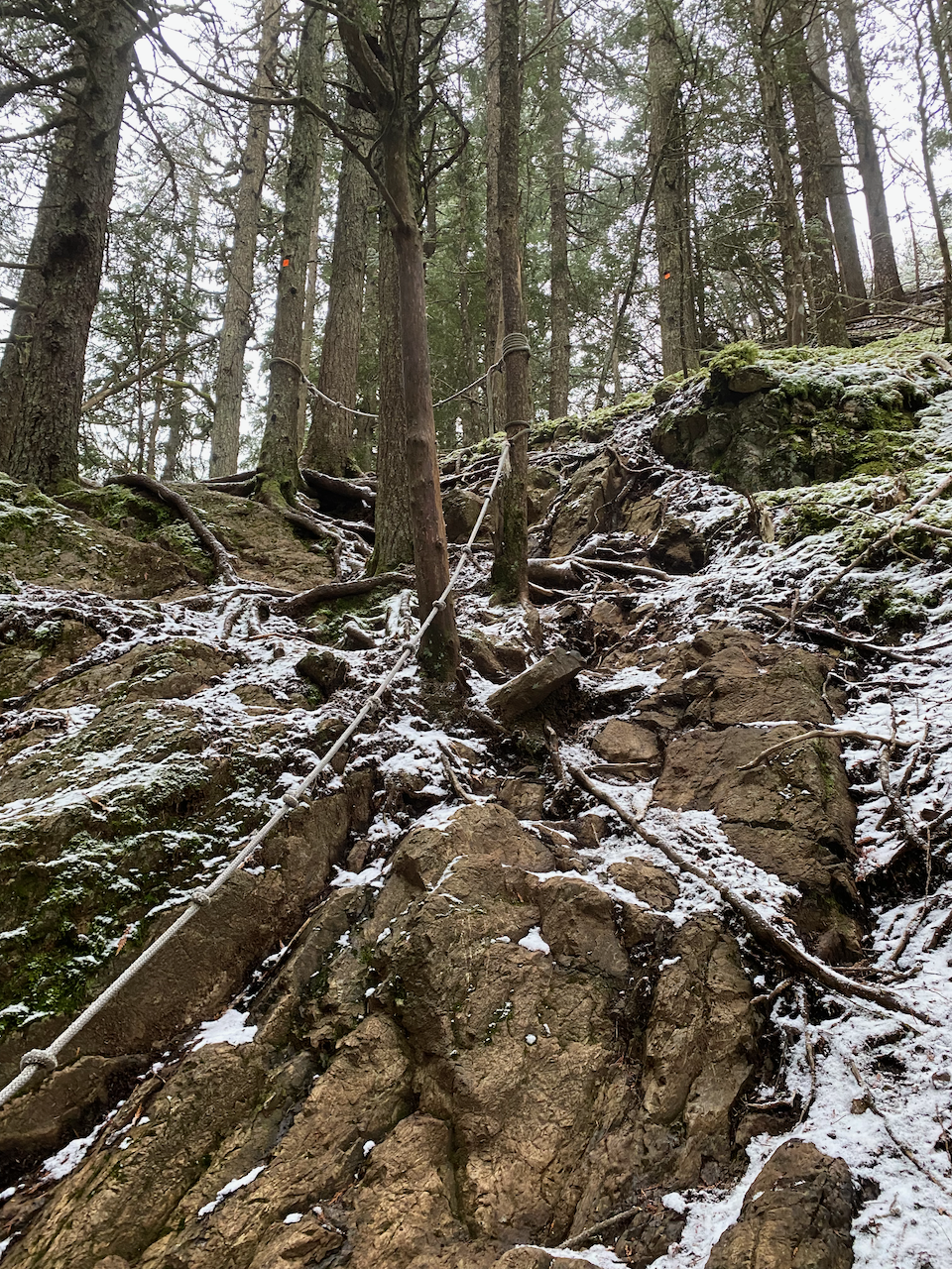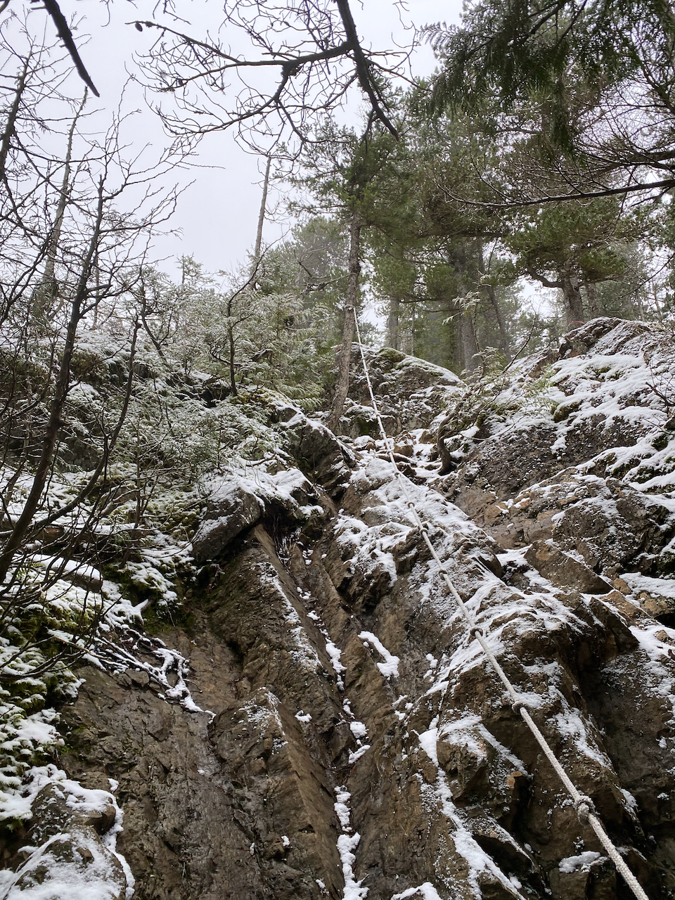 The trail curved around a large pond, then climbed to a junction with another trail. The final push to the summit involved three short sections of class 2 scrambling. Each section has a fixed rope attached. There was more snow here, making the rocks quite slippery, and I might have used the fixed ropes at a couple points…
