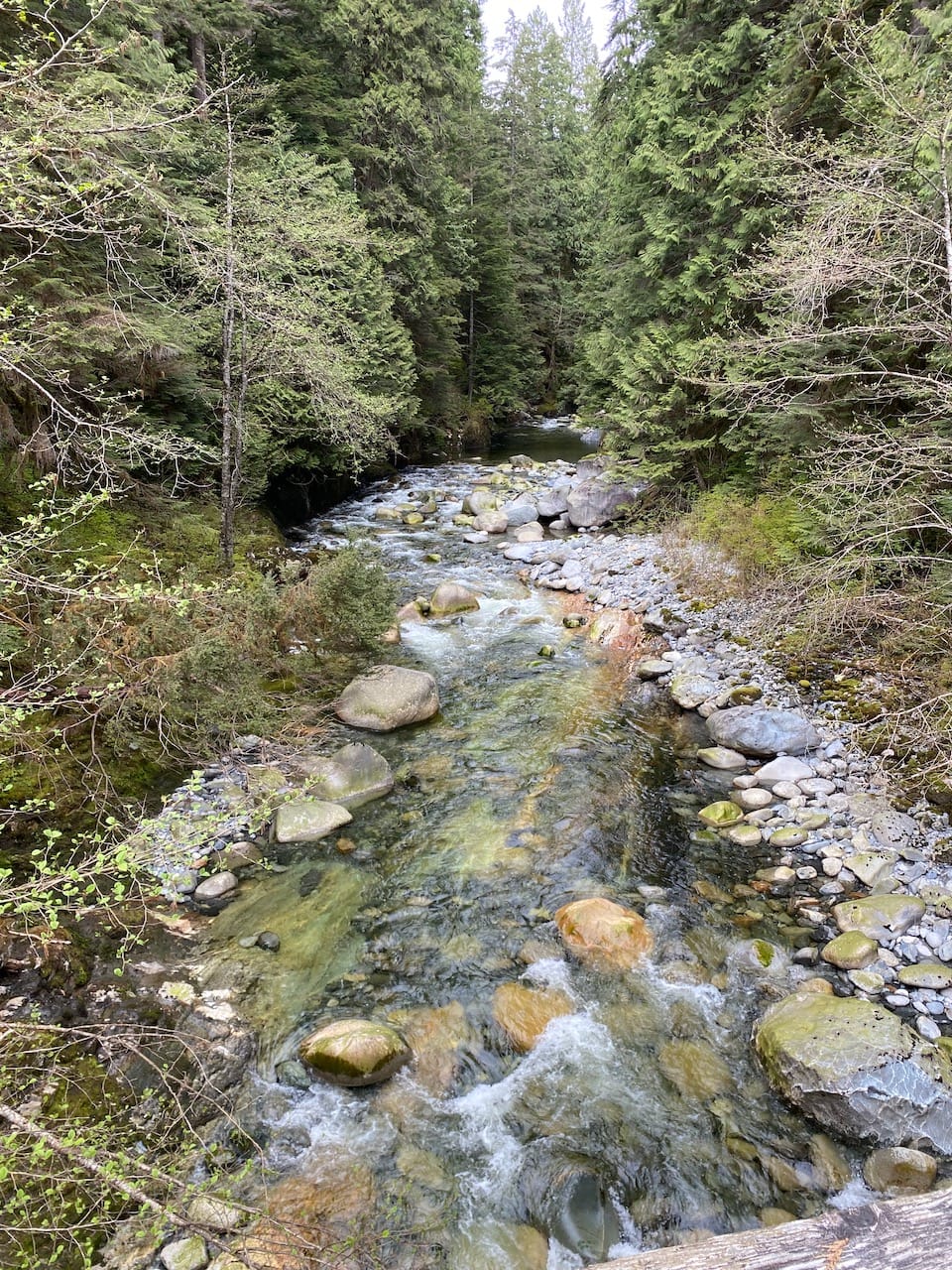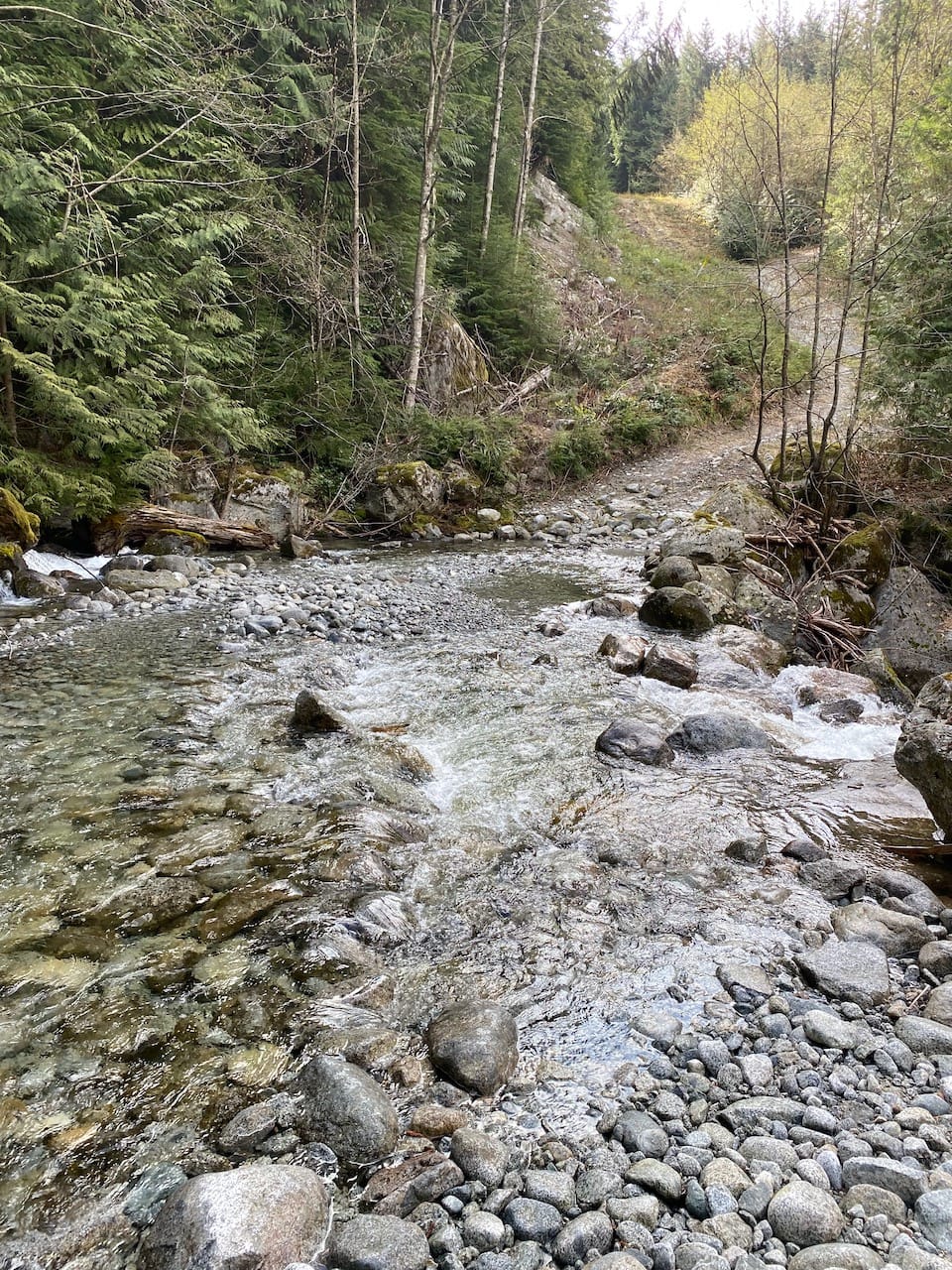 Like on previous visits, the main Rainy River FSR was in good shape, and would be accessible for a careful 2WD driver. After about 8km I turned right on a new spur road not shown on most online maps. This was steeper and had many loose rocks but I was able to get to a creek at 480m elevation. There was a large rock in the creek that would’ve damaged the car so I decided to park there. (The rock was gone when I returned.)