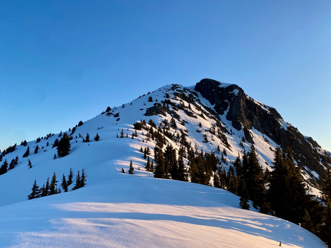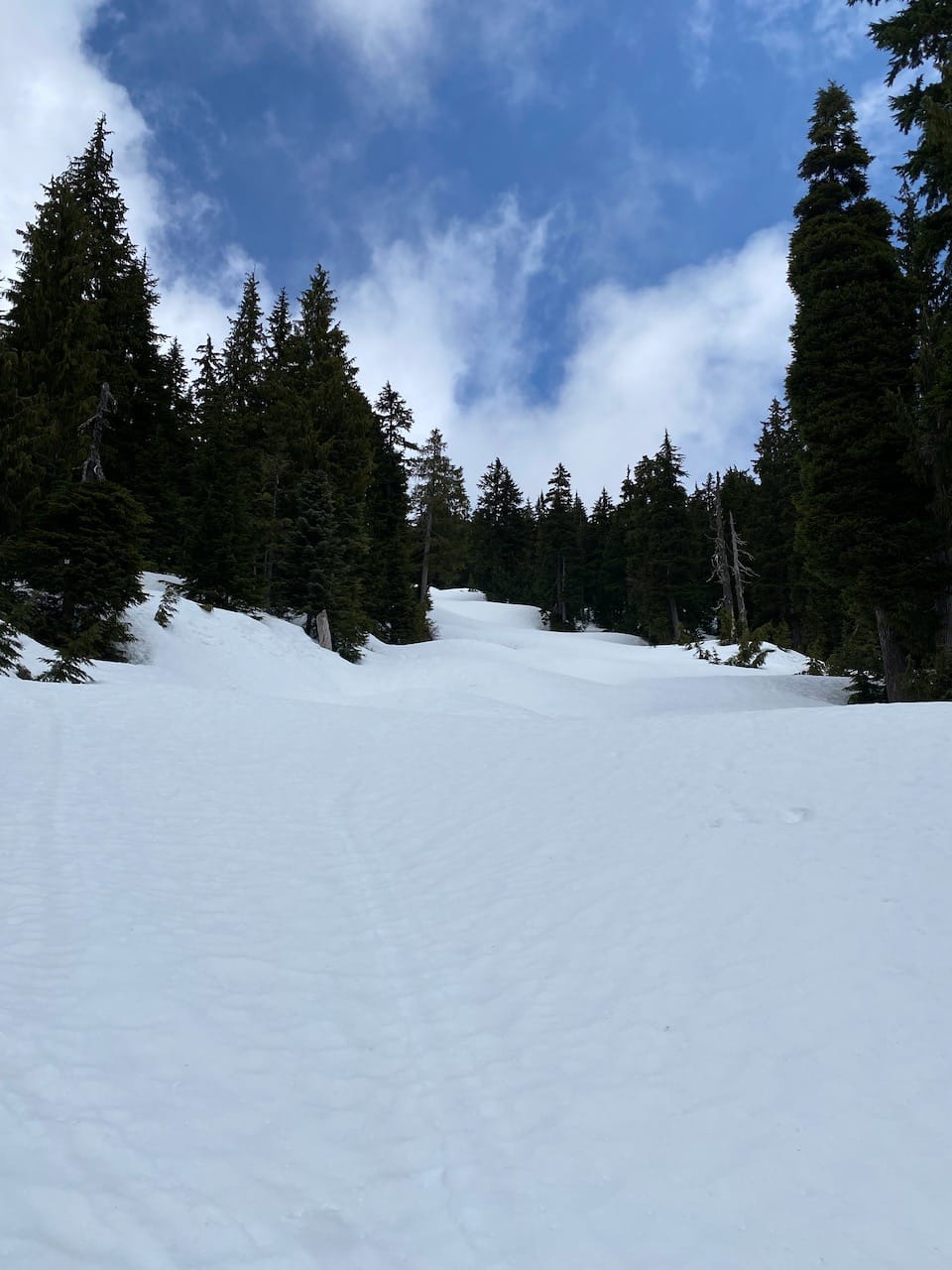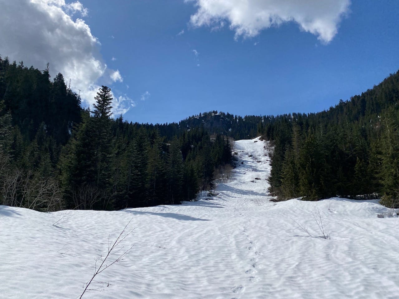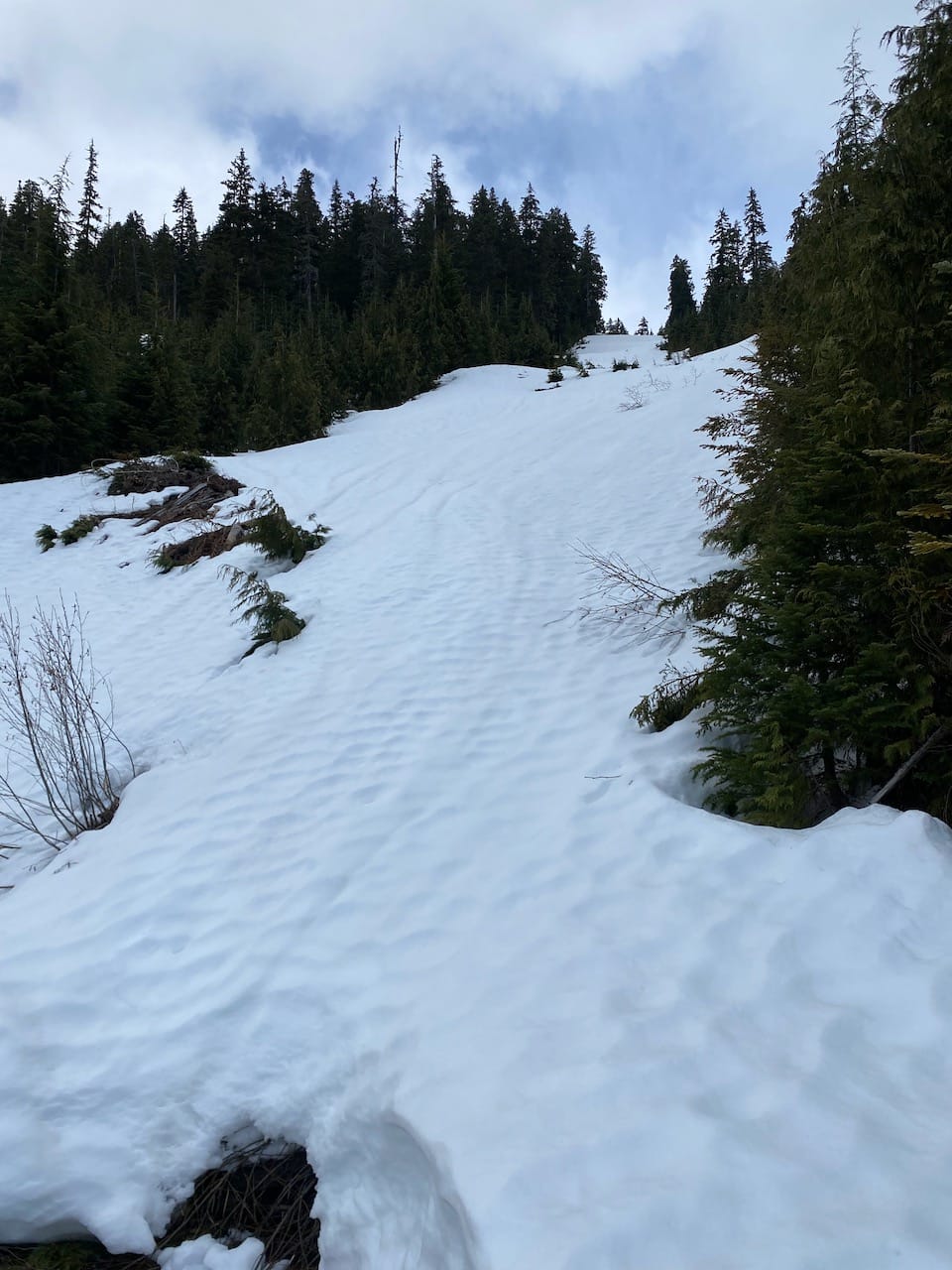 I descended the other side, glissading in spots, until I hit a snow-covered logging road. It reminded me of Zoa Peak’s pipeline, only steeper.