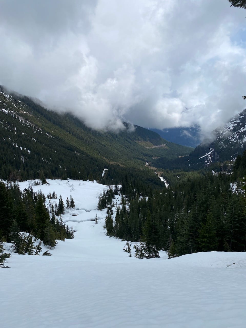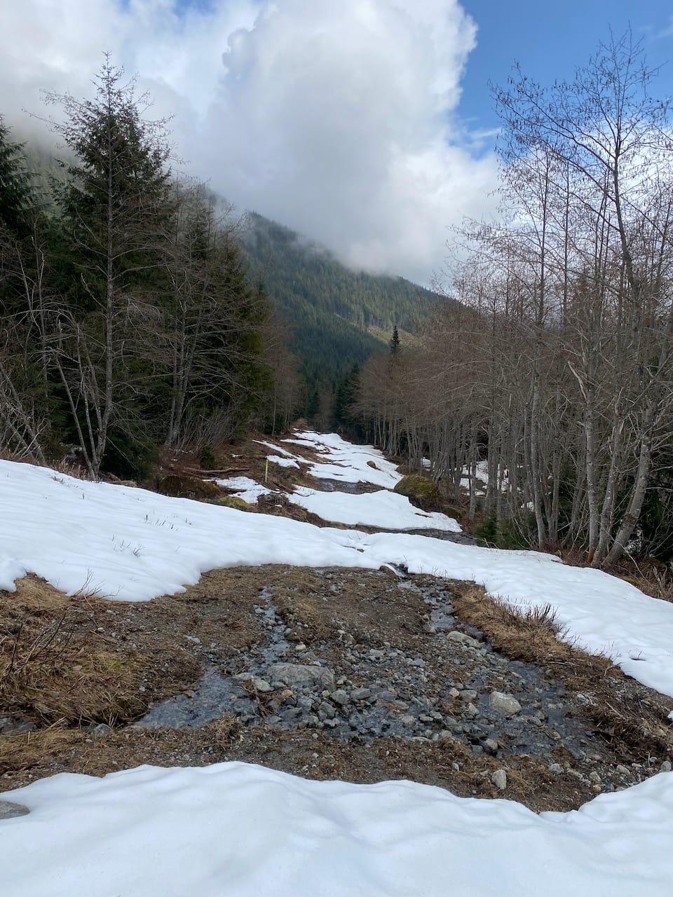 I kept walking down the road, navigating even larger creek crossings until the snow stopped. There were cliffs all around me, and in the distance I could see the mountains on the other side of the valley, partially hidden in the clouds.