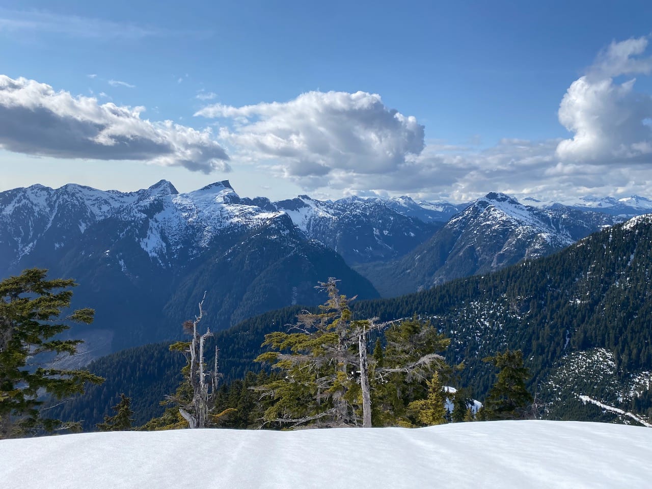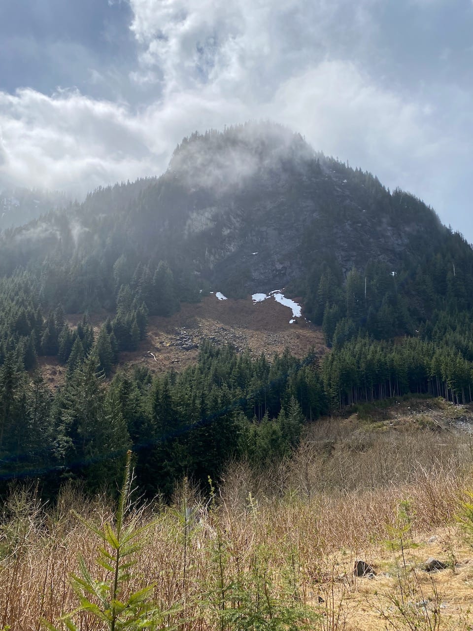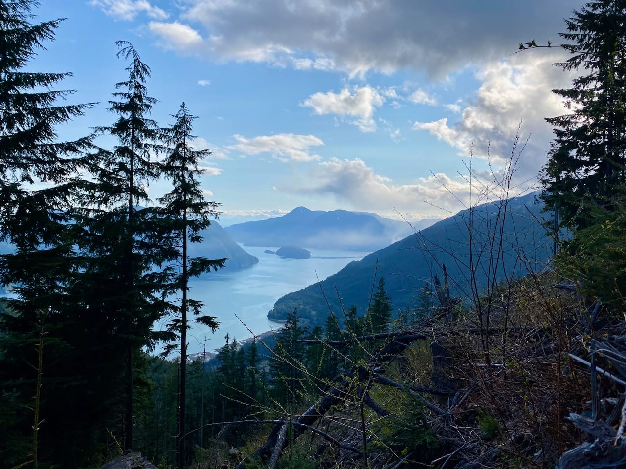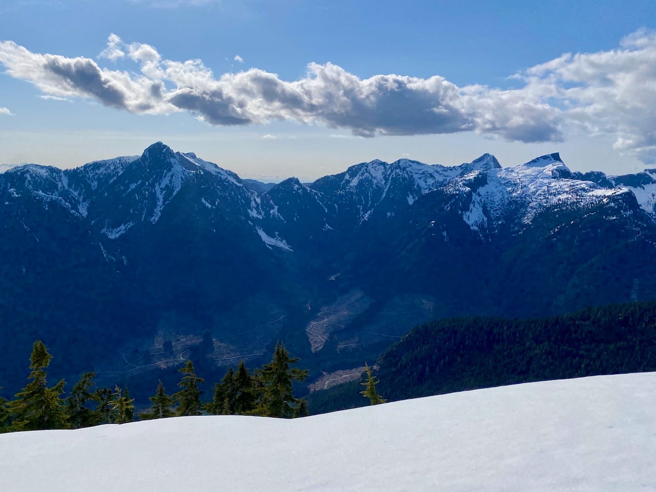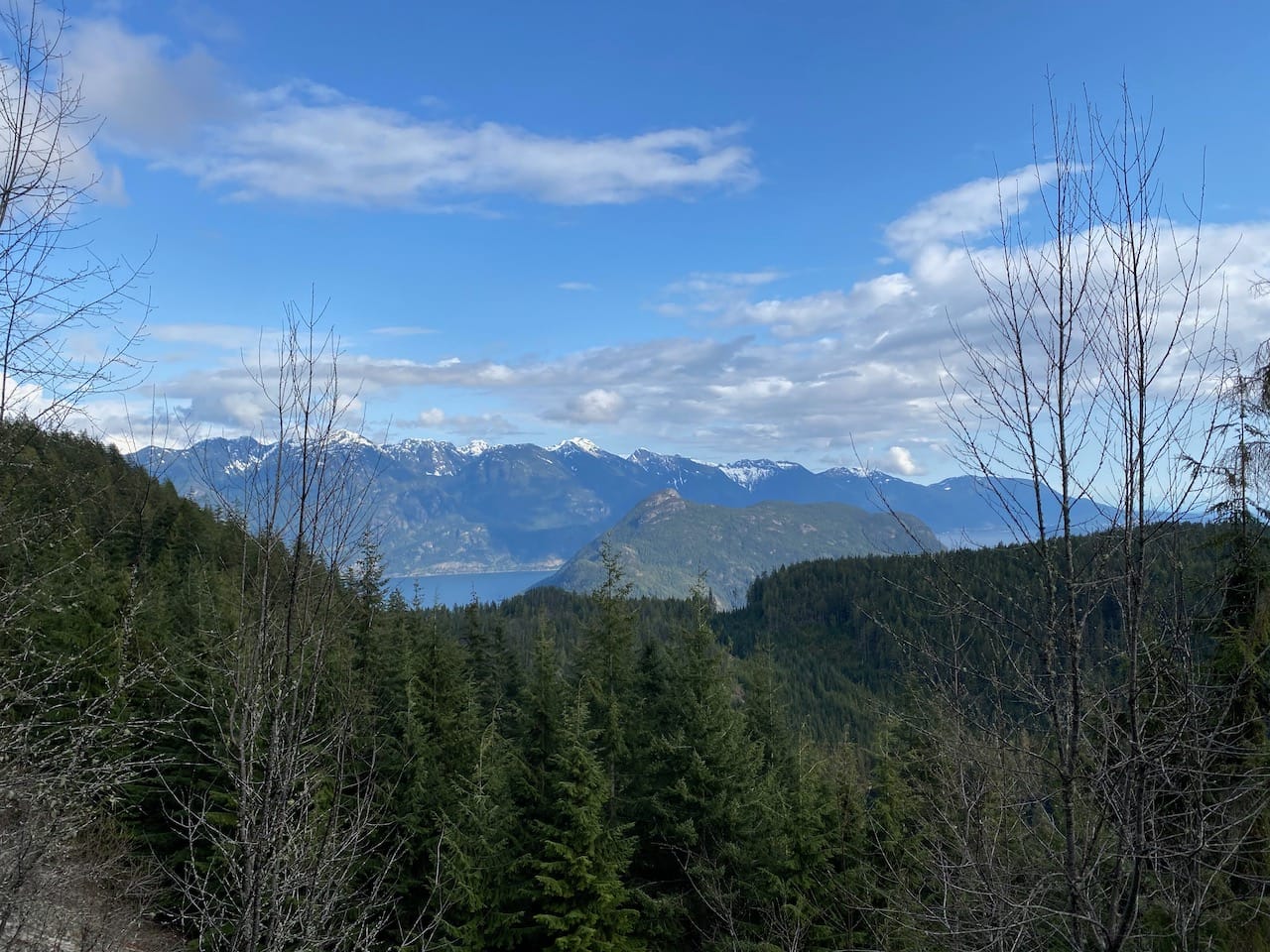 Light rain fell for most of the plod. When I’d gained some altitude, the clouds cleared, revealing some views across Howe Sound to the North Shore mountains.