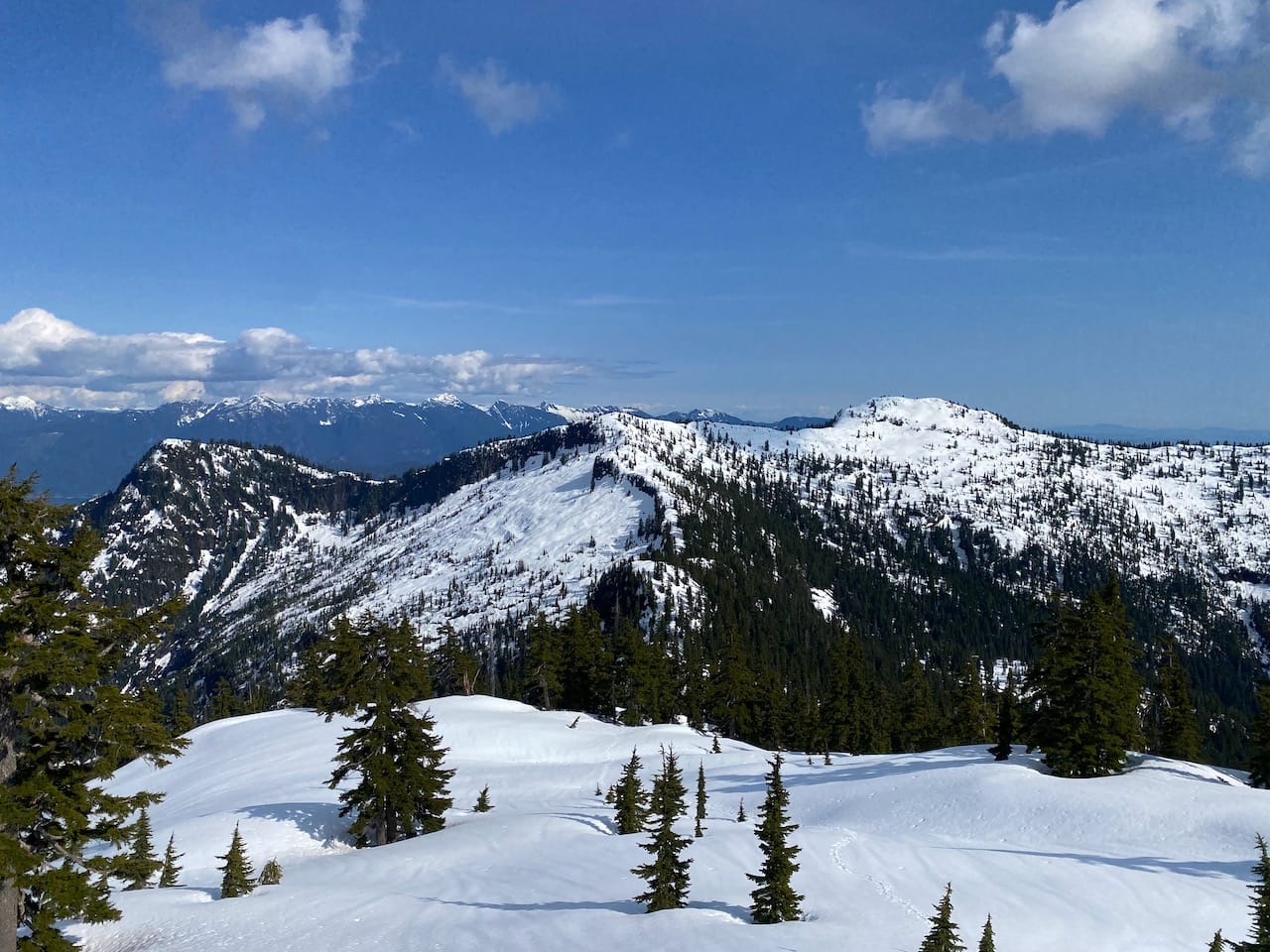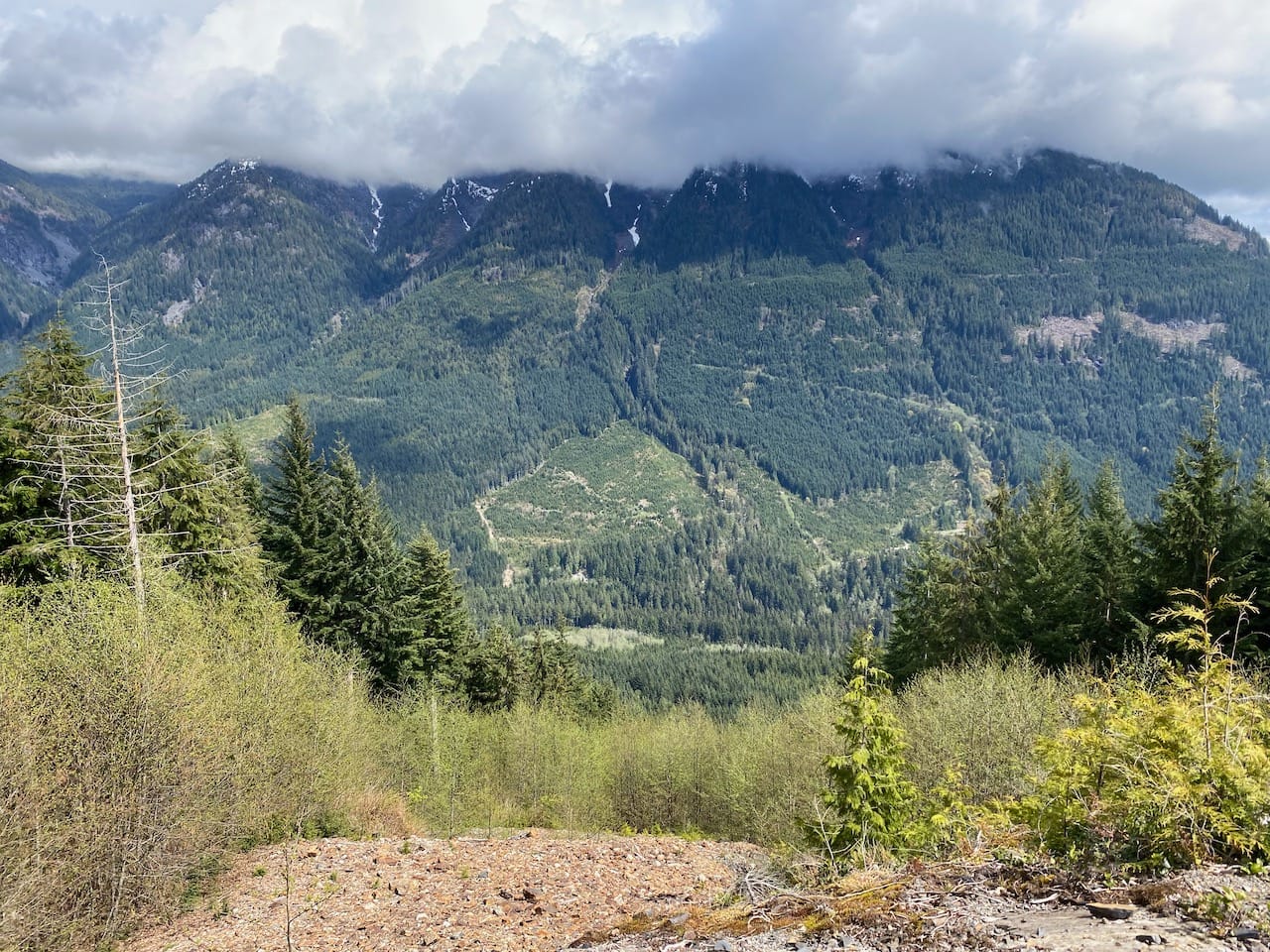 I took a quick detour to Box Canyon Peak, the peak to the north of the pass. Francis Bailey’s trip report was useful here. The summit of the peak is a wide, treed plateau, but it offers surprisingly good viewpoints in several directions, especially into the Rainy River Valley. Panther, Tetrahedron, and Rainy Peaks towered over the scene. This would be a nice ski touring destination earlier in the season when the creek crossings on the FSR are covered.