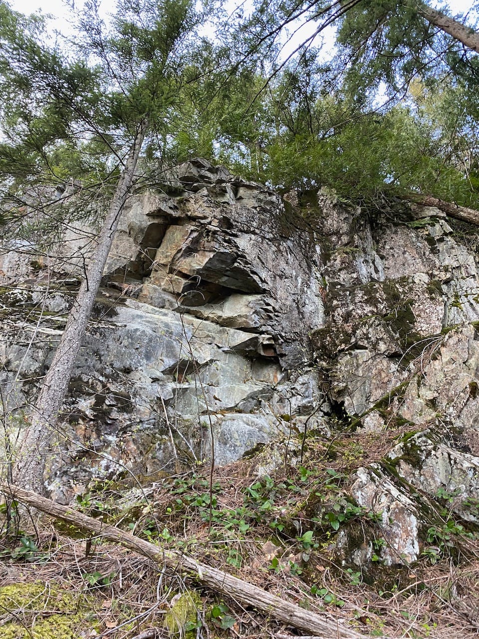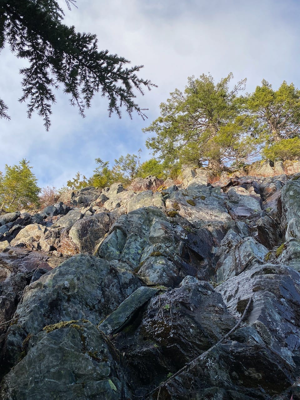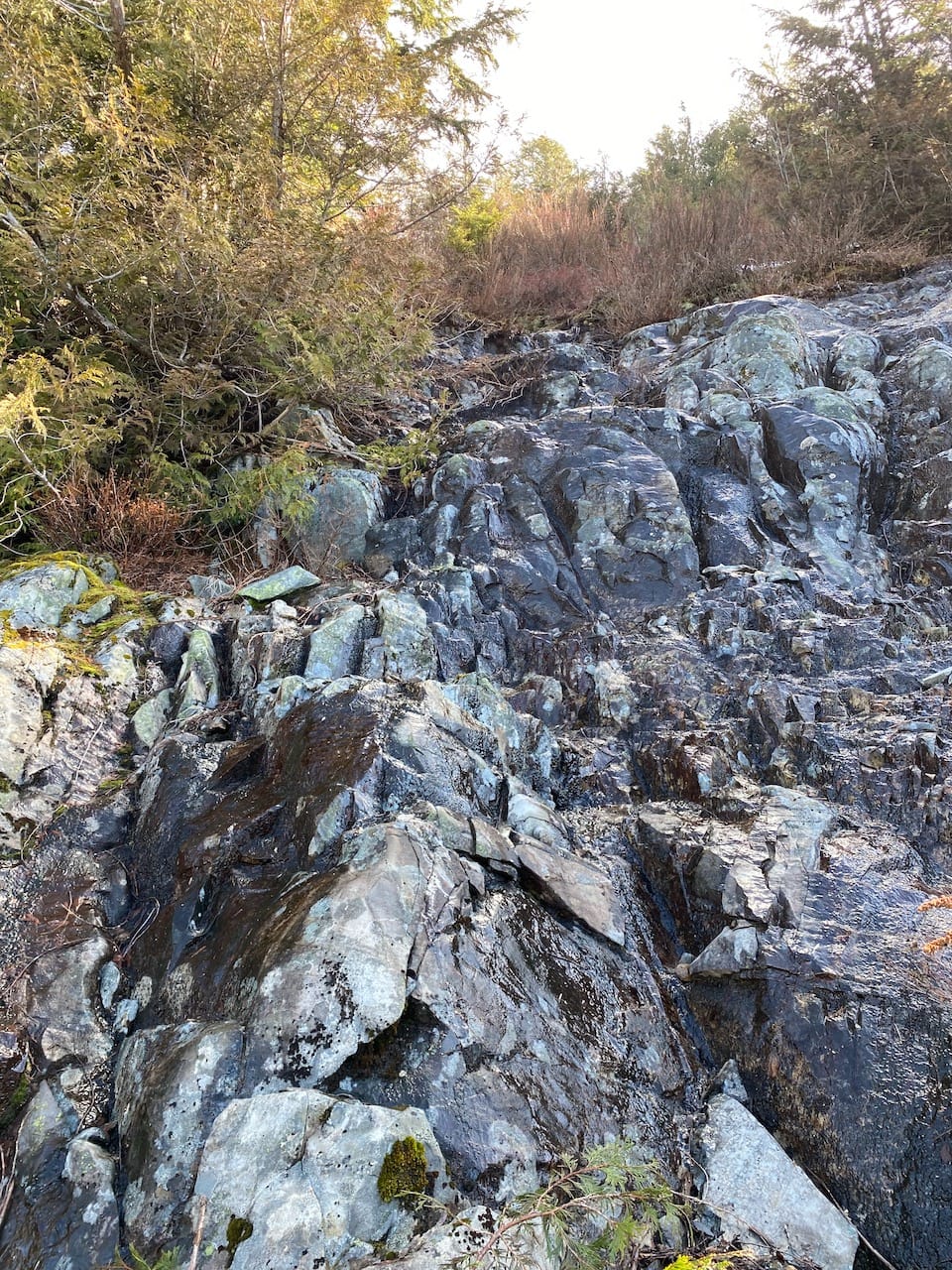 When I planned this trip, it seemed like the least steep route would involve leaving the FSR at 650 metres. However, a large cliff band blocked my progress almost immediately after leaving the road. I navigated through some thick bushes to reach a precarious boulder field, which took me around the cliffs. (I found a better route on the way down.)