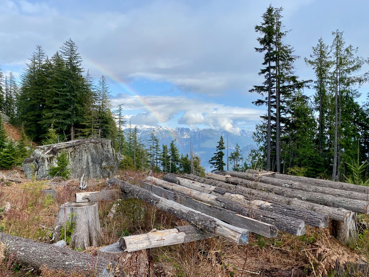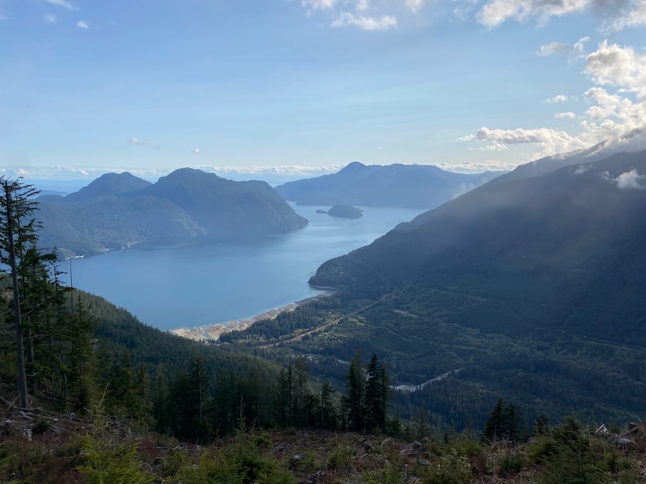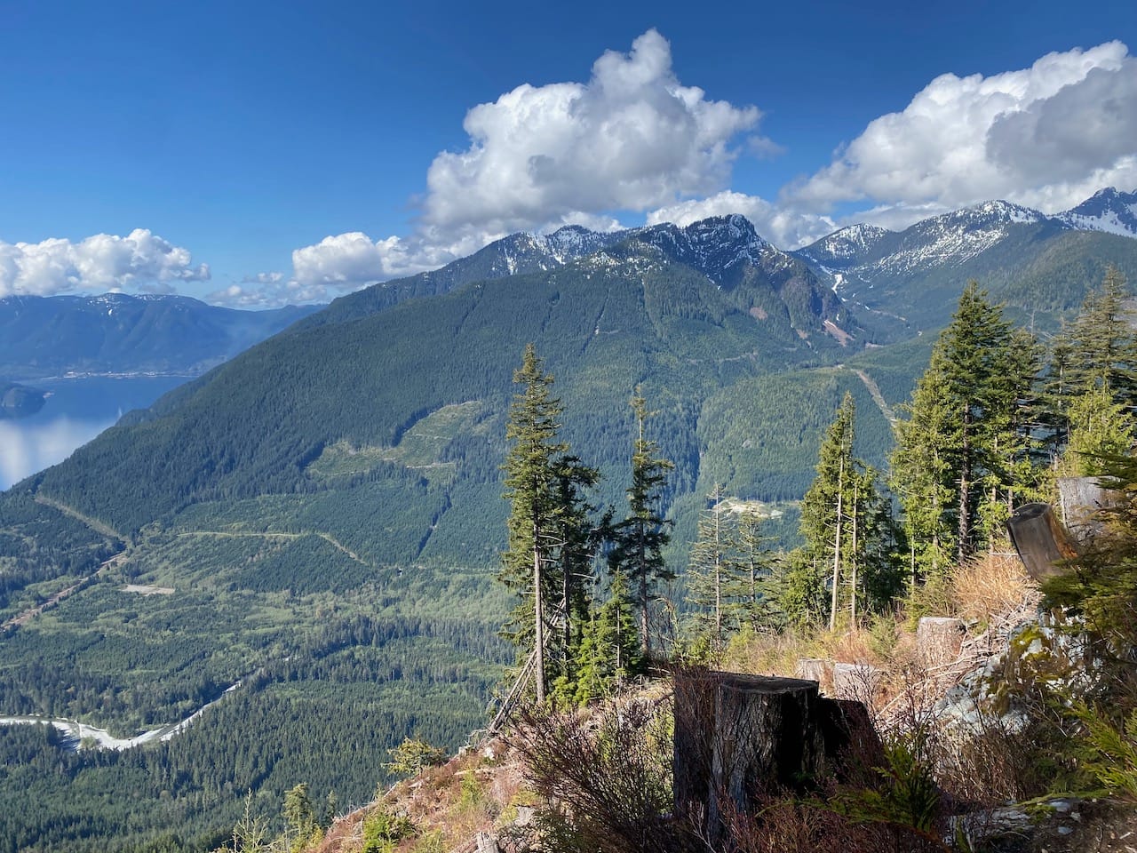 Eventually, I reached the base of another cliff. I looked for a bypass to the west and ended up in a relatively recent cutblock. There was a wooden helicopter pad there, likely used to fly in tree planters. The views of Howe Sound were quite nice.