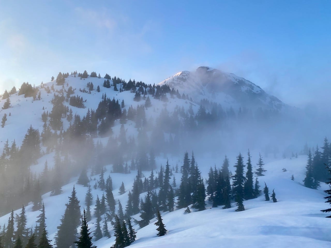 I had finally reached the subalpine zone, and the snowshoes went back on. After a bit more ascending, the trees began to thin, and some views could be seen through the mist.