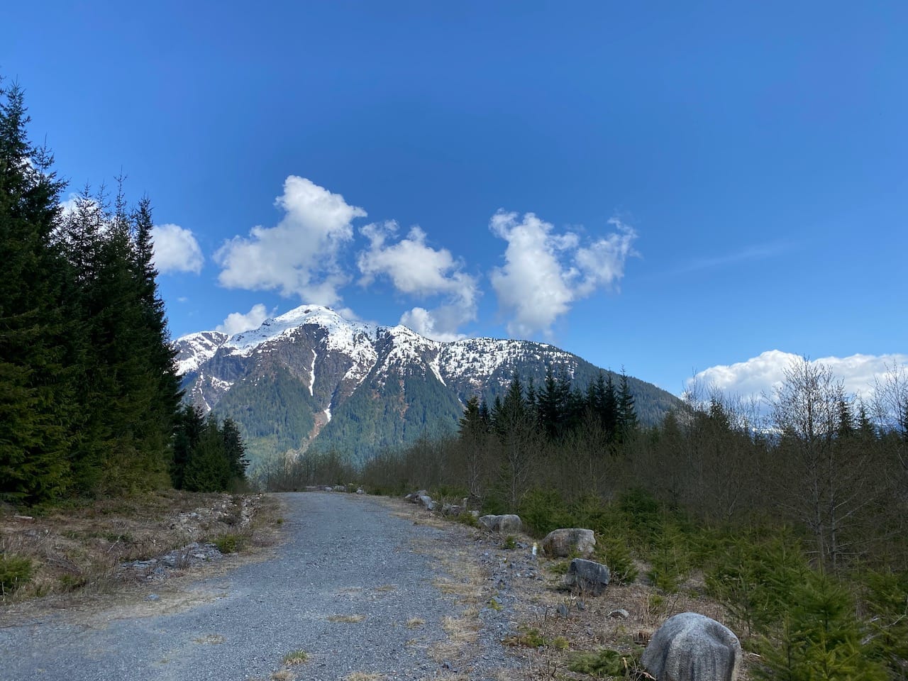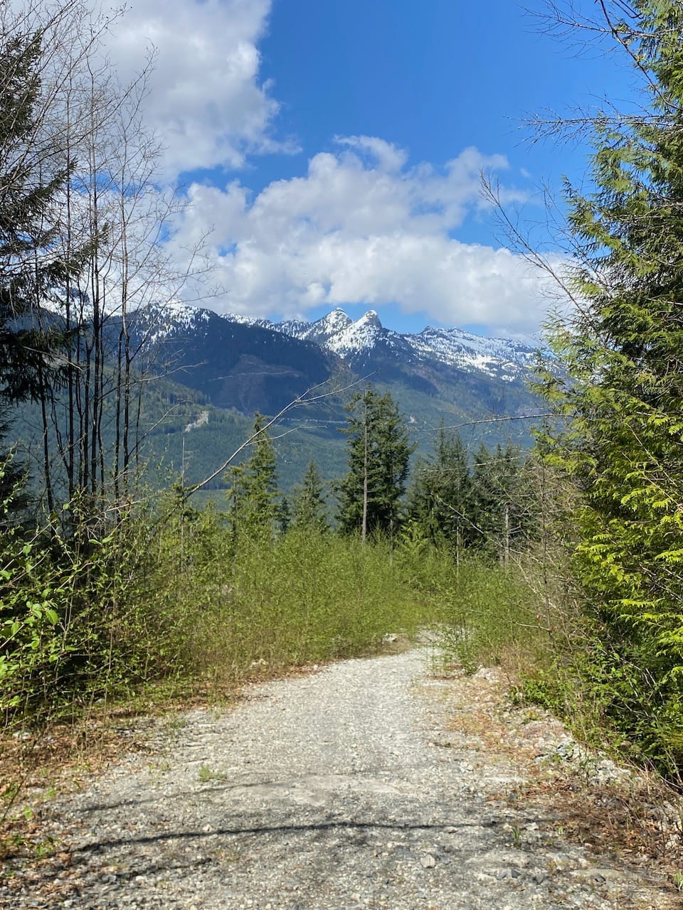 Another FSR plod began. All around me, grouse constantly made “whump-whump-whump” sounds. Through the trees I saw glimpses of the mountains to the west of McNab Creek, especially the McNab Lions.