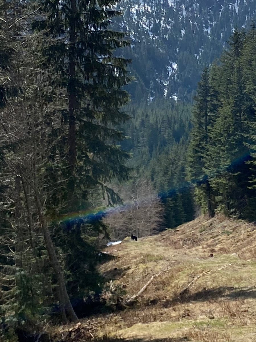 At one point I saw something that was the size, shape, and colour of a cougar, but upon further inspection turned out to be a large orange rock from one of the abandoned quarries. Another time, I heard a large animal in the forest, and looked up to see a massive herd of elk running across the road. Near the snowline my way was blocked by a bear, but I made my presence known with a firm voice and it moved out of the way.
