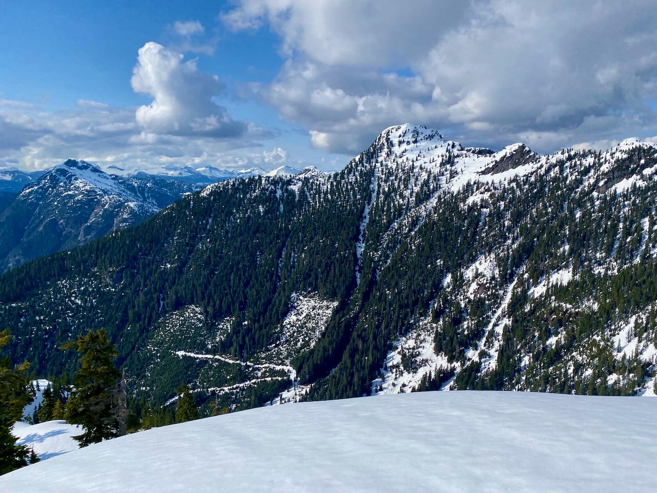 Around 940 metres, I left the FSR and began ascending the pipeline right-of-way. It was a bit of a grind, but the snow was well-consolidated, and I soon reached Box Canyon Pass.