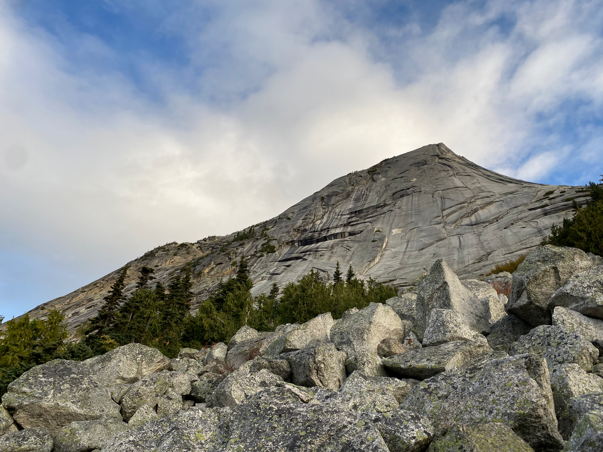 Past the memorial, the grind began as the trail rose several hundred metres in less than two kilometres. After a long stretch in the forest, the trail emerged into a boulder field, offering a good view of the granite wall. Some mild scrambling was needed past this point.