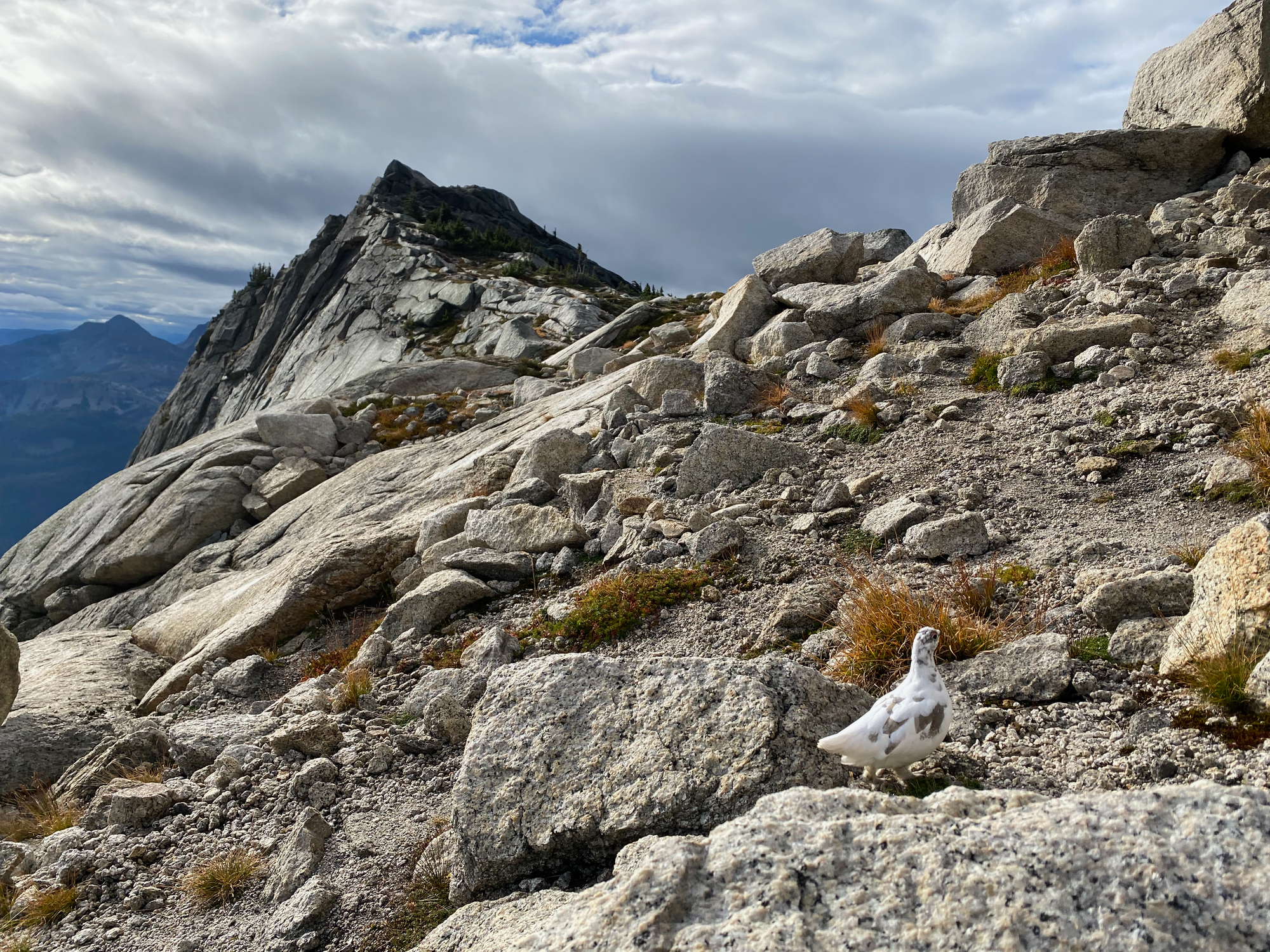 After a while the trail reaches a meadow between Nak Peak and the two summits of Yak Peak. While there I ran into a flock of white grouse.